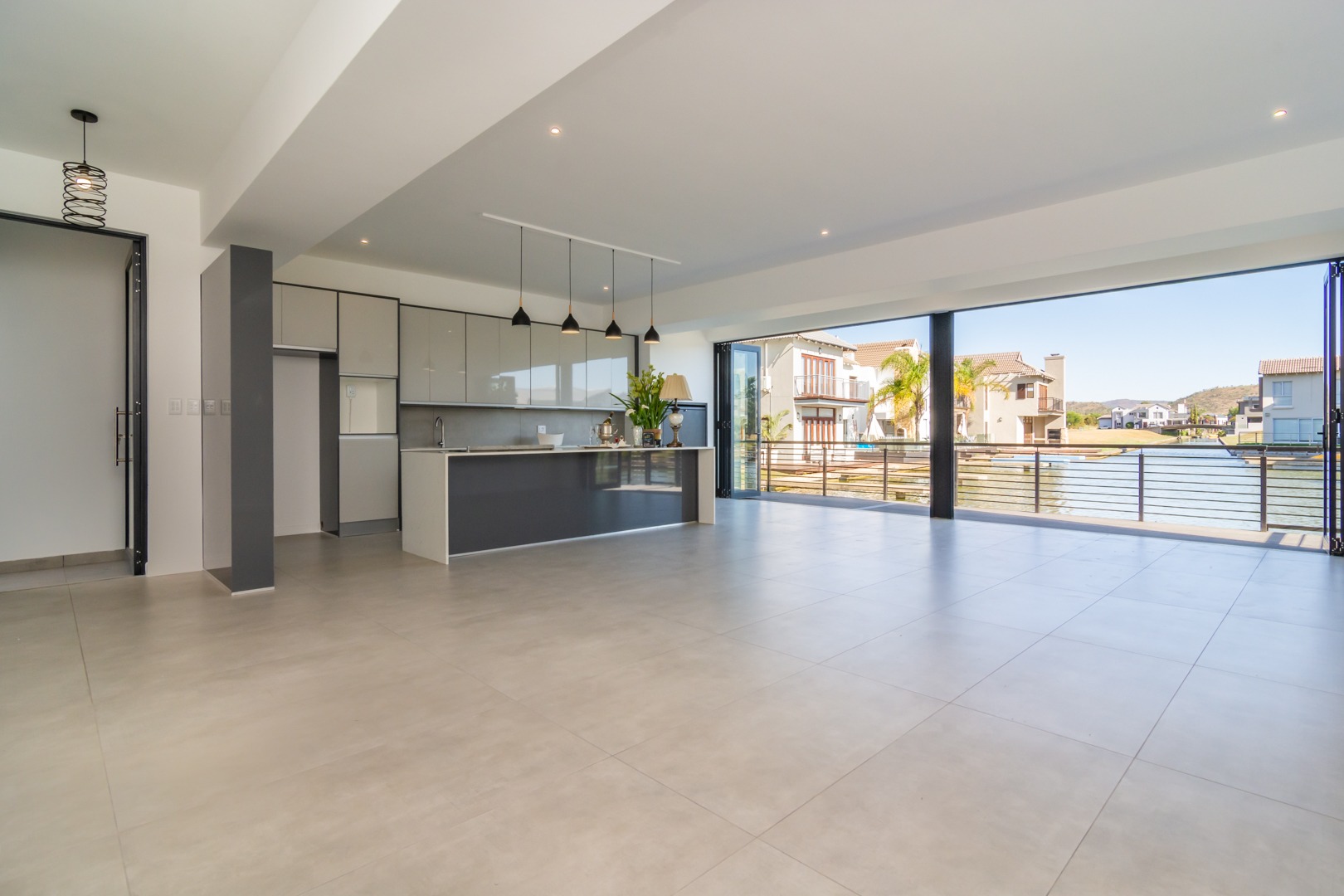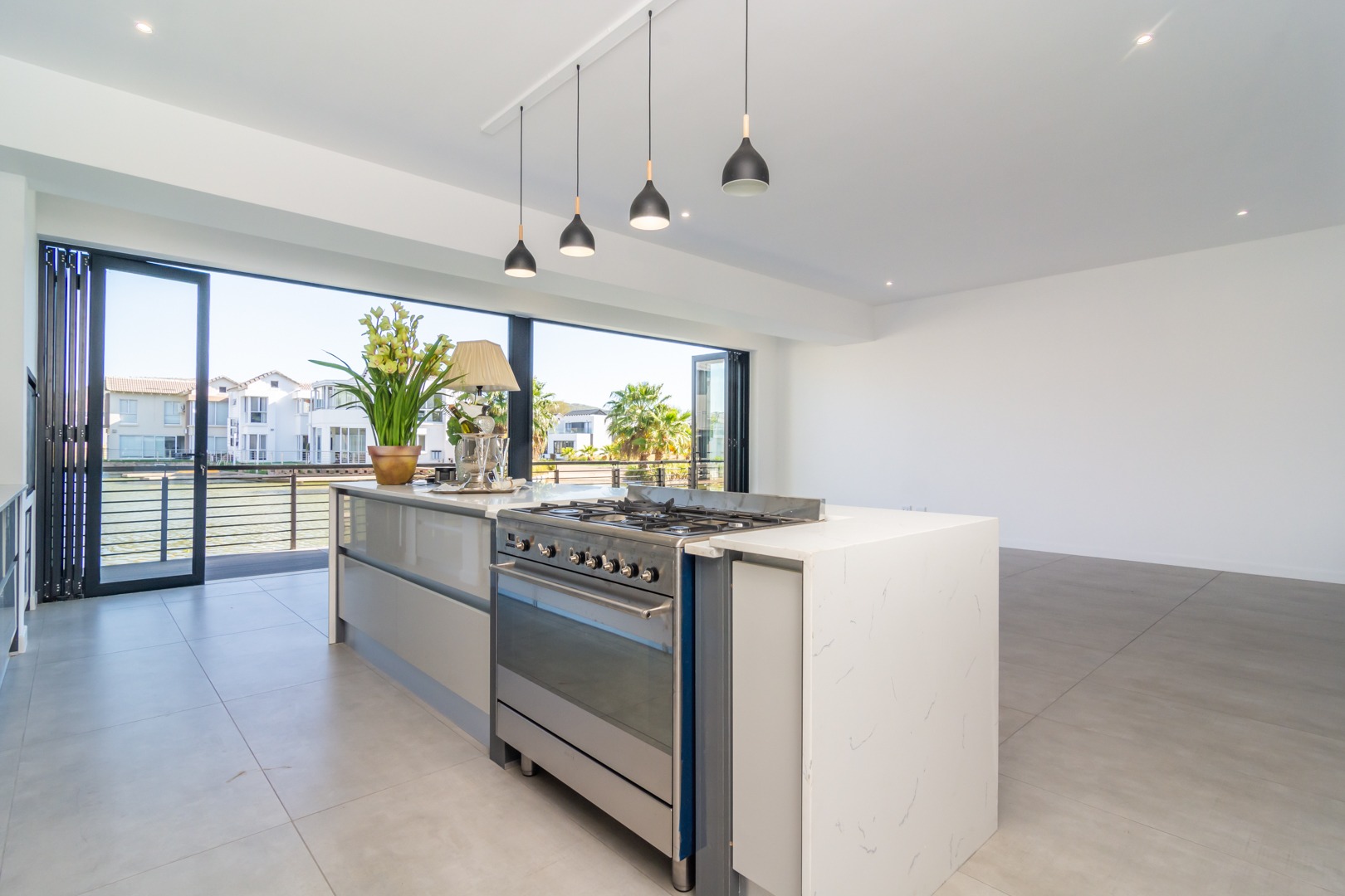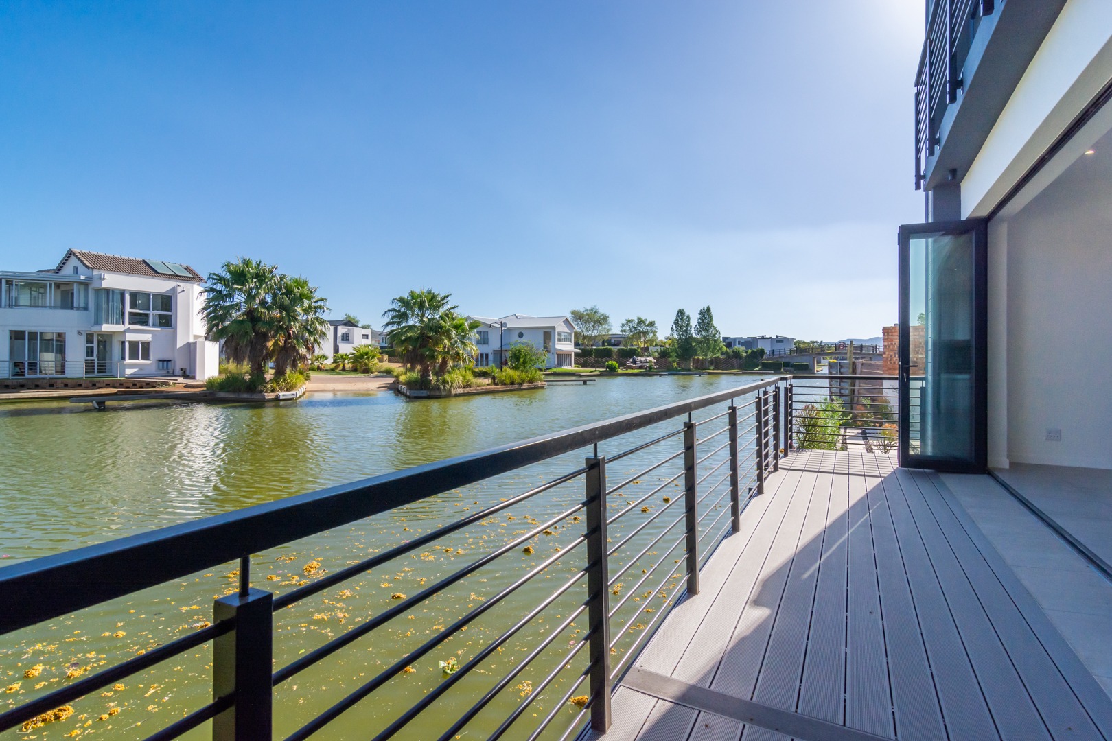 Timeless design with aluminium windows and stacking doors opening out to the 6.5 km of navigable waterways.
