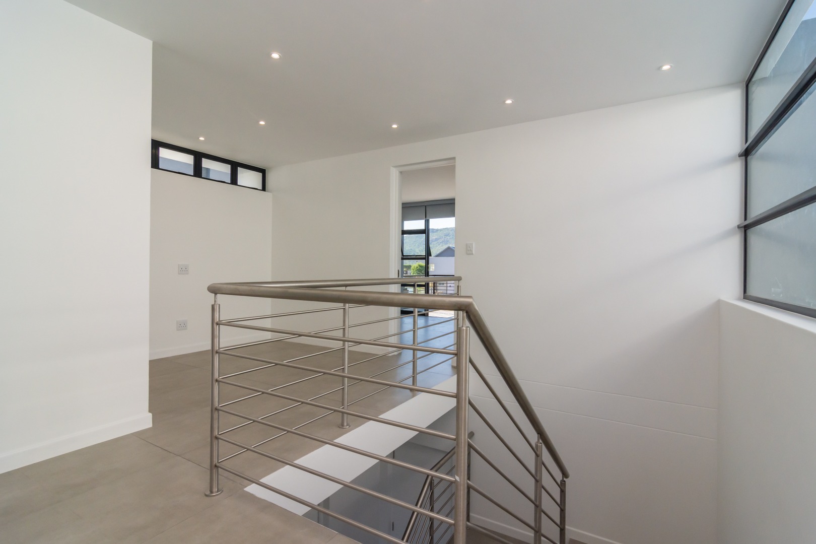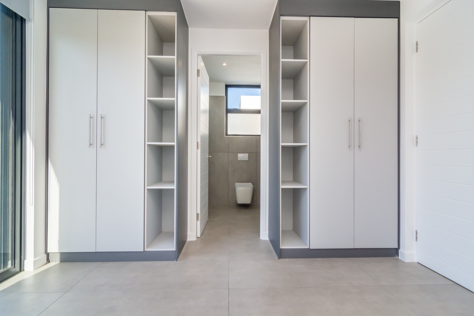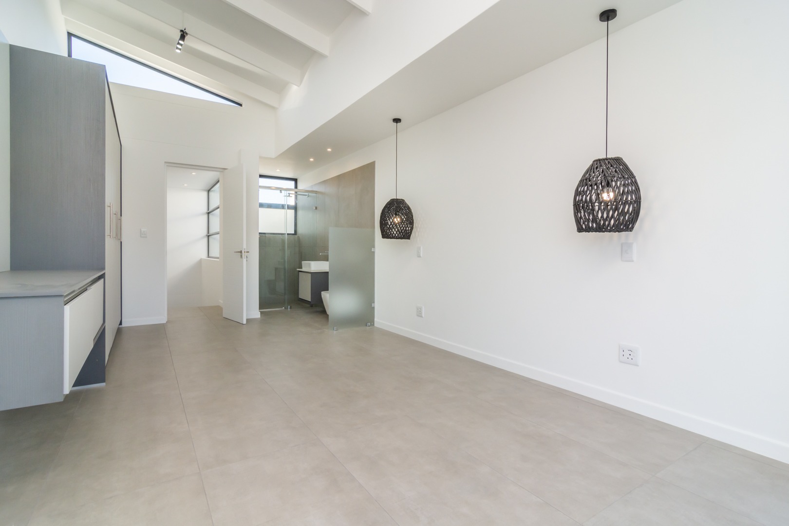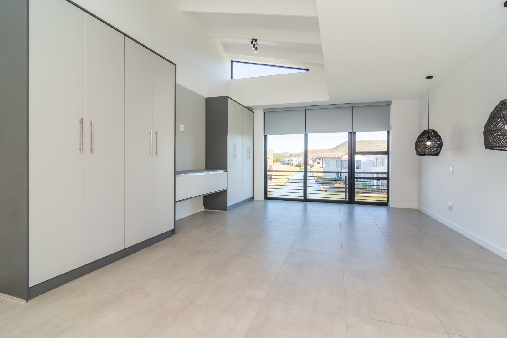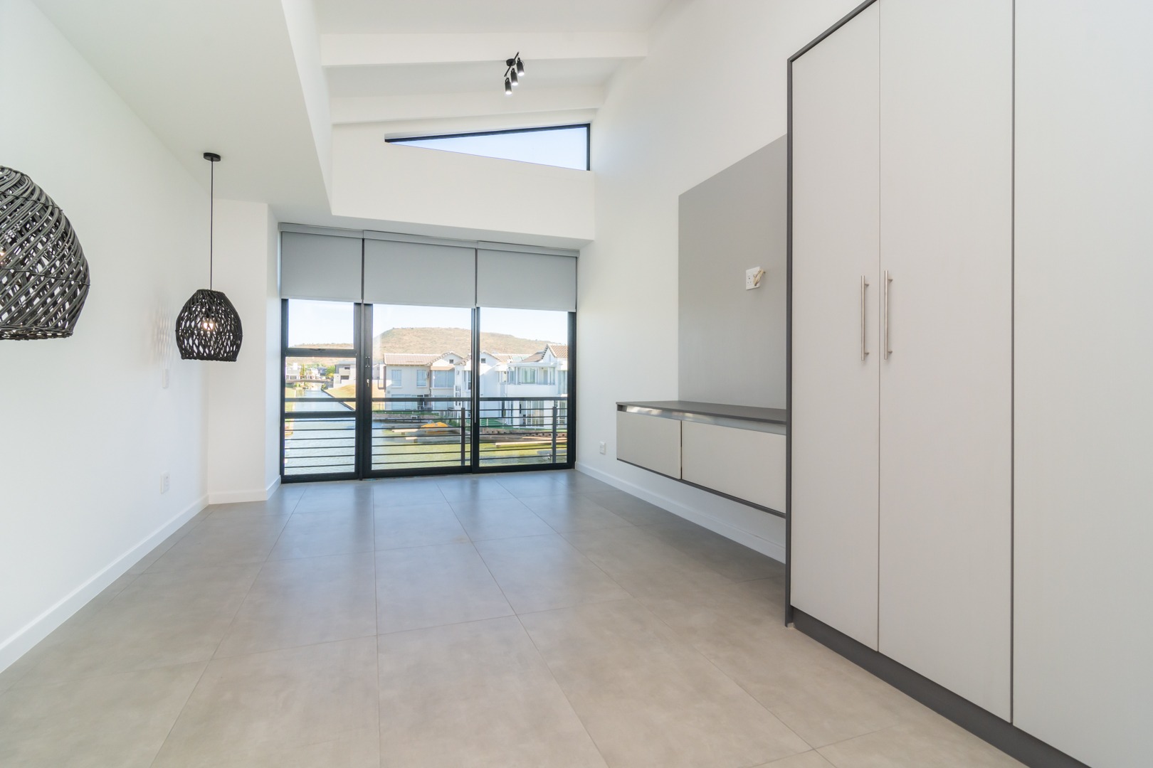 Custom light grey blinds fitted throughout.
