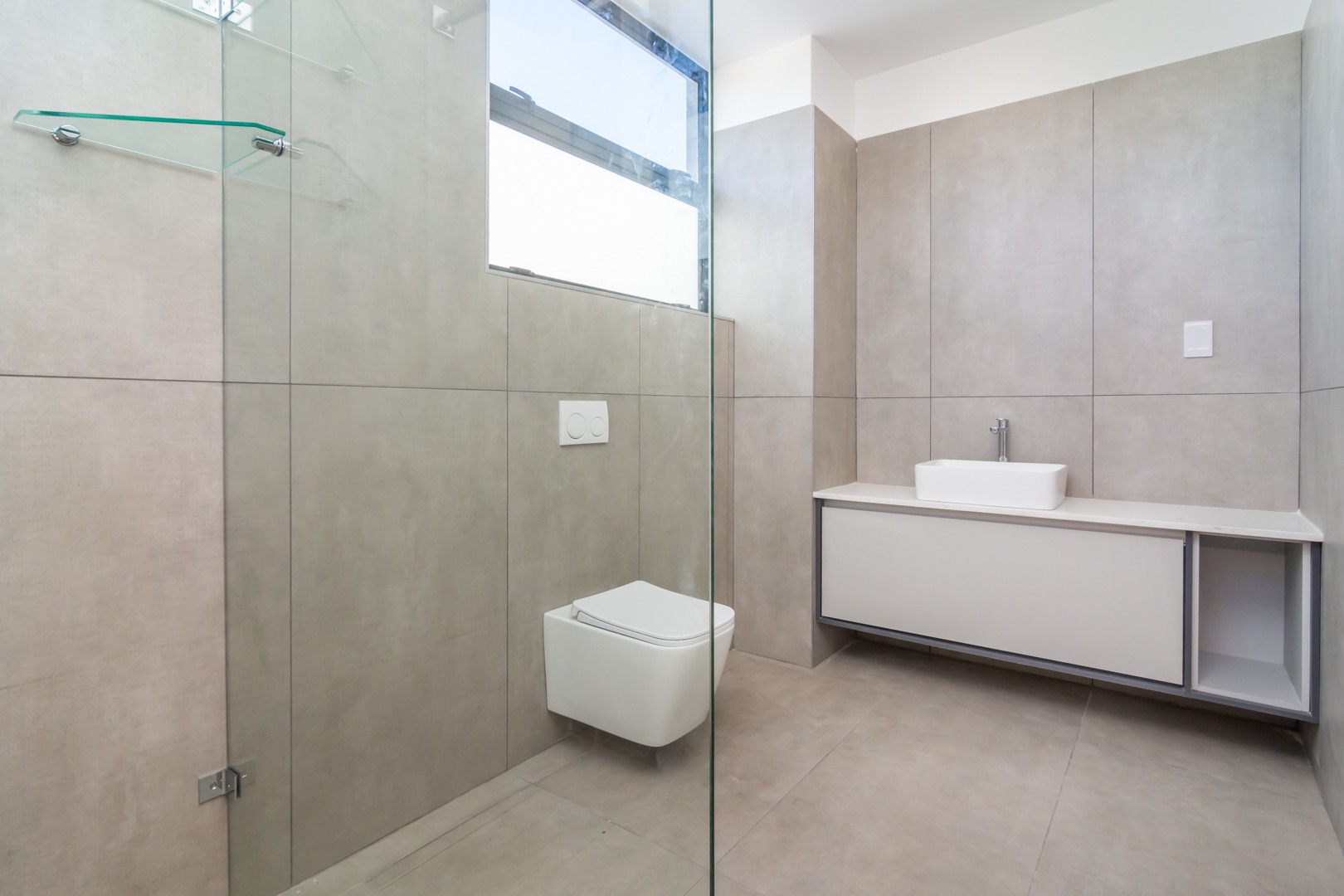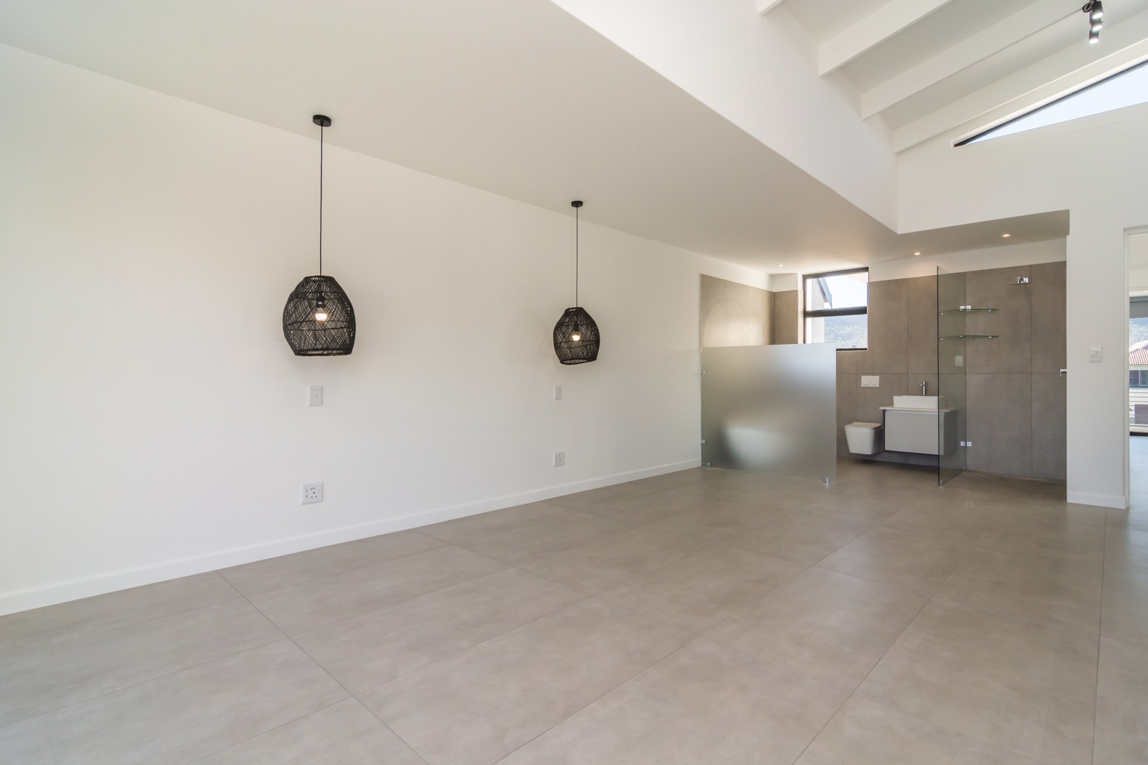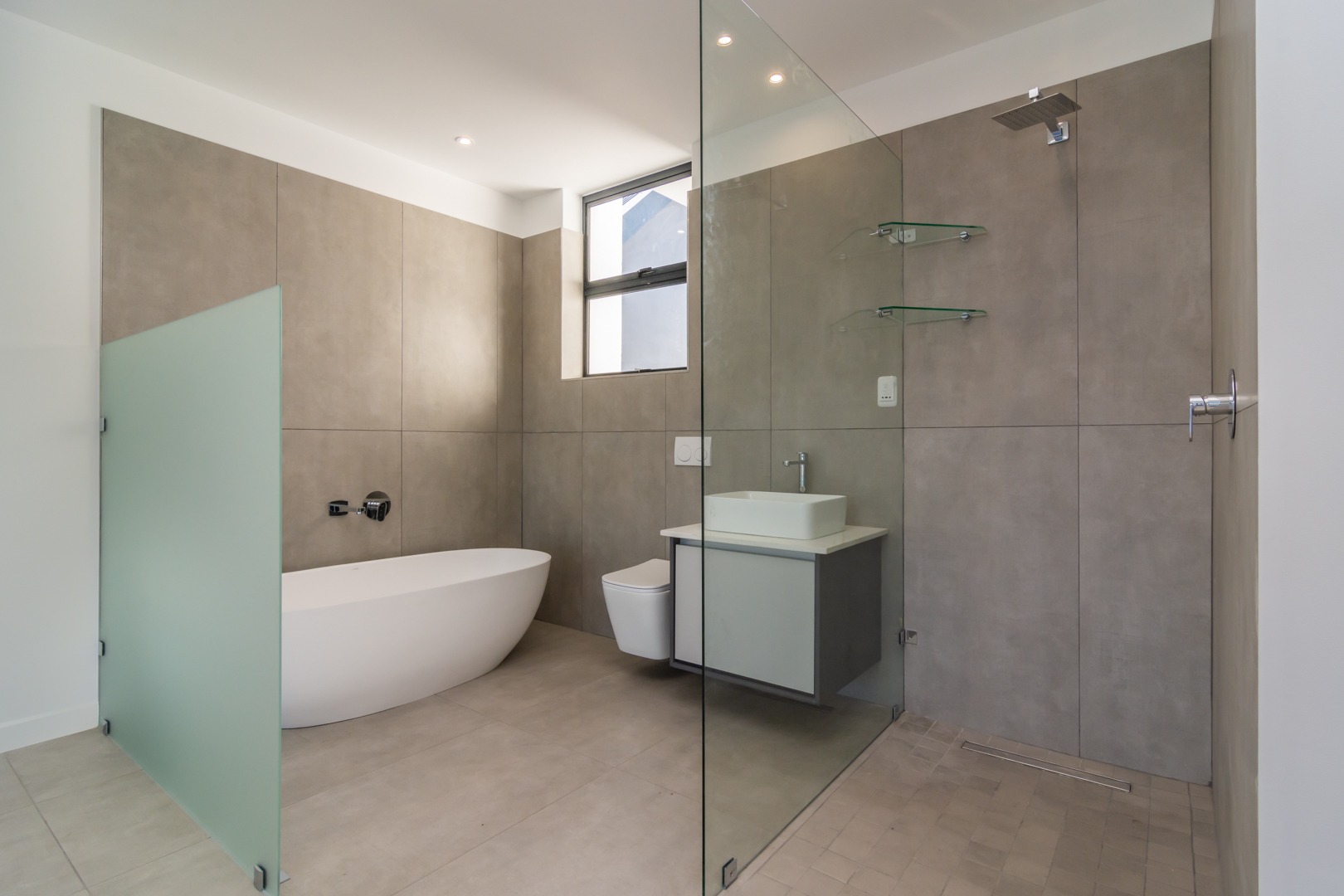 Italian geo taps, mixers, and low water flush (Geberit) concealed flushing toilet systems. Ultra-thin porcelain freestanding, artic white bath and sanitaryware throughout. Walk-in showers.