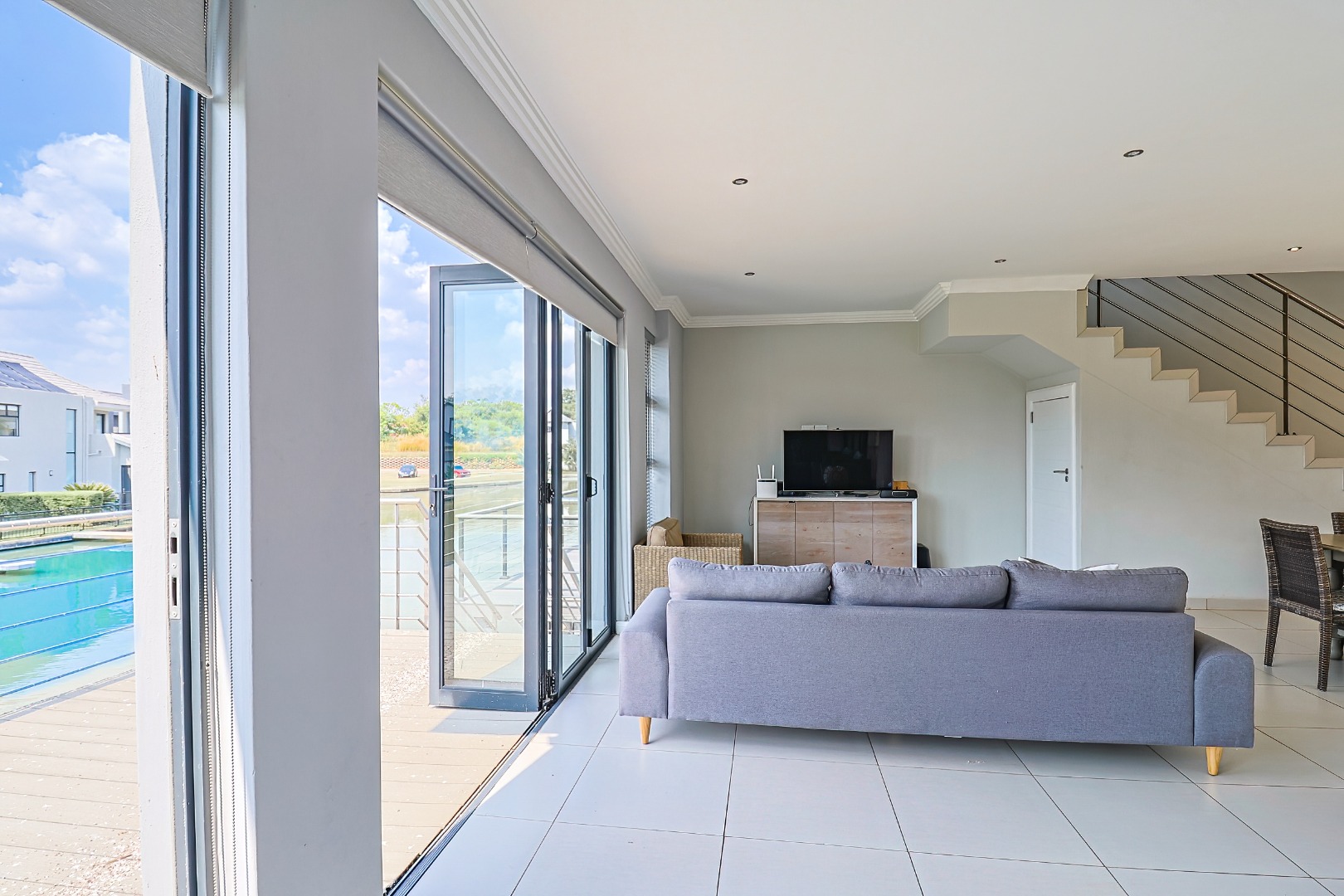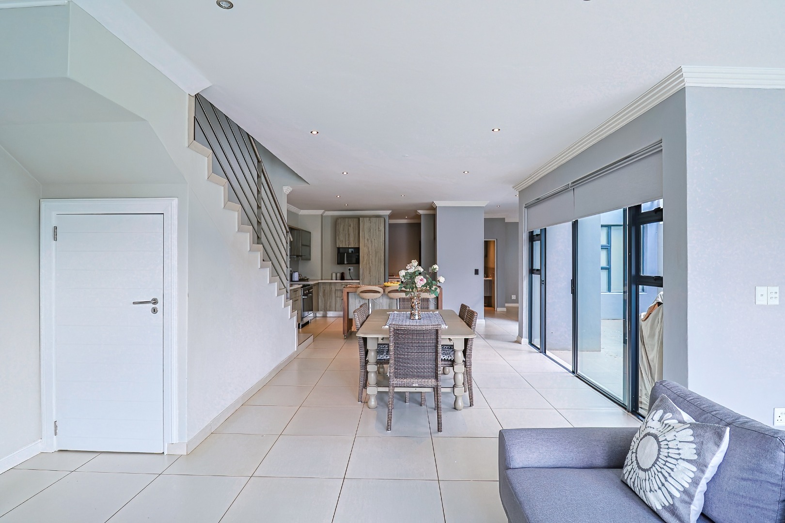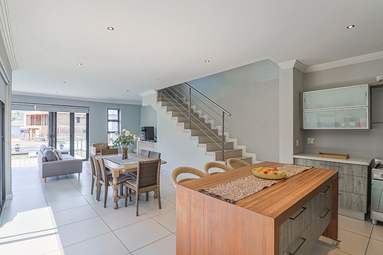 This sophisticated residential offering presents a meticulously designed interior spanning 258.00 sqm, characterised by an expansive open-plan layout that seamlessly integrates the living, dining, and kitchen areas. Large bi-fold glass doors invite abundant natural light and facilitate an effortless transition to the outdoor spaces. The contemporary kitchen is a focal point, featuring light wood-grain cabinetry, elegant countertops, a spacious island with a breakfast bar, integrated appliances including a gas range, and a dedicated scullery with a dishwasher and pantry. Modern finishes, including sleek tiled flooring, a stylish slatted accent wall, and a contemporary staircase, enhance the property's refined aesthetic. Air conditioning ensures optimal climate control.