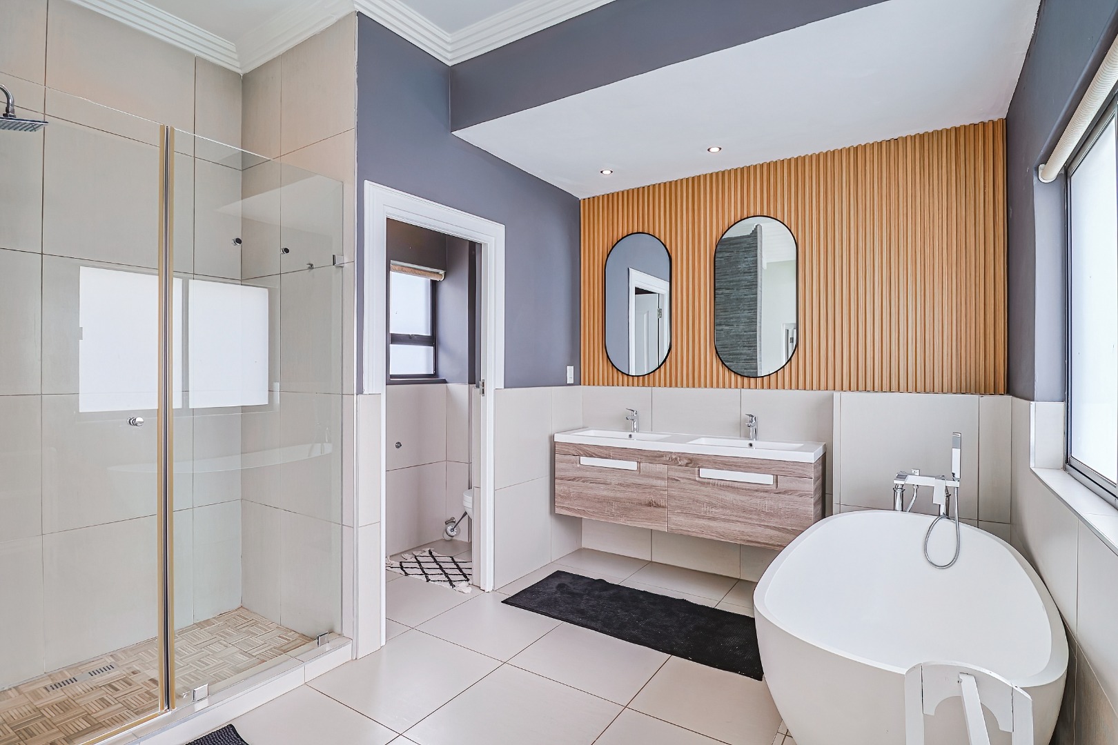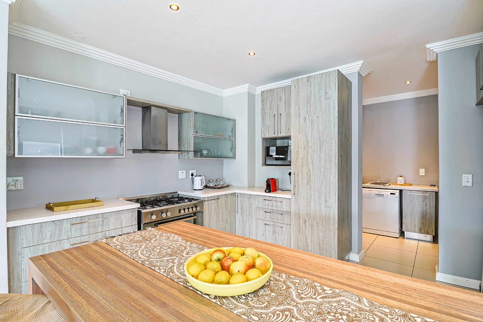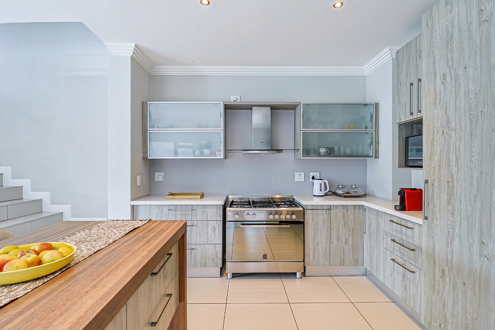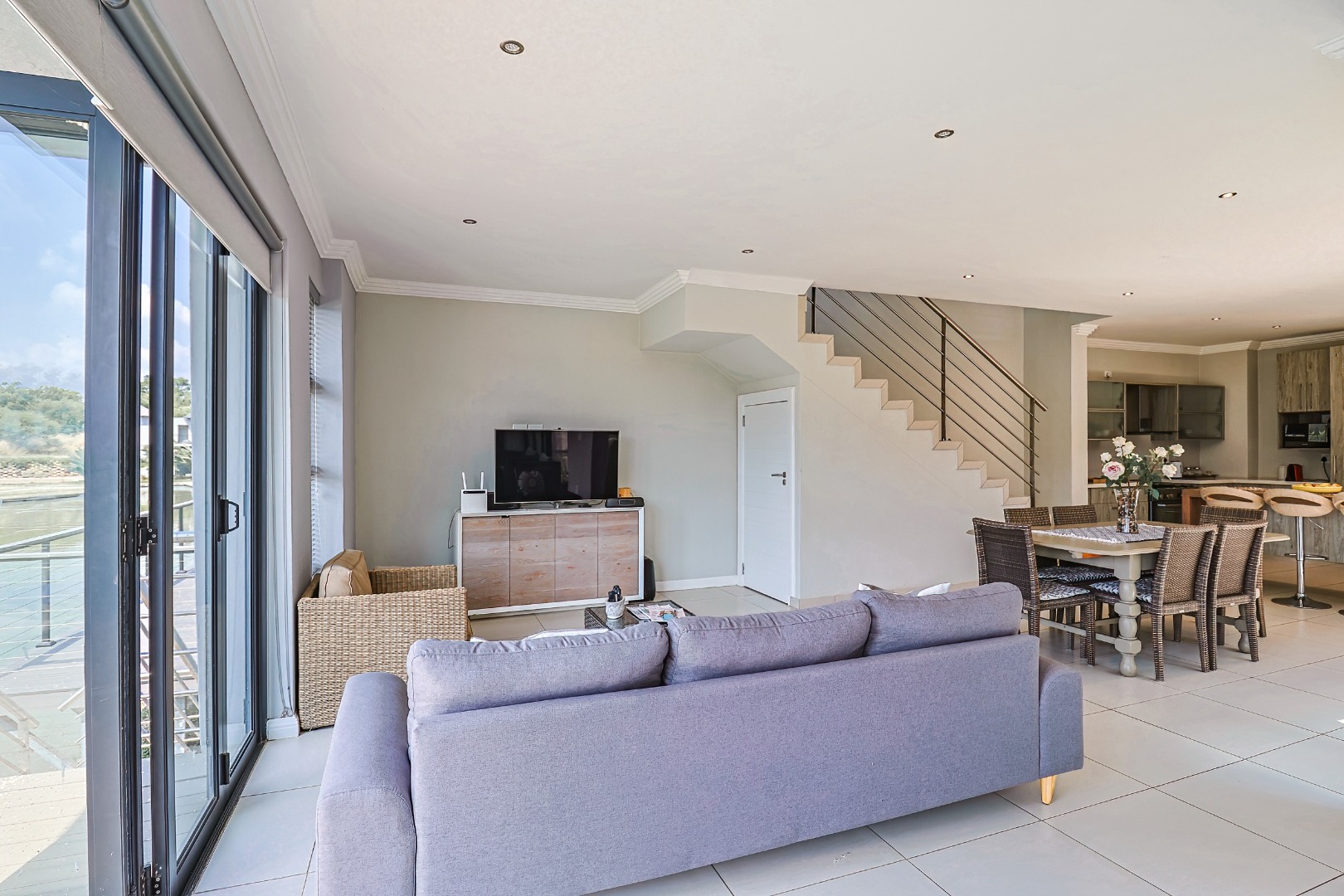 This sophisticated residential offering presents a meticulously designed interior spanning 258.00 sqm, characterised by an expansive open-plan layout that seamlessly integrates the living, dining, and kitchen areas. Large bi-fold glass doors invite abundant natural light and facilitate an effortless transition to the outdoor spaces. The contemporary kitchen is a focal point, featuring light wood-grain cabinetry, elegant countertops, a spacious island with a breakfast bar, integrated appliances including a gas range, and a dedicated scullery with a dishwasher and pantry. Modern finishes, including sleek tiled flooring, a stylish slatted accent wall, and a contemporary staircase, enhance the property's refined aesthetic. Air conditioning ensures optimal climate control.