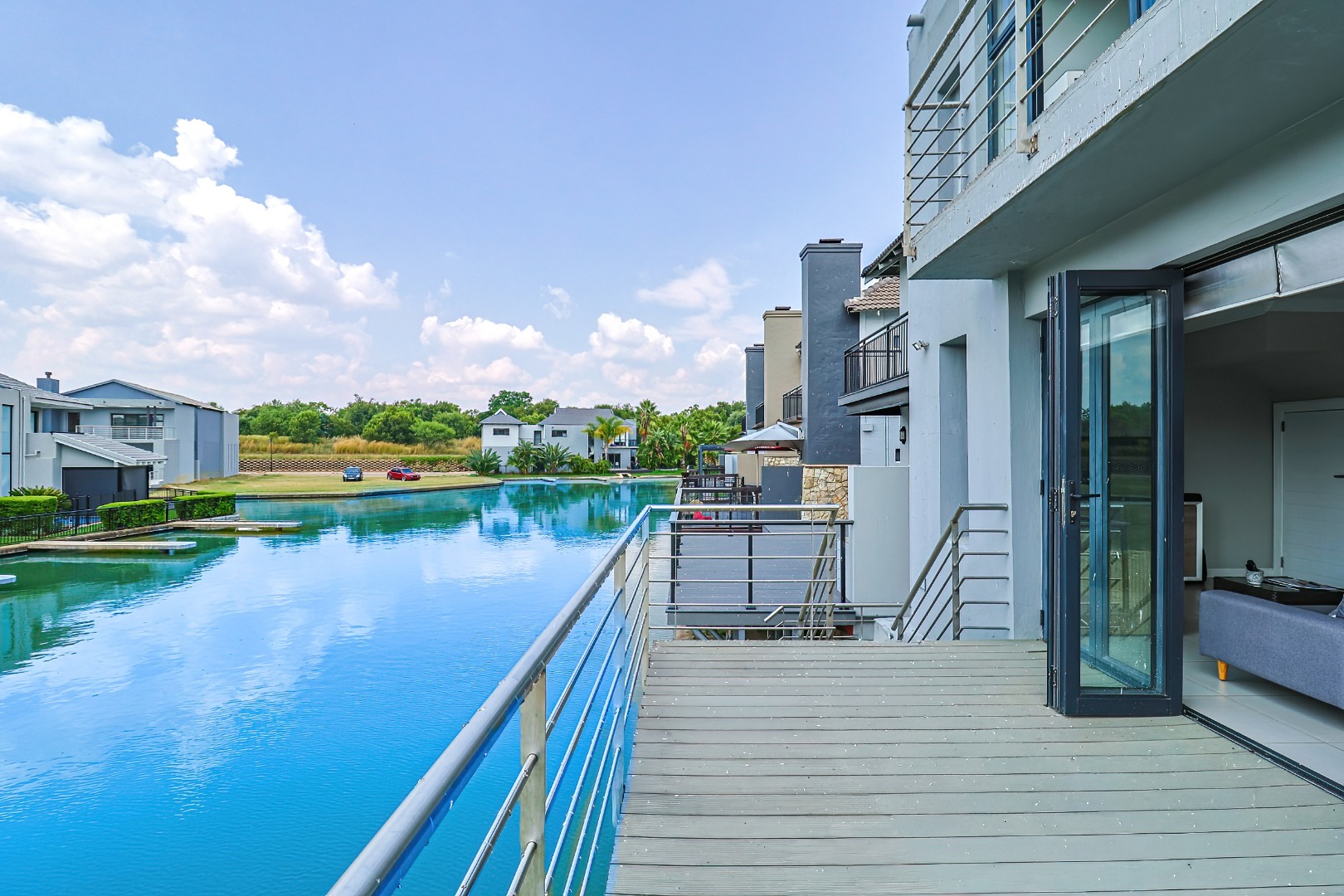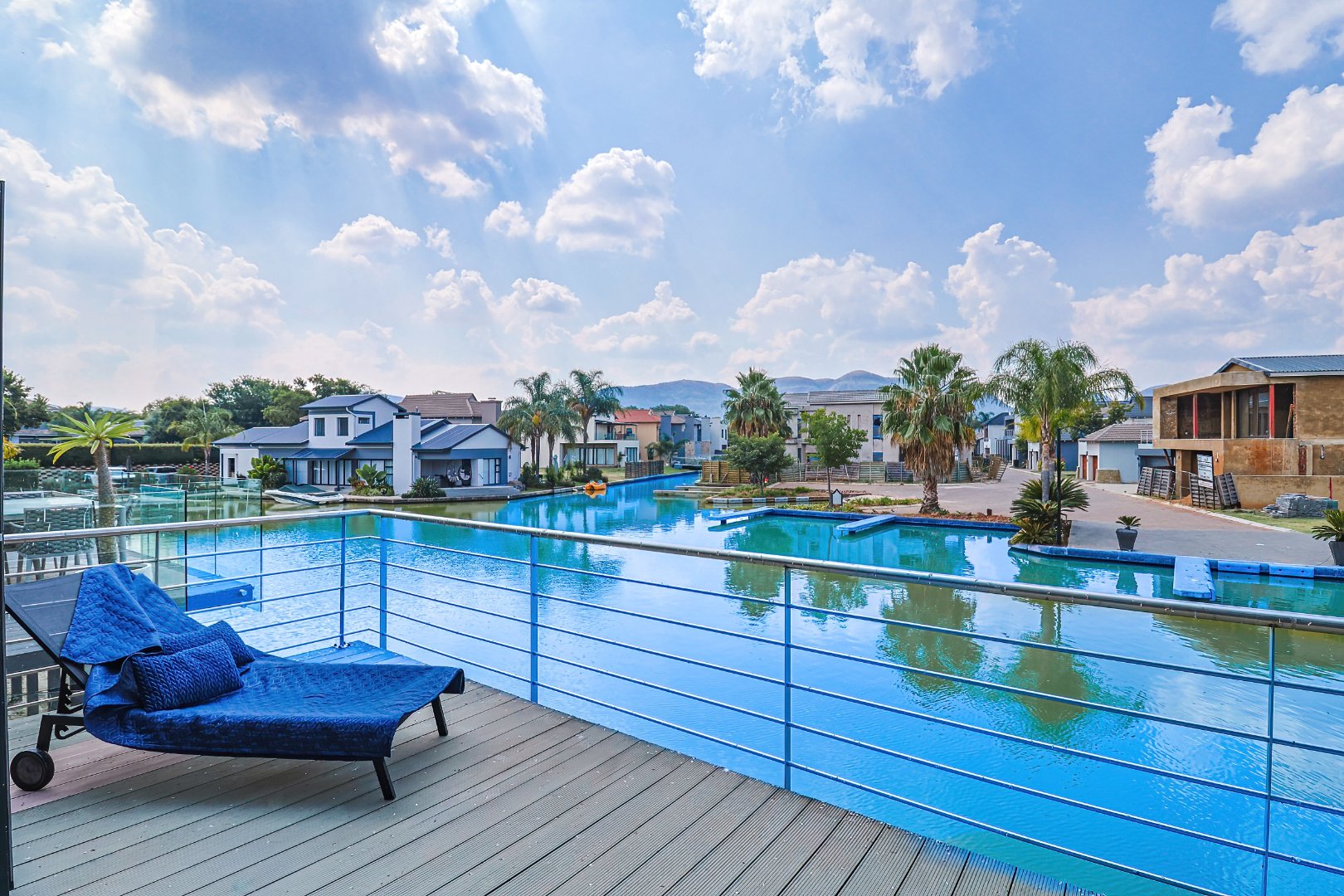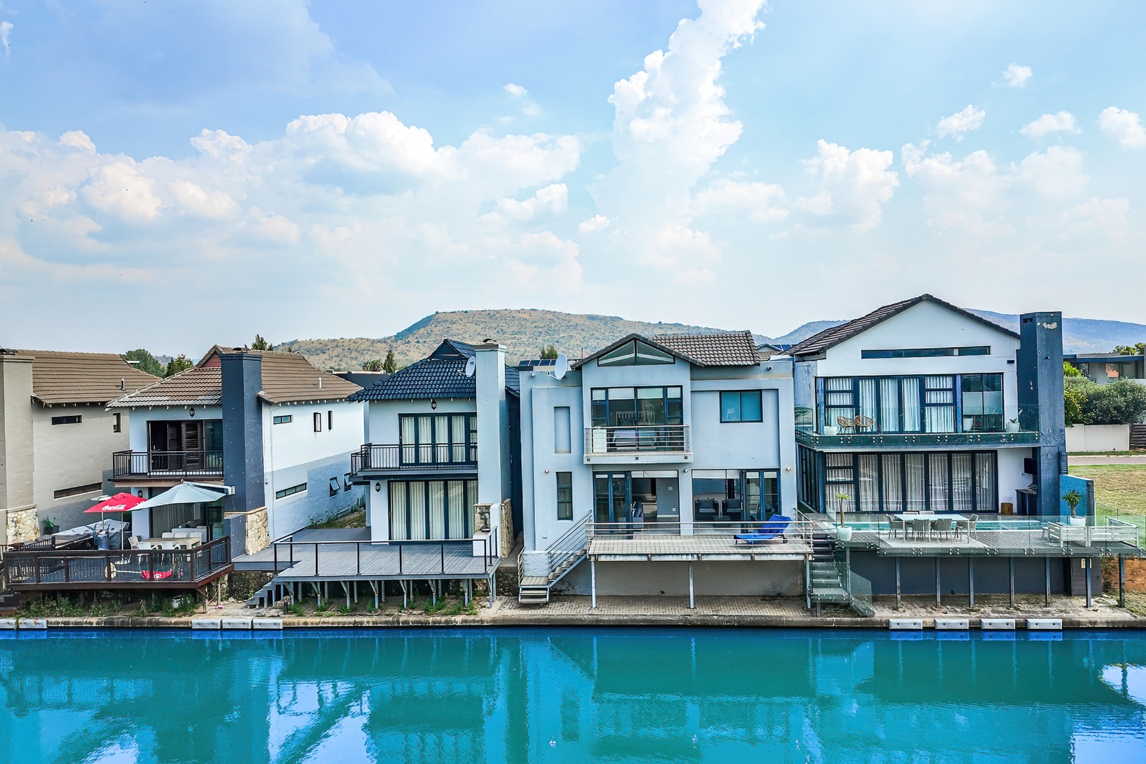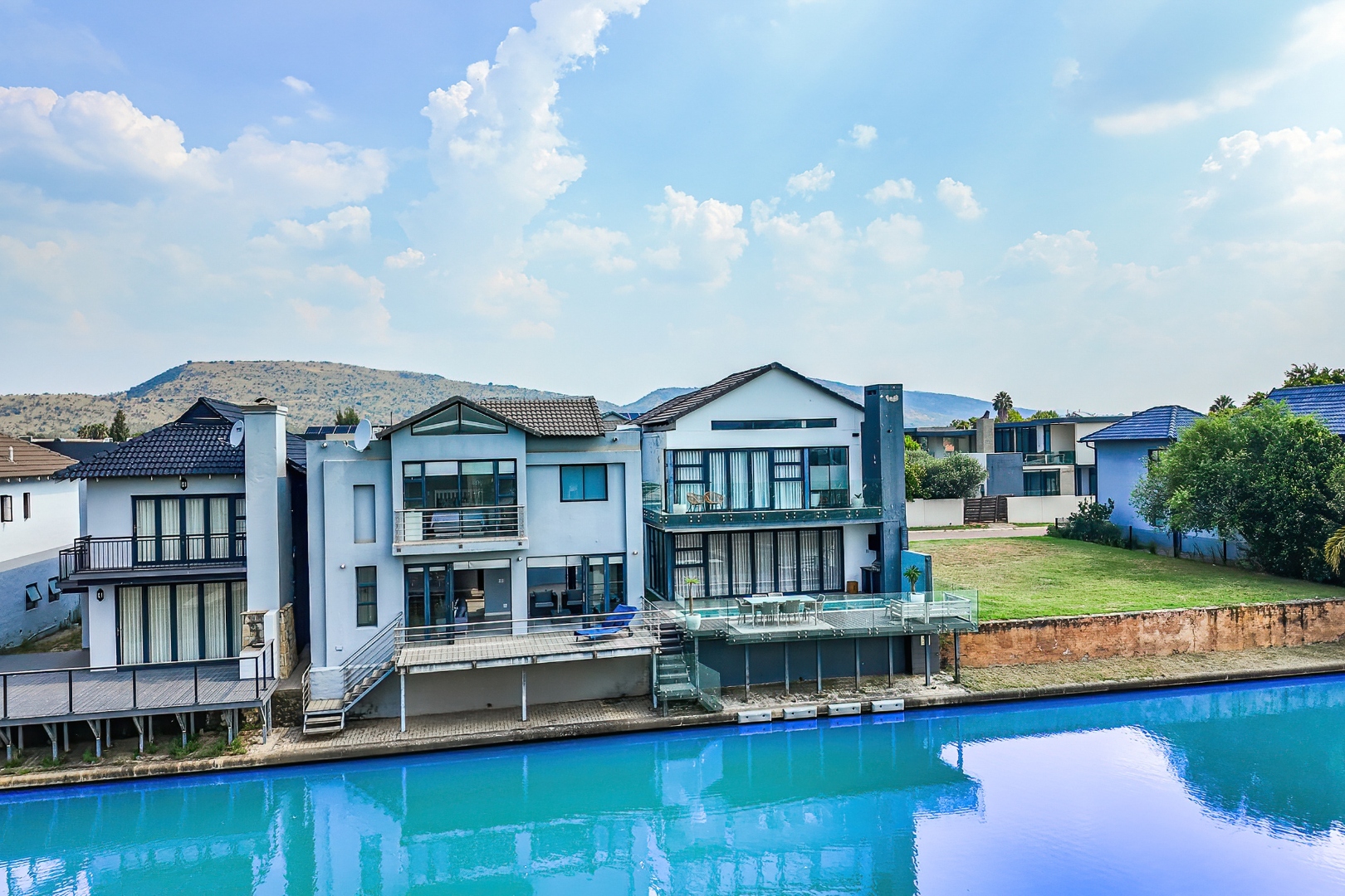 The residence comprises three well-appointed bedrooms and two full bathrooms, including a luxurious en-suite, complemented by an additional guest toilet. Outdoors, the 419.00 sqm erf boasts direct canal access with a private jetty berth, ideal for aquatic pursuits. Multiple balconies and a spacious patio extend the living areas, offering picturesque water and mountain views. The modern architectural design, featuring extensive windows, enhances the property's kerb appeal,