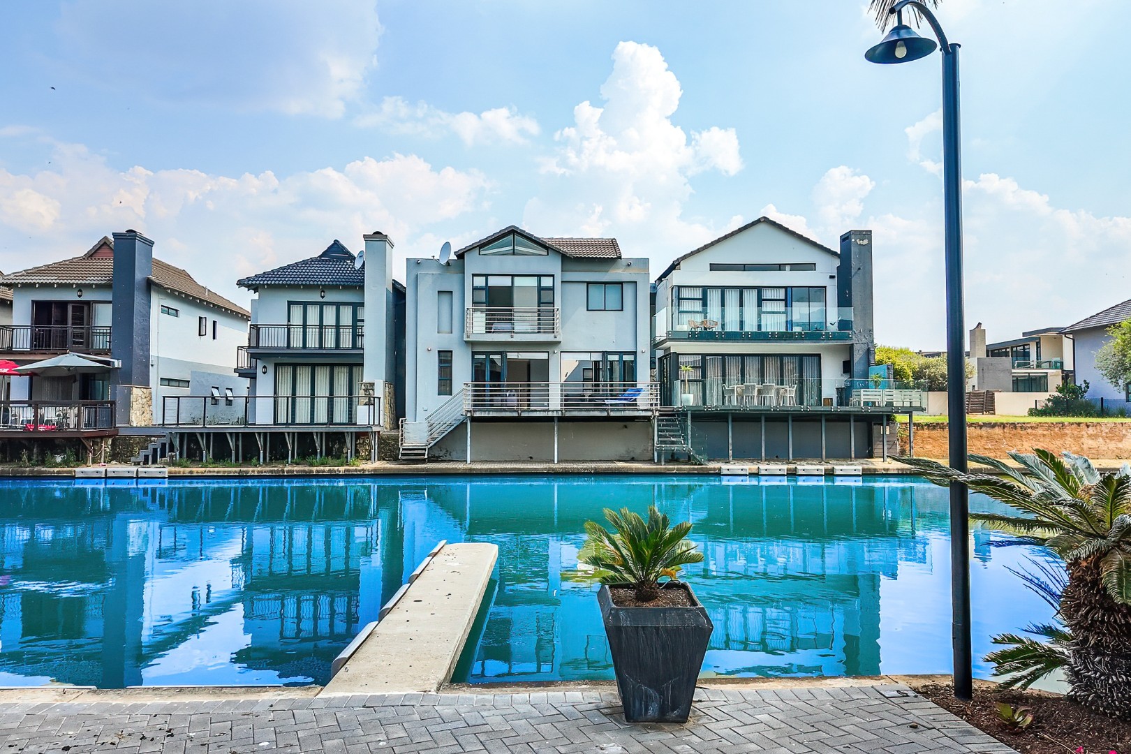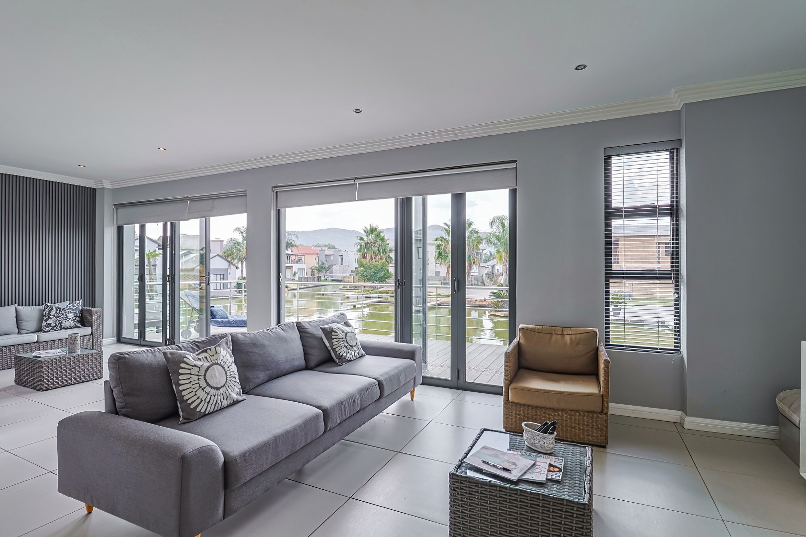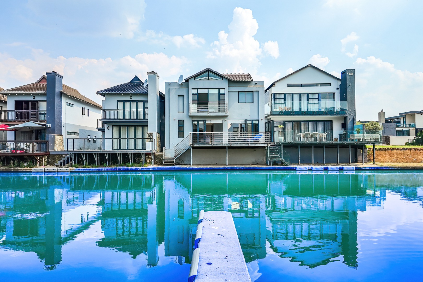 The residence comprises three well-appointed bedrooms and two full bathrooms, including a luxurious en-suite, complemented by an additional guest toilet. Outdoors, the 419.00 sqm erf boasts direct canal access with a private jetty berth, ideal for aquatic pursuits. Multiple balconies and a spacious patio extend the living areas, offering picturesque water and mountain views. The modern architectural design, featuring extensive windows, enhances the property's kerb appeal,
