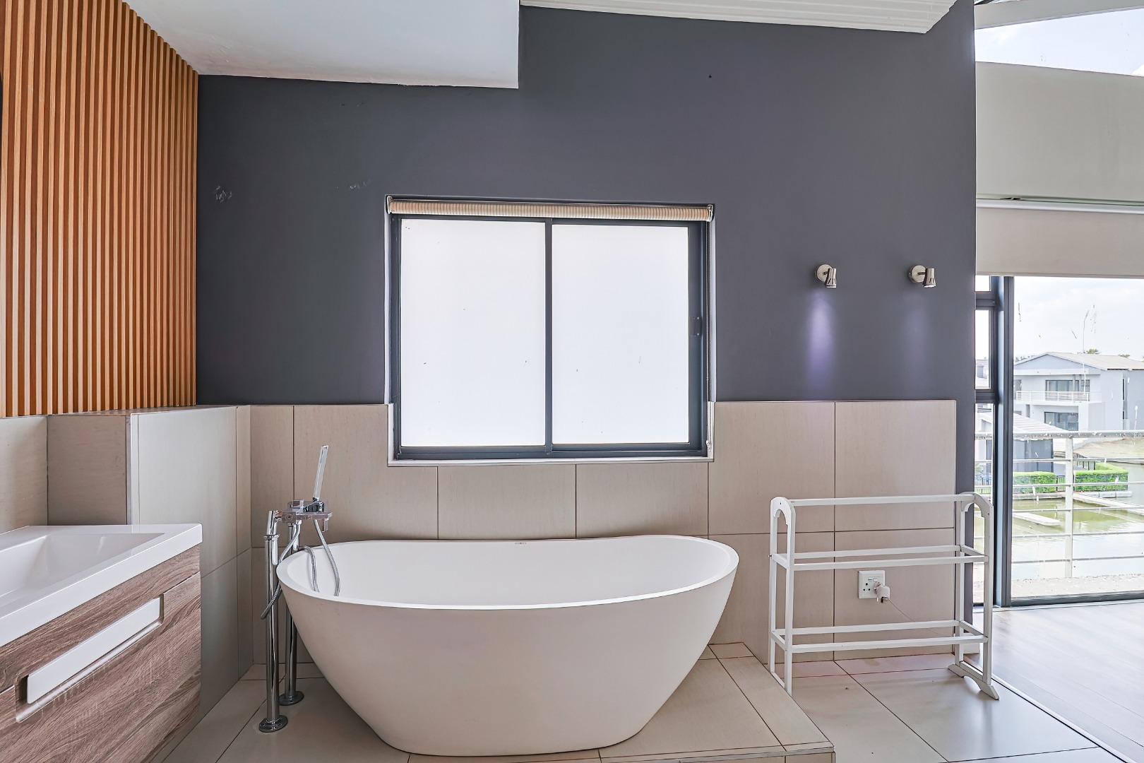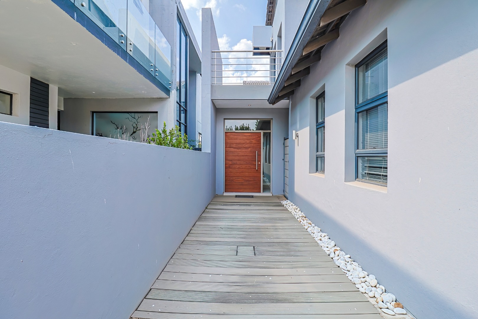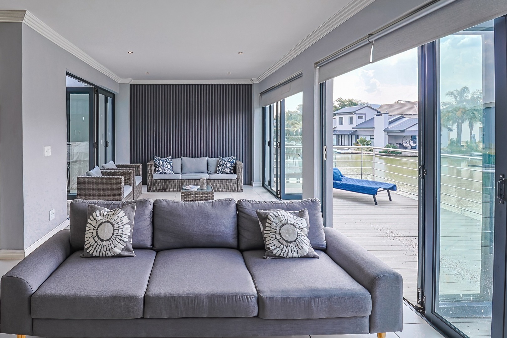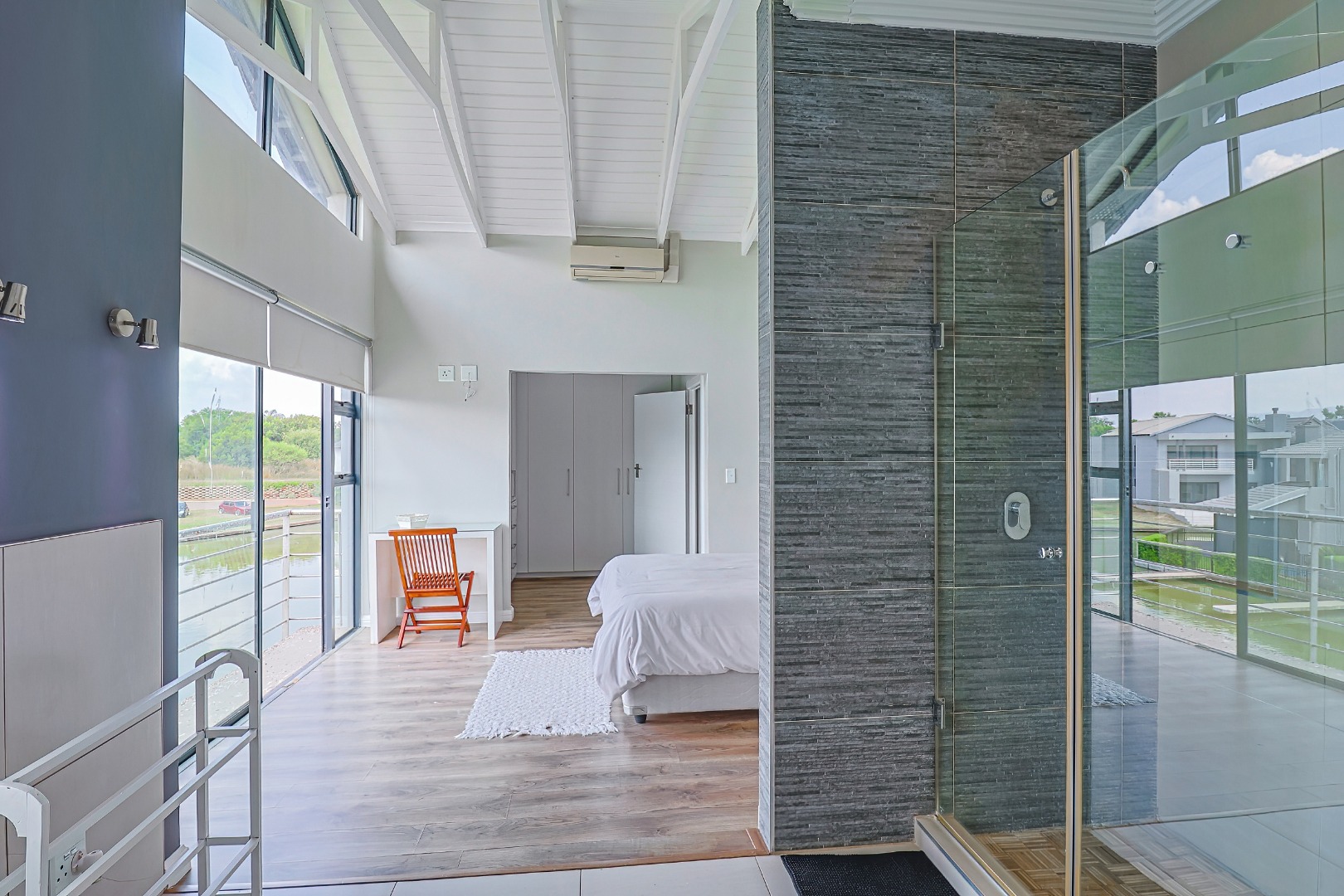 The residence comprises three well-appointed bedrooms and two full bathrooms, including a luxurious en-suite, complemented by an additional guest toilet. Outdoors, the 419.00 sqm erf boasts direct canal access with a private jetty berth, ideal for aquatic pursuits. Multiple balconies and a spacious patio extend the living areas, offering picturesque water and mountain views. The modern architectural design, featuring extensive windows, enhances the property's kerb appeal,
