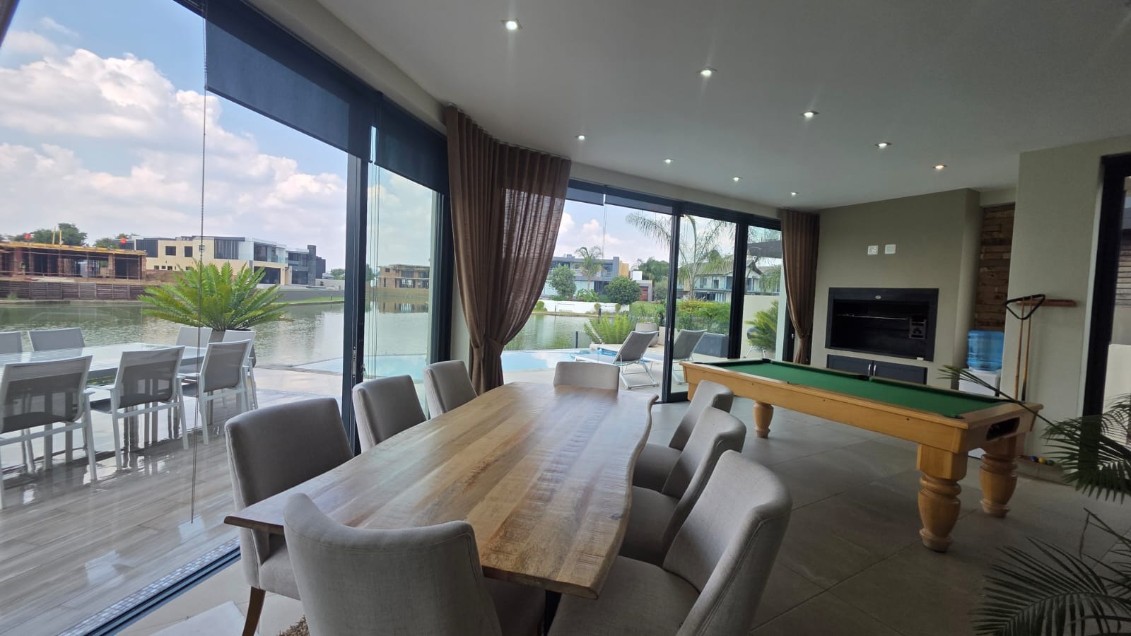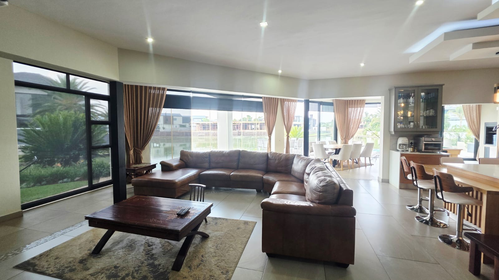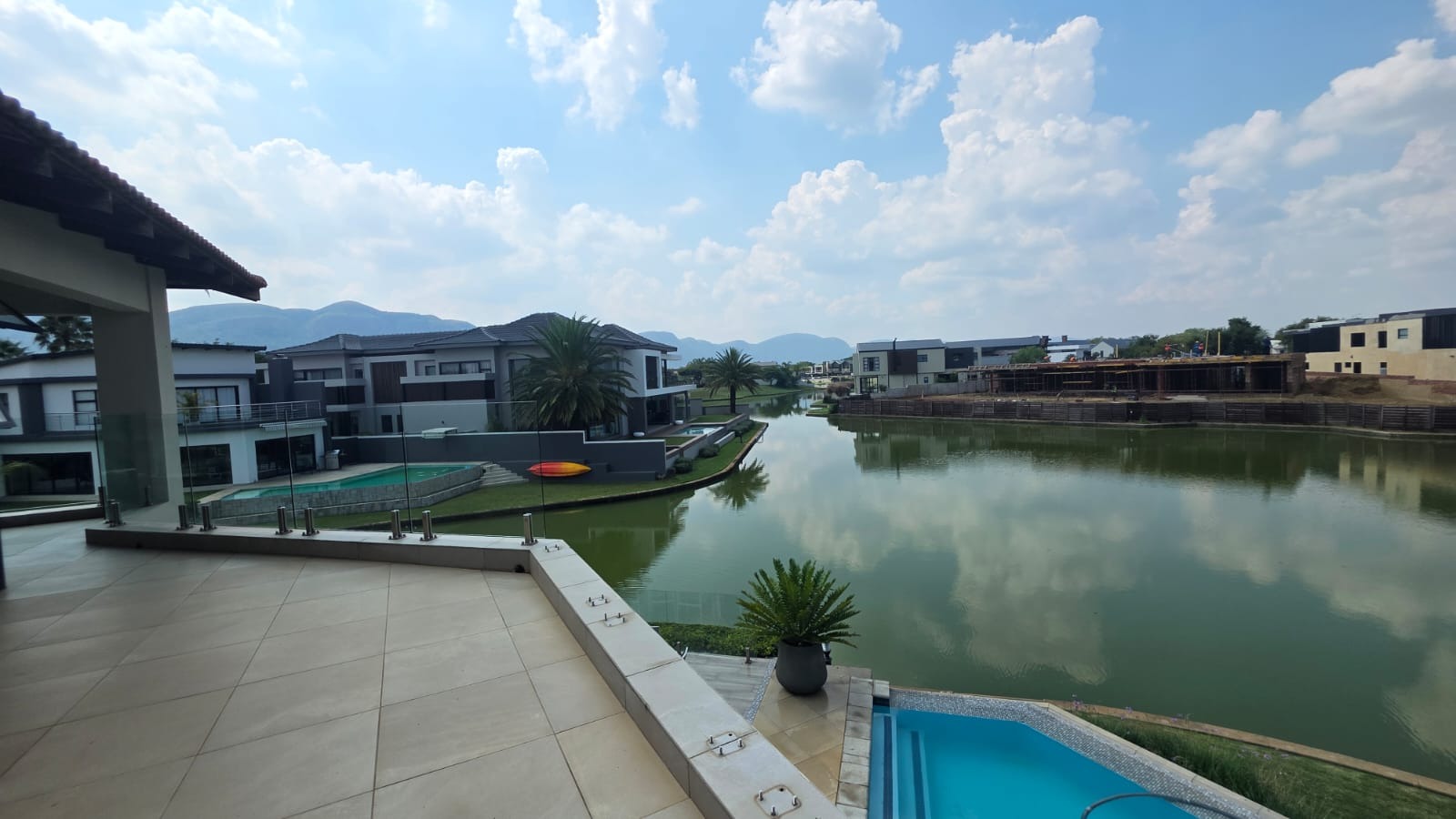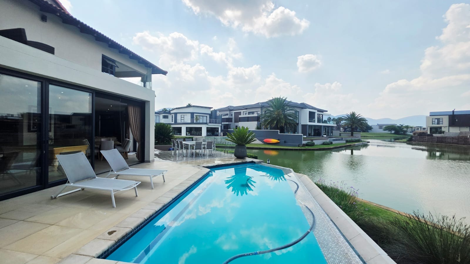 Exceptional 360-degree views of Magalies mountains, what an extraordinary home in The Islands Estate. This unique home offers 4 spacious bedrooms with breathtaking panoramic views with wrap-around balconies, built-in cupboards, and wooden floors with 3 and a half Modern bathrooms. The master bedroom with its extensive views, complete with a walk-in closet, mini-bar, and spacious en-suite that enjoys abundant light and a layout designed for easy living and entertaining in a prime location. The elegant contemporary home enters through a beautiful double volume entrance leading to a modern kitchen that offers sleek finishes, open spaces, Caesar stone tops, a serving hatch to your entertainment area, and a smeg gas stove. A well-equipped scullery with all appliances and additional working space. This open-plan living area with a spacious lounge, gas fireplace, and dining room opens up with stacking doors onto a vast wrap-around patio with exceptional views of private island canals, a beautiful mountain range and a sparkling pool with a grand Boma area next to the canal. This spectacular home includes a study, domestic quarters, solar panels, an underfloor vacuum system, a gas fireplace, roller blinds, double volume ceilings, and a double garage leading directly into the house with another 2 parking spaces.