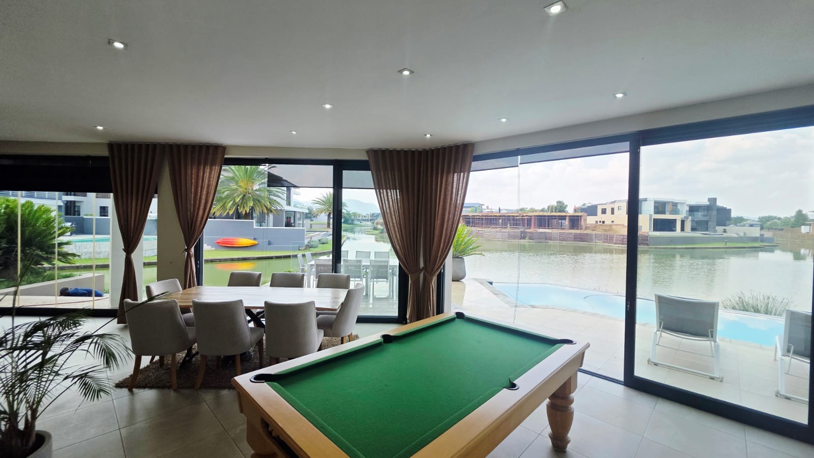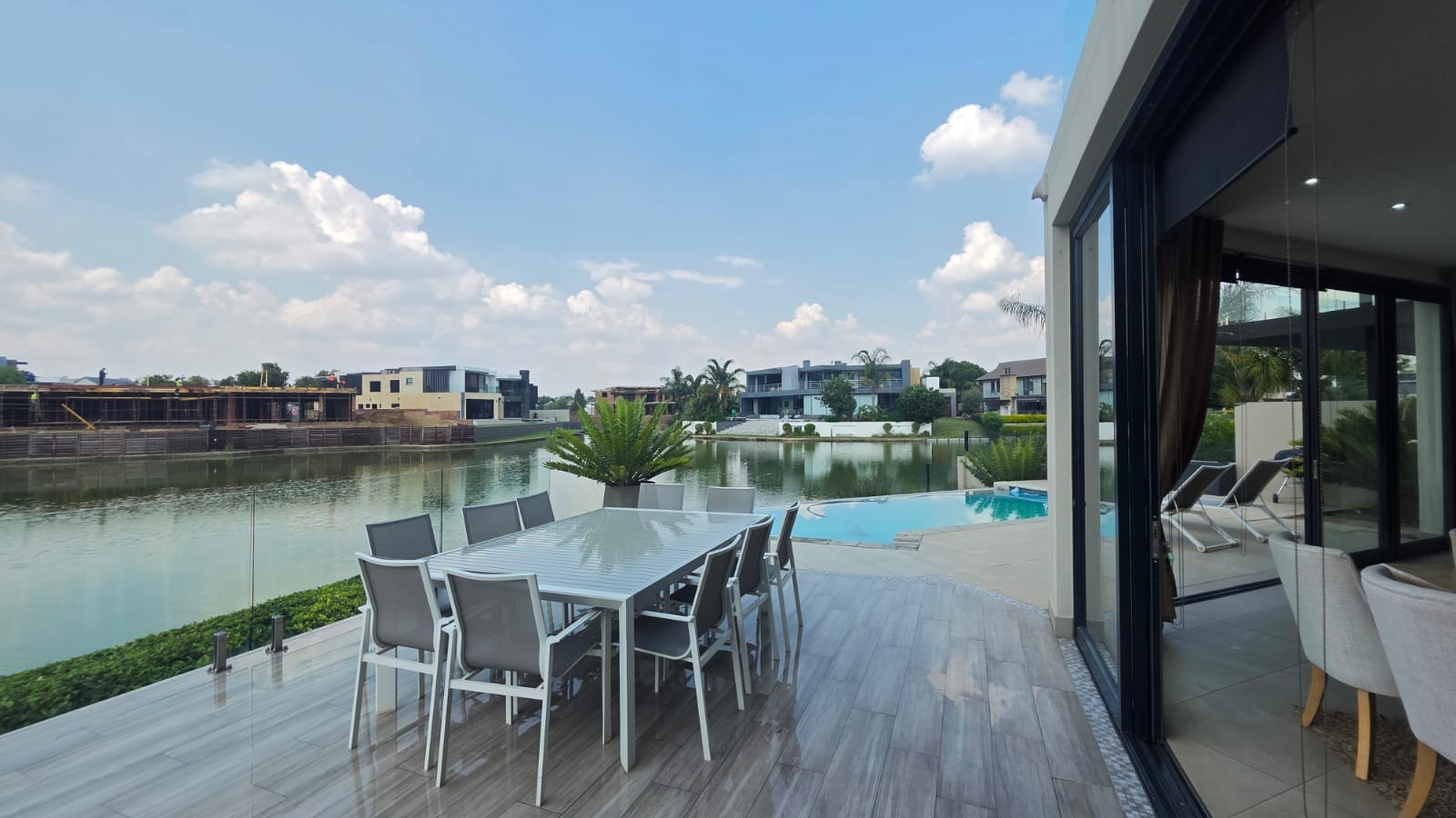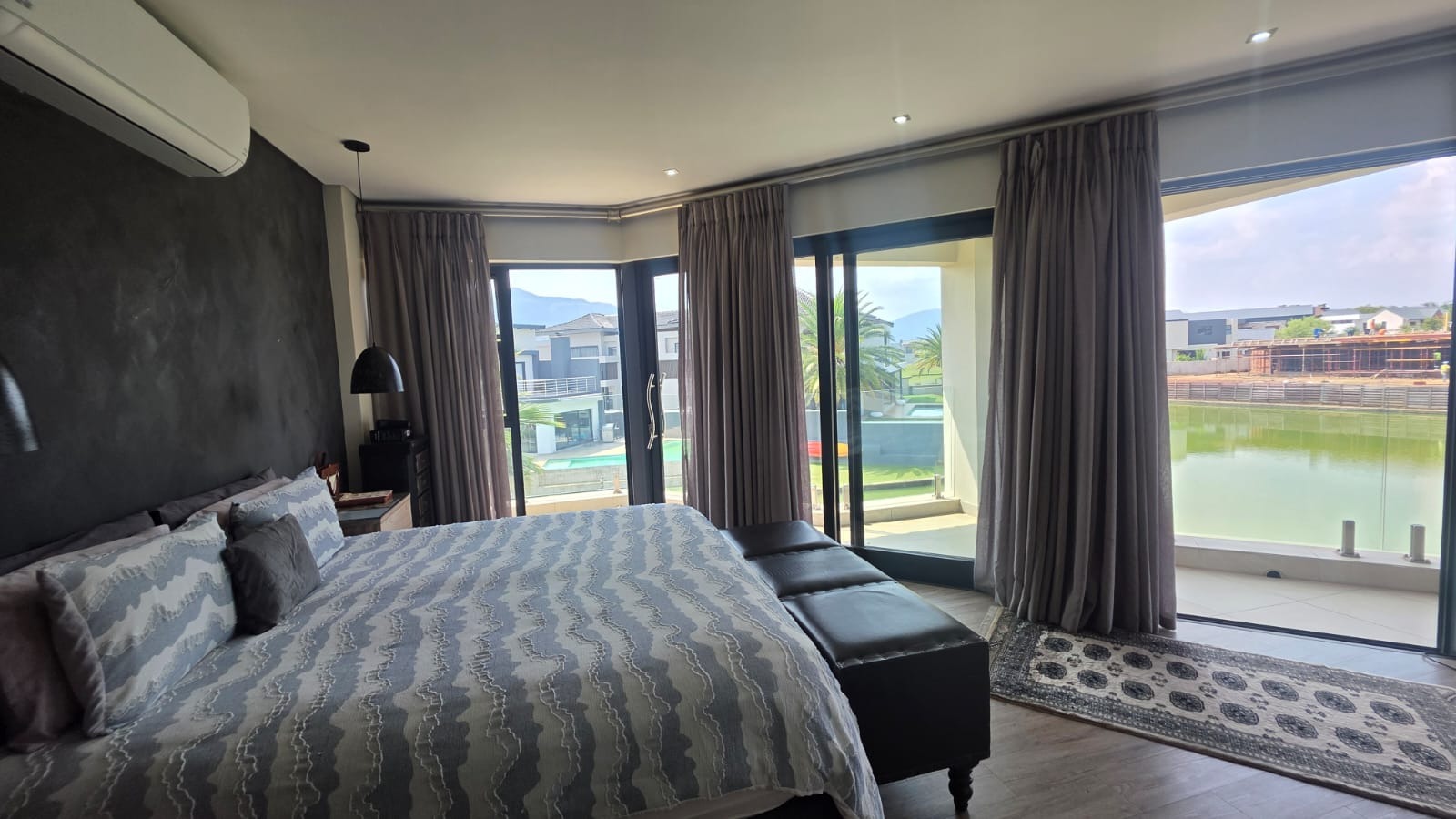 Exceptional 360-degree views of Magalies mountains, what an extraordinary home in The Islands Estate. This unique home offers 4 spacious bedrooms with breathtaking panoramic views with wrap-around balconies, built-in cupboards, and wooden floors with 3 and a half Modern bathrooms. The master bedroom with its extensive views, complete with a walk-in closet, mini-bar, and spacious en-suite that enjoys abundant light and a layout designed for easy living and entertaining in a prime location. The elegant contemporary home enters through a beautiful double volume entrance leading to a modern kitchen that offers sleek finishes, open spaces, Caesar stone tops, a serving hatch to your entertainment area, and a smeg gas stove. A well-equipped scullery with all appliances and additional working space. This open-plan living area with a spacious lounge, gas fireplace, and dining room opens up with stacking doors onto a vast wrap-around patio with exceptional views of private island canals, a beautiful mountain range and a sparkling pool with a grand Boma area next to the canal. This spectacular home includes a study, domestic quarters, solar panels, an underfloor vacuum system, a gas fireplace, roller blinds, double volume ceilings, and a double garage leading directly into the house with another 2 parking spaces.