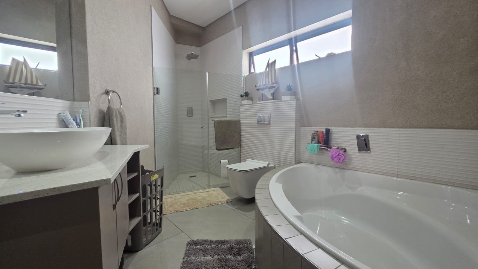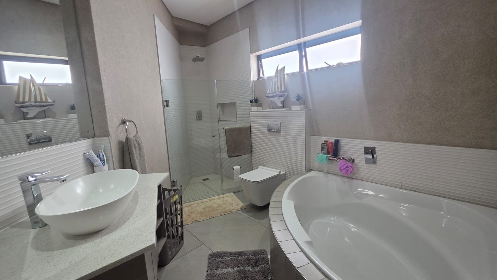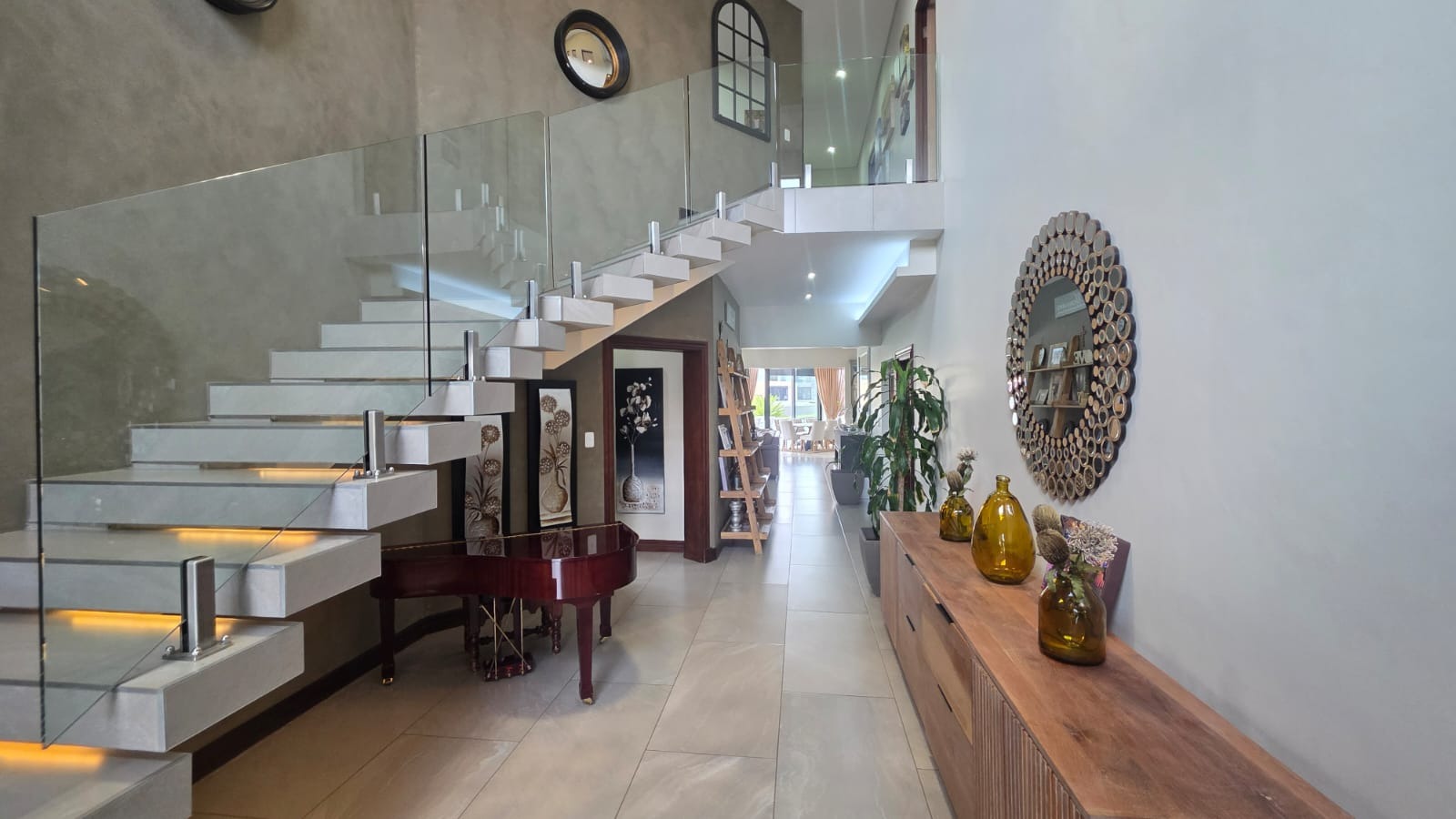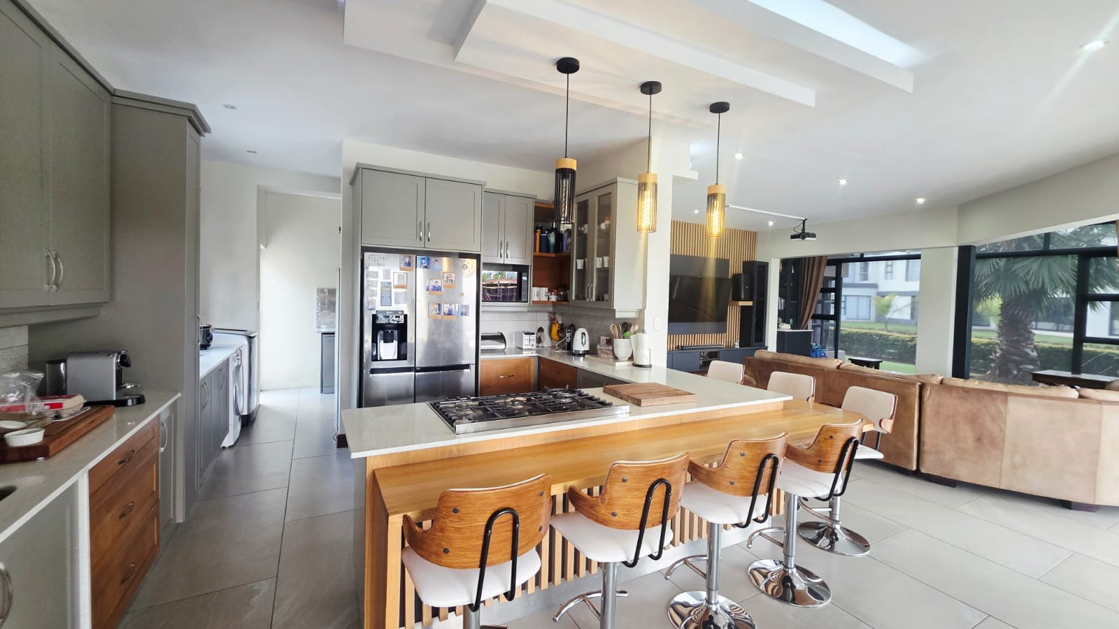 Exceptional 360-degree views of Magalies mountains, what an extraordinary home in The Islands Estate. This unique home offers 4 spacious bedrooms with breathtaking panoramic views with wrap-around balconies, built-in cupboards, and wooden floors with 3 and a half Modern bathrooms. The master bedroom with its extensive views, complete with a walk-in closet, mini-bar, and spacious en-suite that enjoys abundant light and a layout designed for easy living and entertaining in a prime location. The elegant contemporary home enters through a beautiful double volume entrance leading to a modern kitchen that offers sleek finishes, open spaces, Caesar stone tops, a serving hatch to your entertainment area, and a smeg gas stove. A well-equipped scullery with all appliances and additional working space. This open-plan living area with a spacious lounge, gas fireplace, and dining room opens up with stacking doors onto a vast wrap-around patio with exceptional views of private island canals, a beautiful mountain range and a sparkling pool with a grand Boma area next to the canal. This spectacular home includes a study, domestic quarters, solar panels, an underfloor vacuum system, a gas fireplace, roller blinds, double volume ceilings, and a double garage leading directly into the house with another 2 parking spaces.