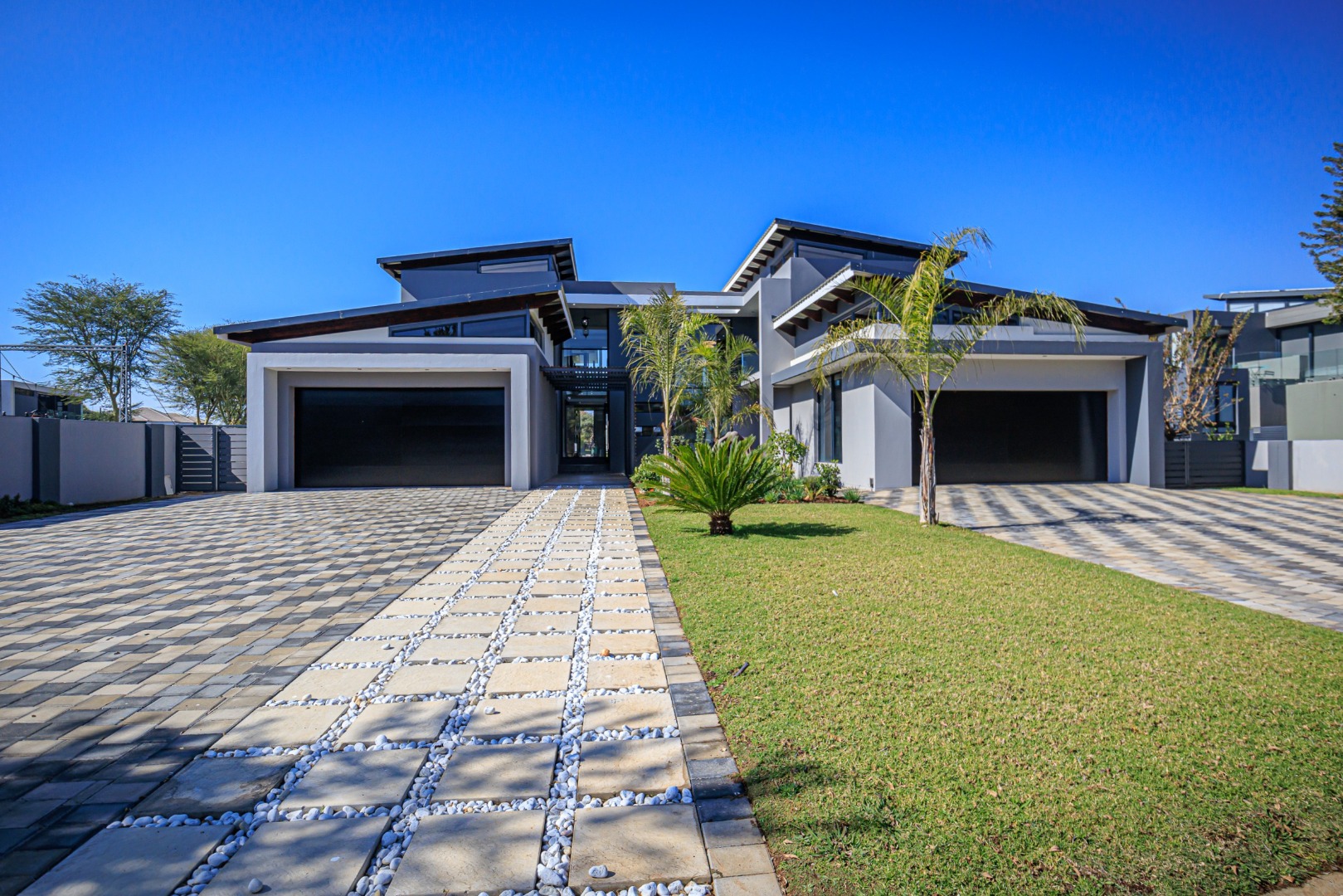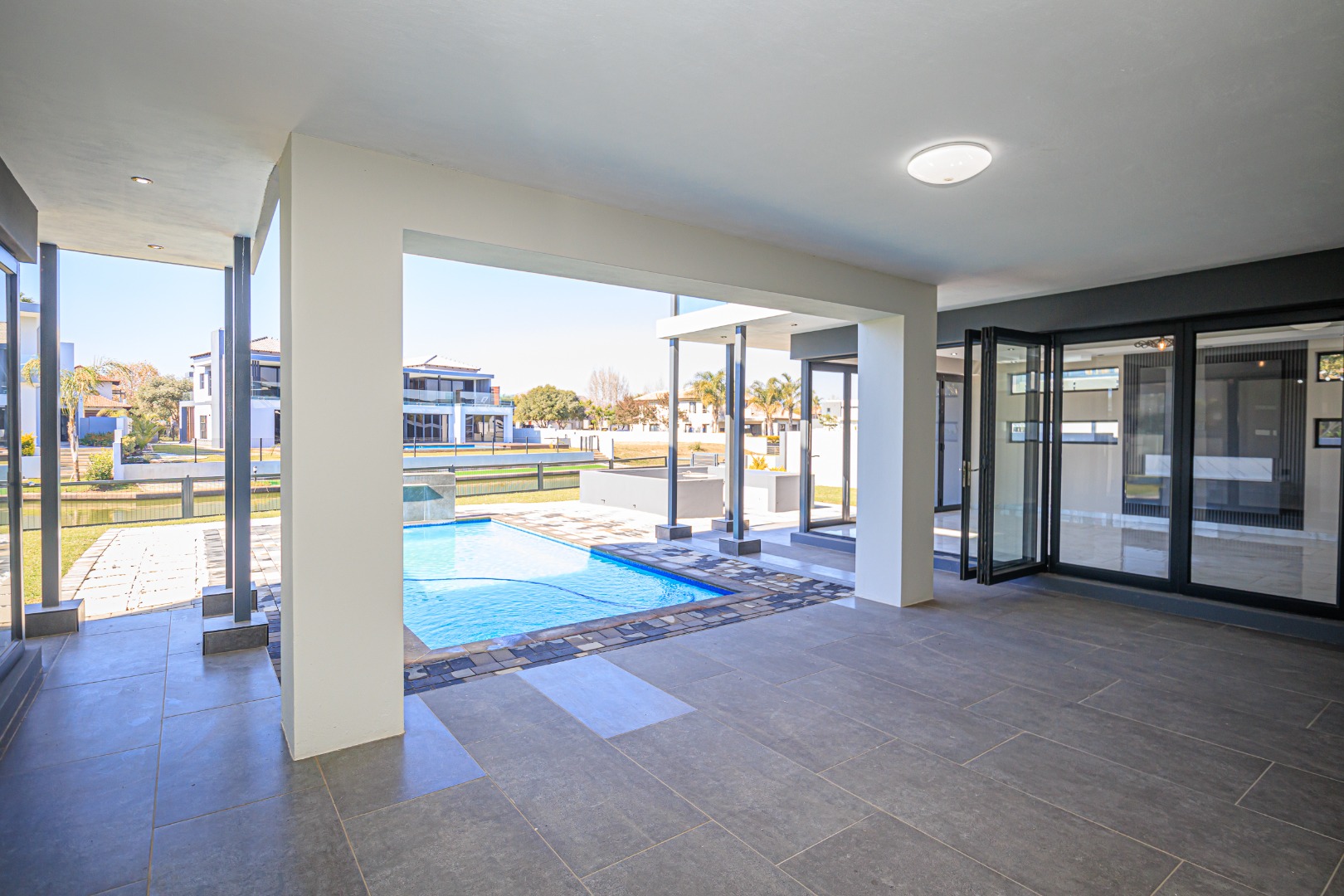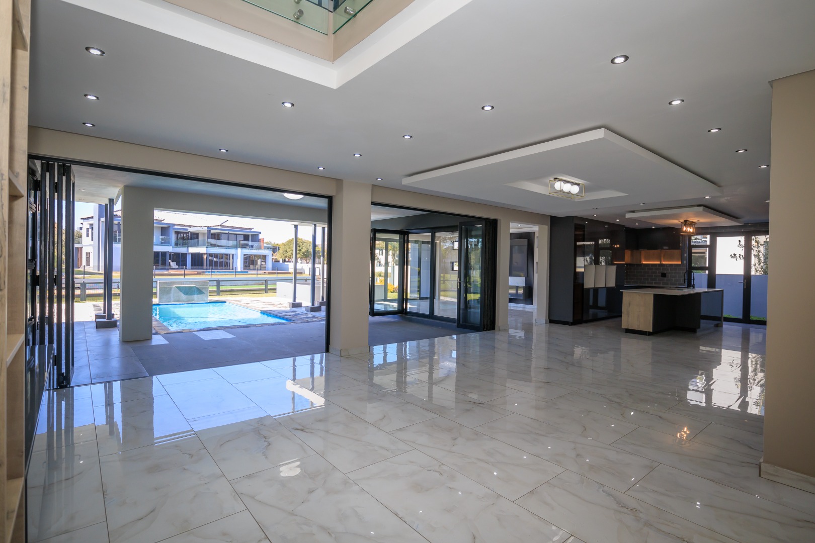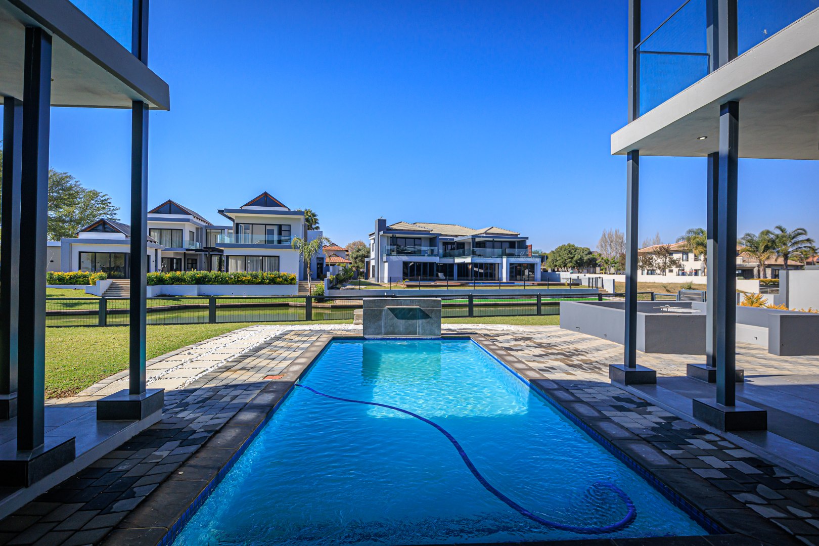 This sophisticated and luxurious home is set within the prestigious Islands Estate, offering a secure and refined lifestyle that’s nearly unmatched. Designed for comfortable family living and effortless entertaining, this residence blends modern elegance with warm, inviting spaces — the perfect balance of form and function. Chic and contemporary, the home welcomes you with generous open-plan living areas that flow seamlessly between formal and informal zones. The spacious kitchen, lounge, and dining area are designed with entertainers in mind, featuring stackable glass doors that open completely onto an expansive patio, crystal-clear pool, creating an exceptional indoor-outdoor living experience. A private guest suite with en-suite bathroom is thoughtfully positioned off the main living area on the ground floor, offering convenience and privacy. Upstairs, the first floor is a sanctuary of rest and relaxation, boasting three spacious en-suite bedrooms, each filled with natural light. A comfortable pyjama lounge with a kitchenette provides an additional living area — ideal for relaxed evenings or morning coffees. The master suite is a standout feature, offering a luxurious retreat complete with a walk-in dressing room and a luxurious en-suite bathroom, a space designed for comfort, indulgence, and privacy. Double volume garaging for four vehicles plus ample extra space for additional parking. This home has it all. Just move in and start living.