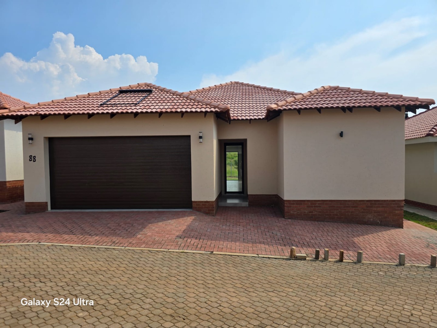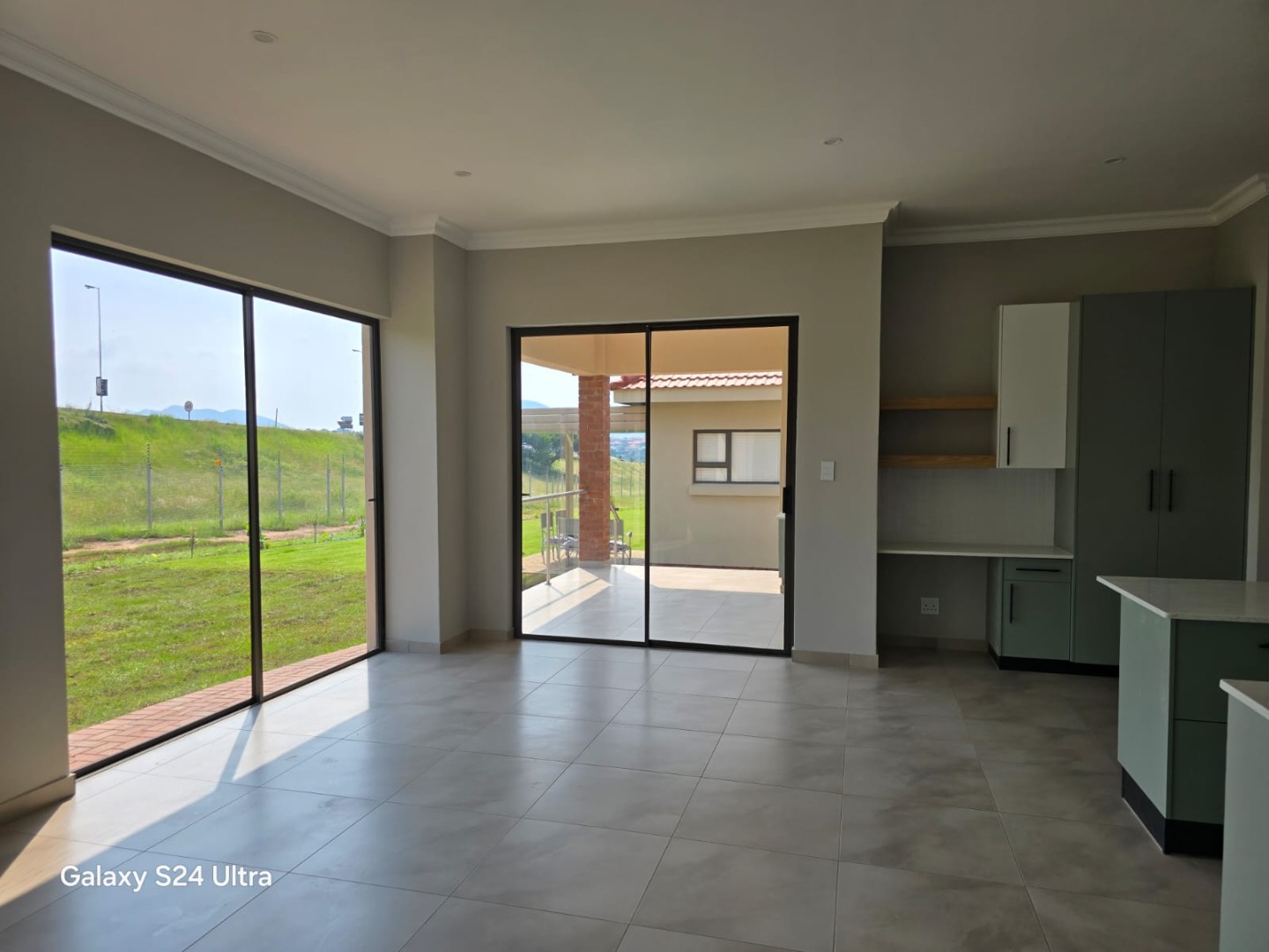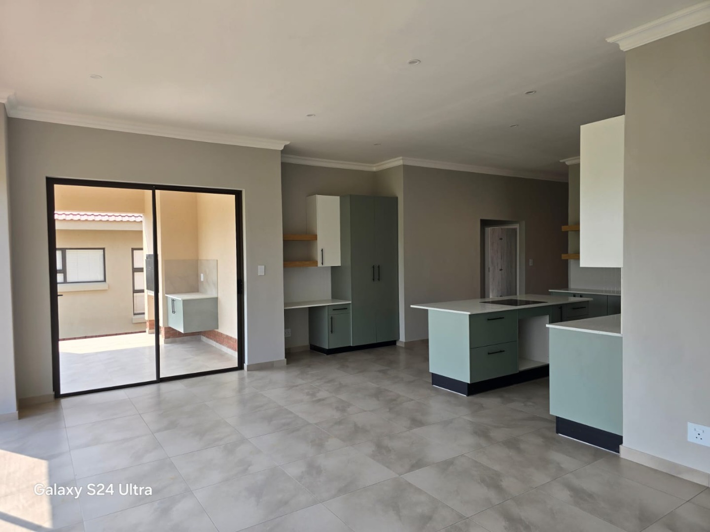The open plan kitchen and living area opens onto a patio with a built-in braai. The double garage has direct access into the house.