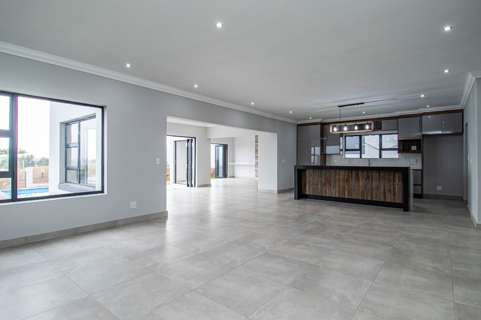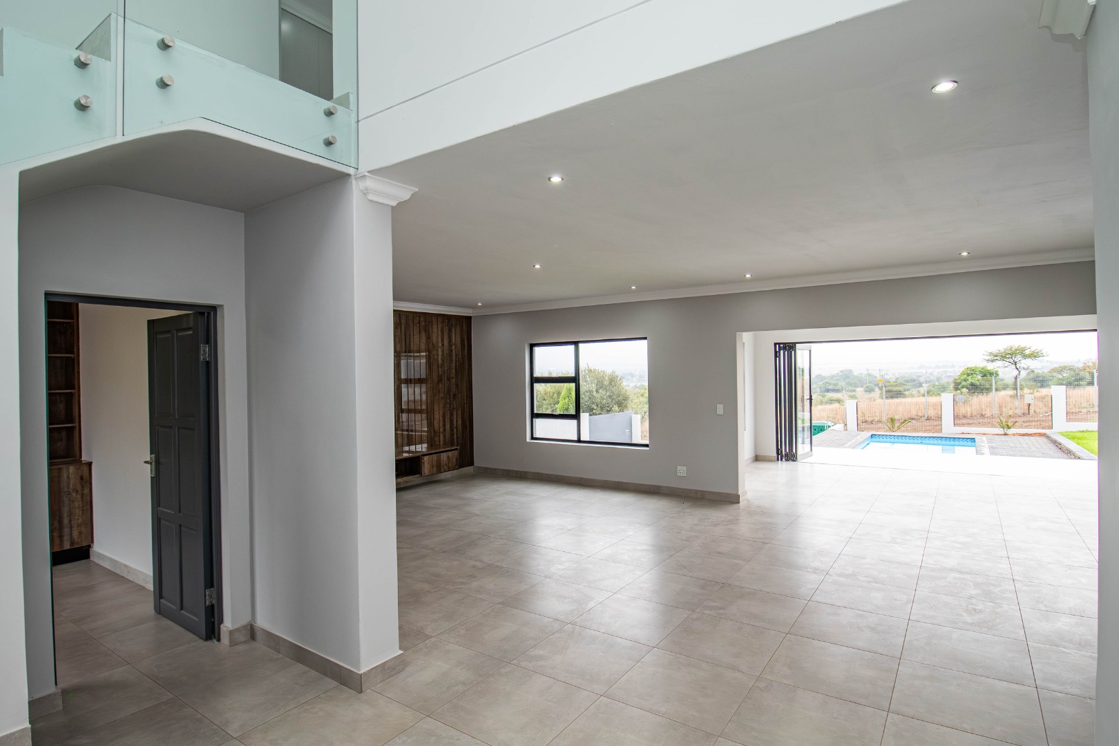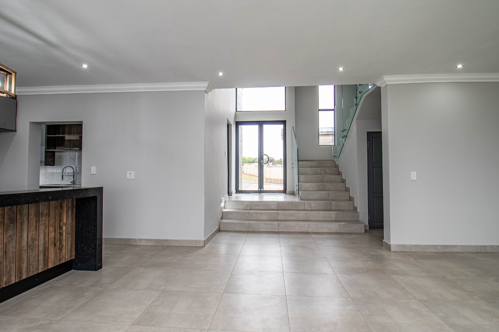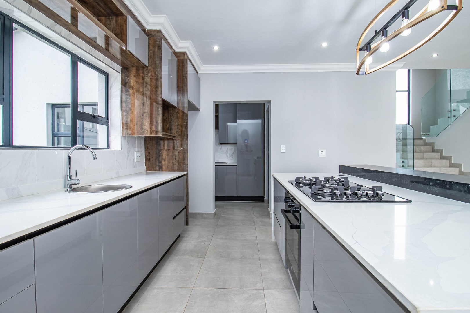The welcoming hallway with its glass façade`, leads to a well-appointed open plan formal lounge, dining room and designer kitchen, with an expansive scullery affording a walk-in pantry.