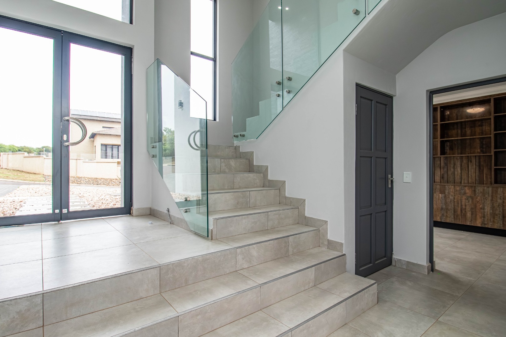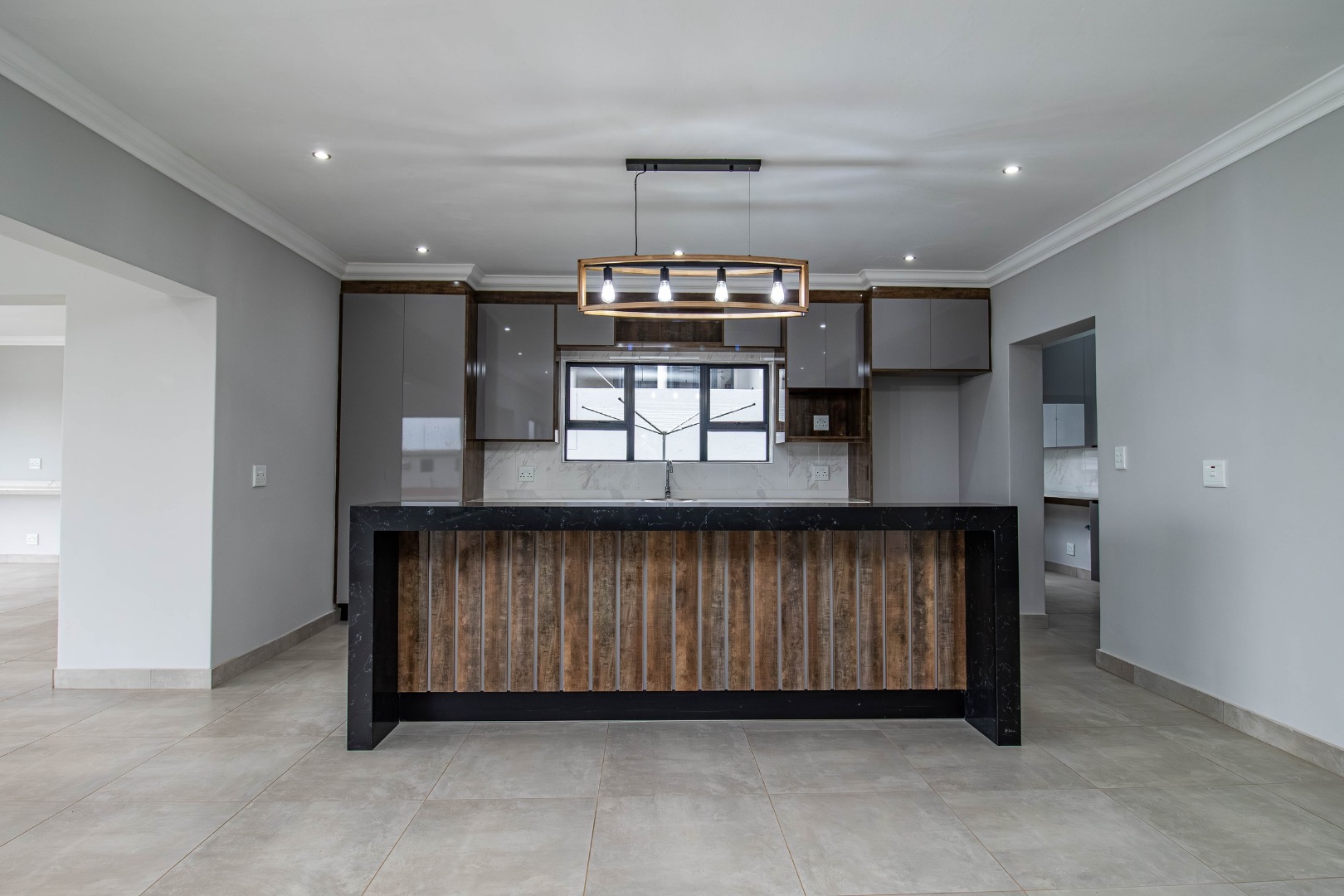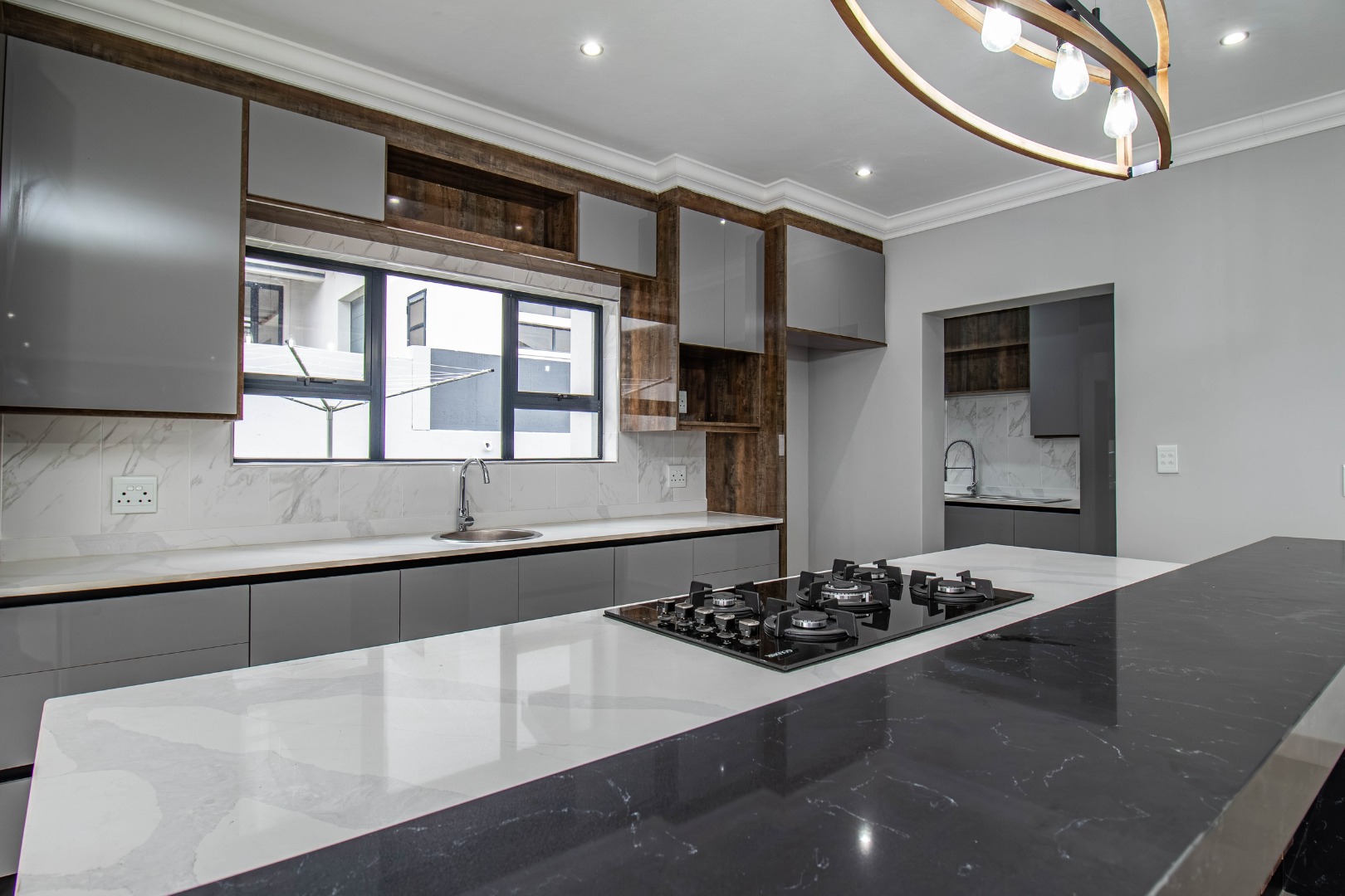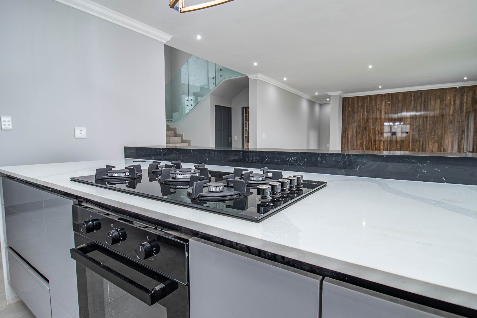 The welcoming hallway with its glass façade`, leads to a well-appointed open plan formal lounge, dining room and designer kitchen, with an expansive scullery affording a walk-in pantry.