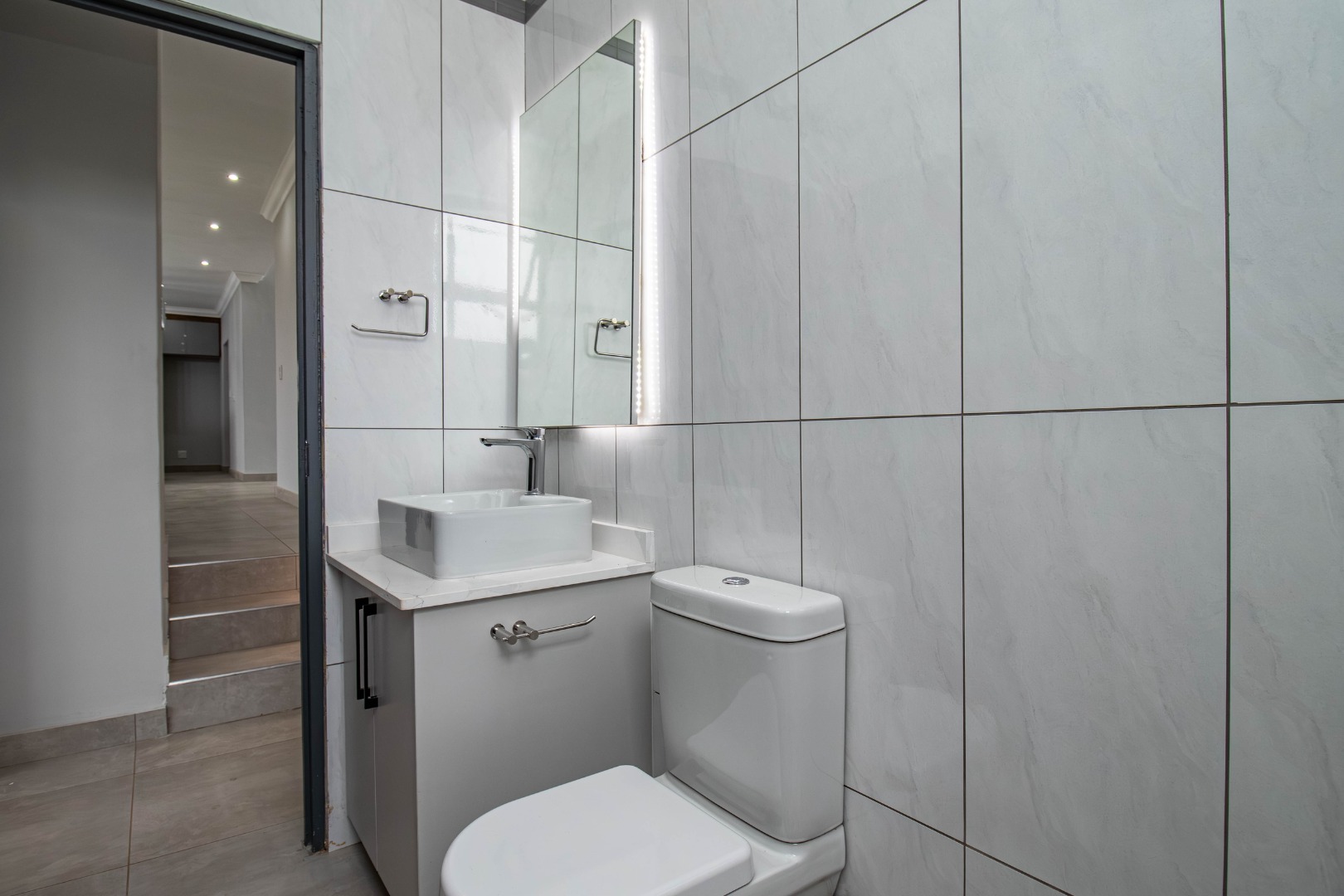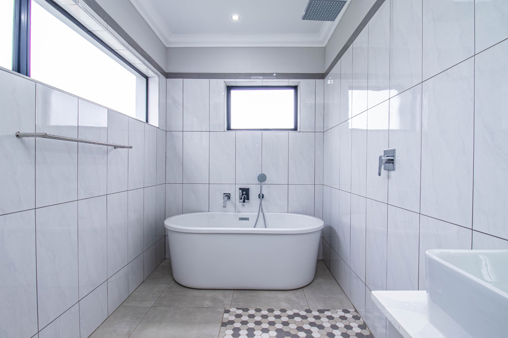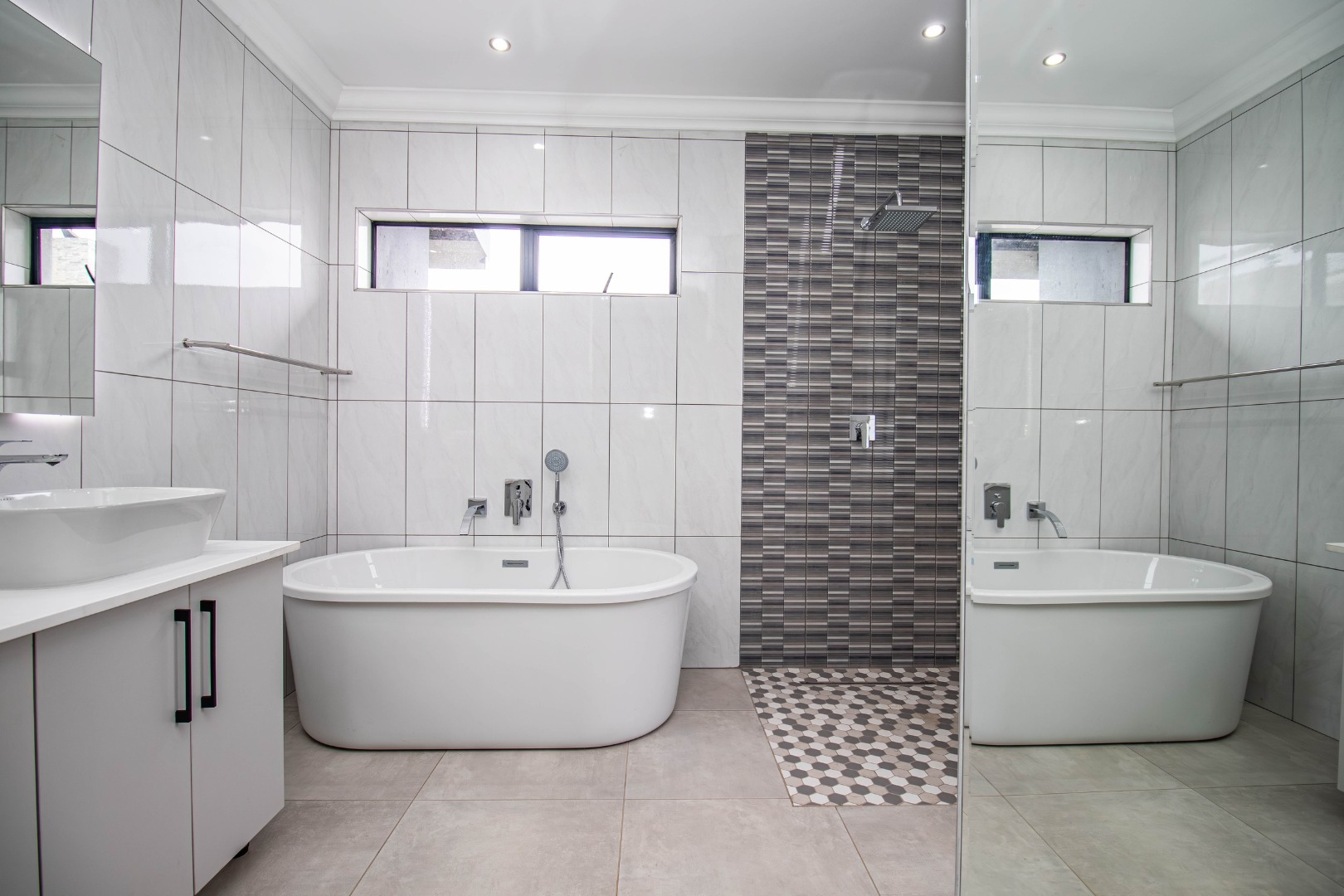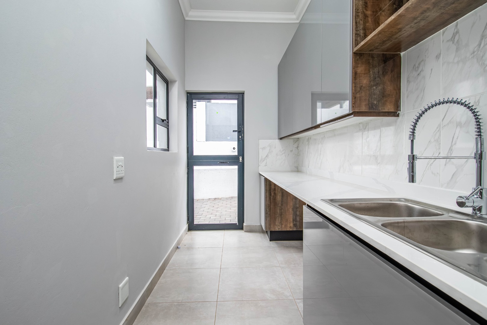 The welcoming hallway with its glass façade`, leads to a well-appointed open plan formal lounge, dining room and designer kitchen, with an expansive scullery affording a walk-in pantry.