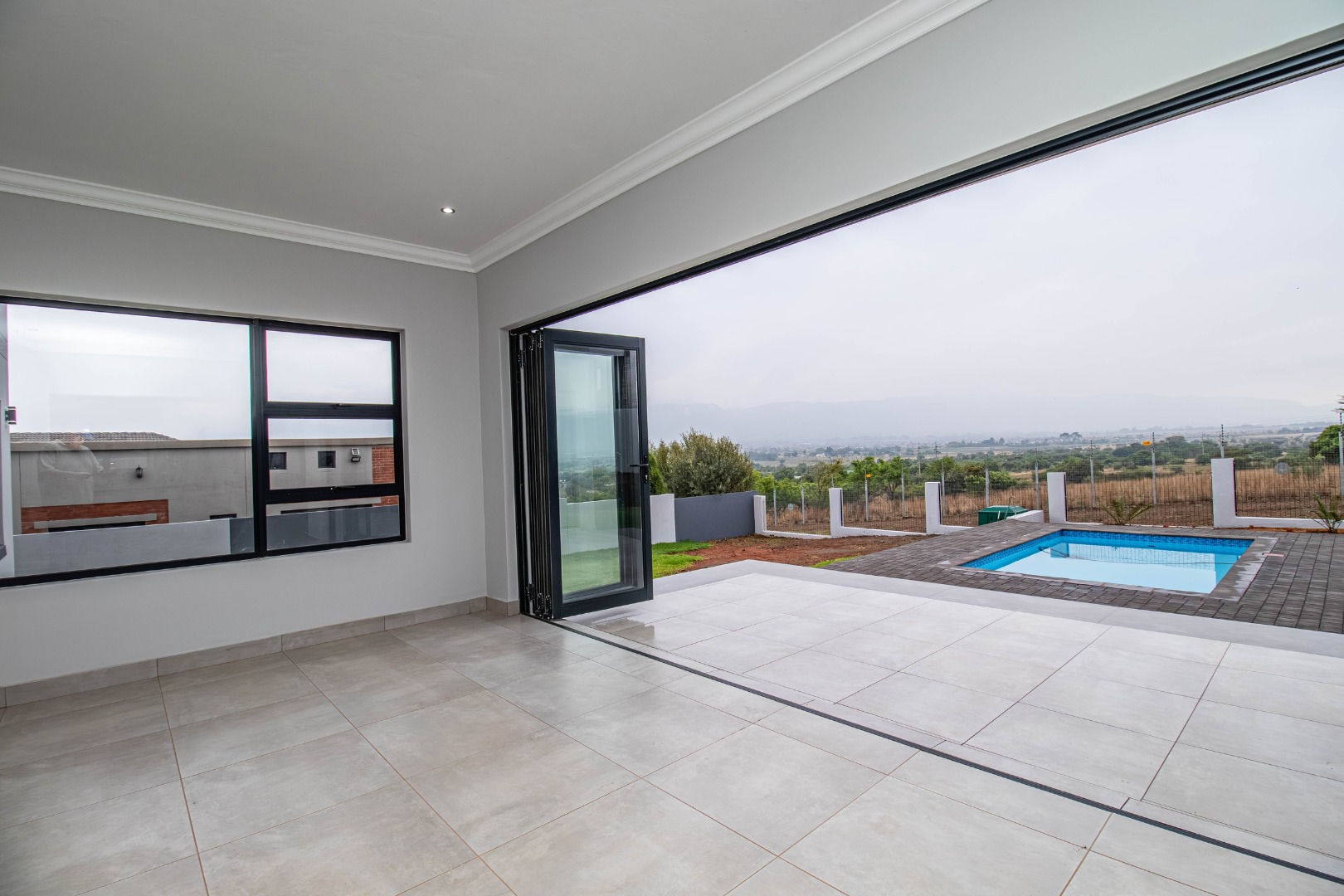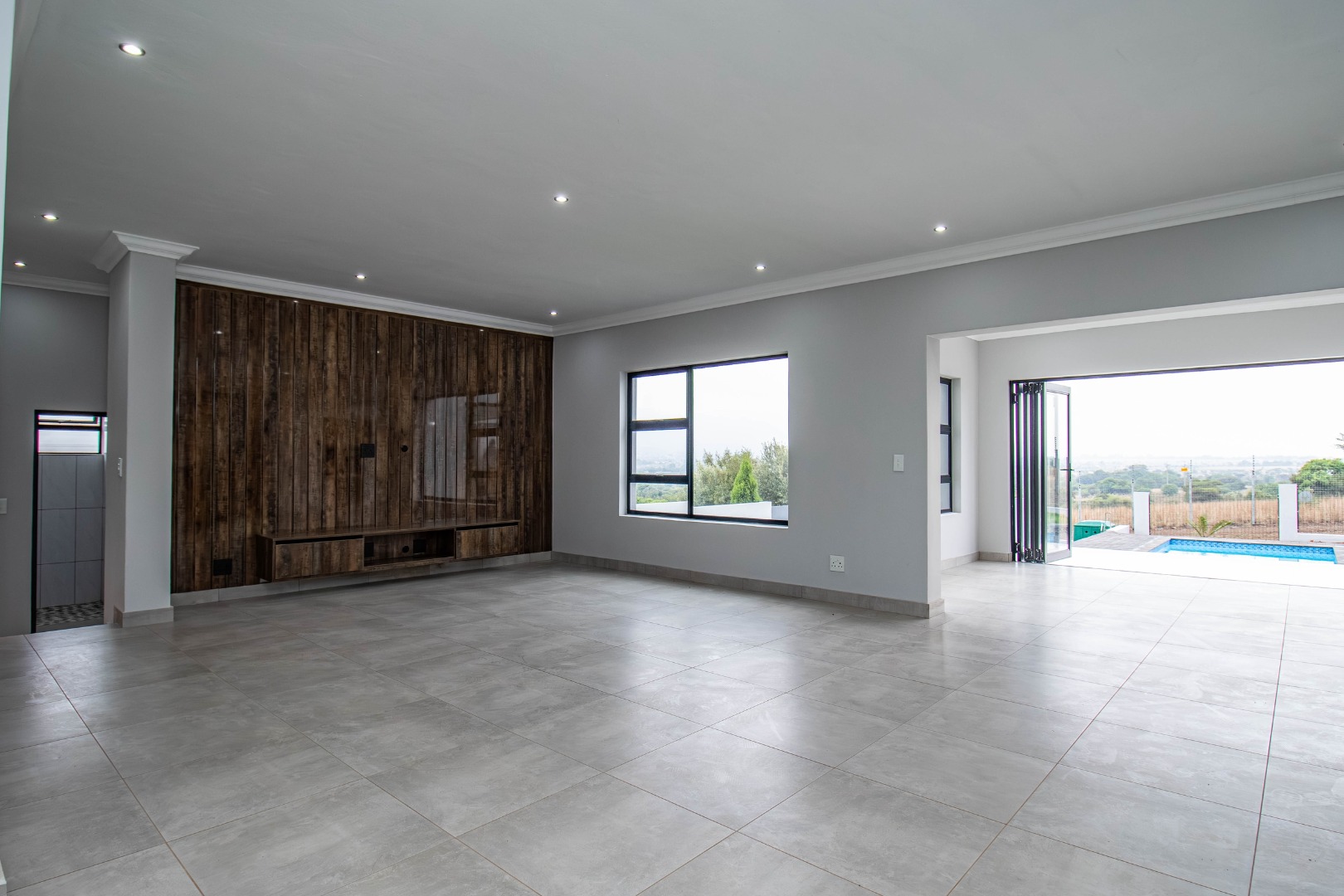The stunning entertainment room with stack doors, a built-in braai and preparation sink, leads to an undercover patio, adjacent to a sparkling blue pool, perfect for summer days and family get-togethers.