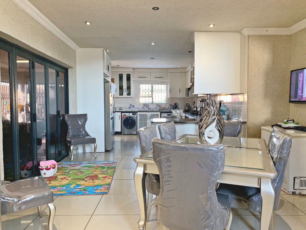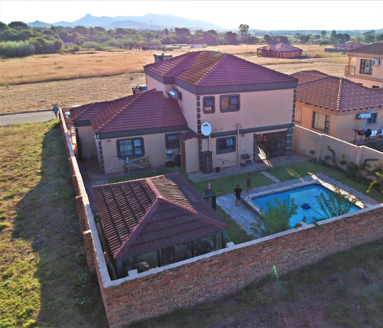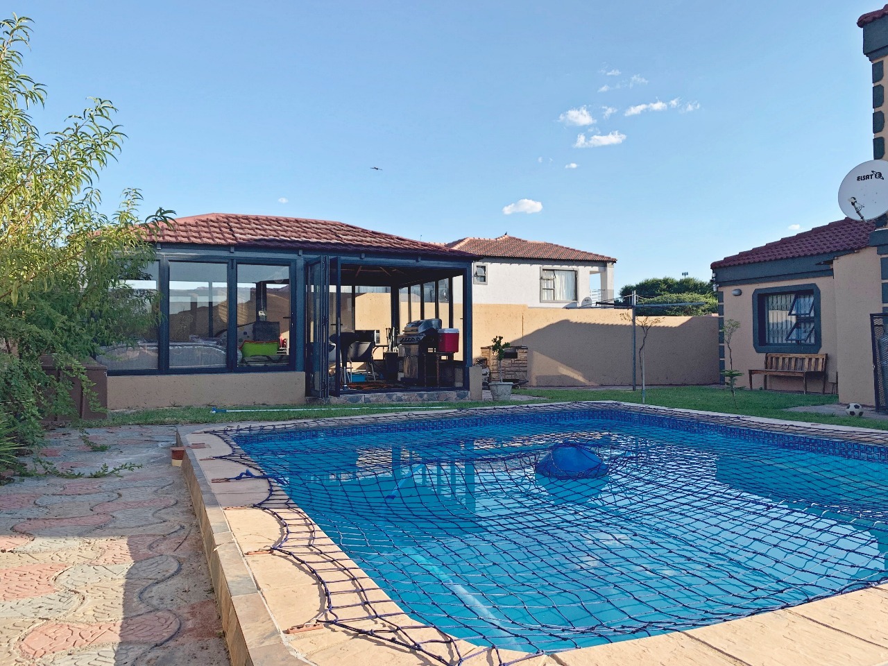 Great value for money in a Security complex, This Modern double-story 4 spacious Bedroom Home, has 3 beautiful bathrooms with a closed entertaining area, a built-in braai and sparkling pool, and a very spacious garden, perfect for a family with kids. A very spacious modern kitchen with granite tops and a separate scullery leads to the open-plan dining area and lounge. A double garage leads directly into the house with a double carport, the property is fully walled for privacy, and the complex is near the centrer of Brits, schools, and shopping centres. This is a steal.