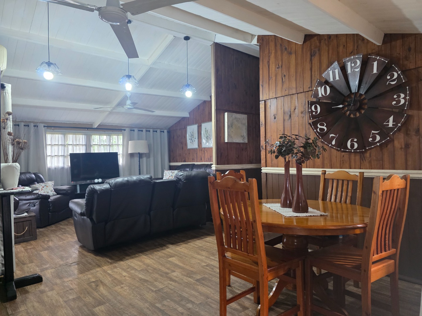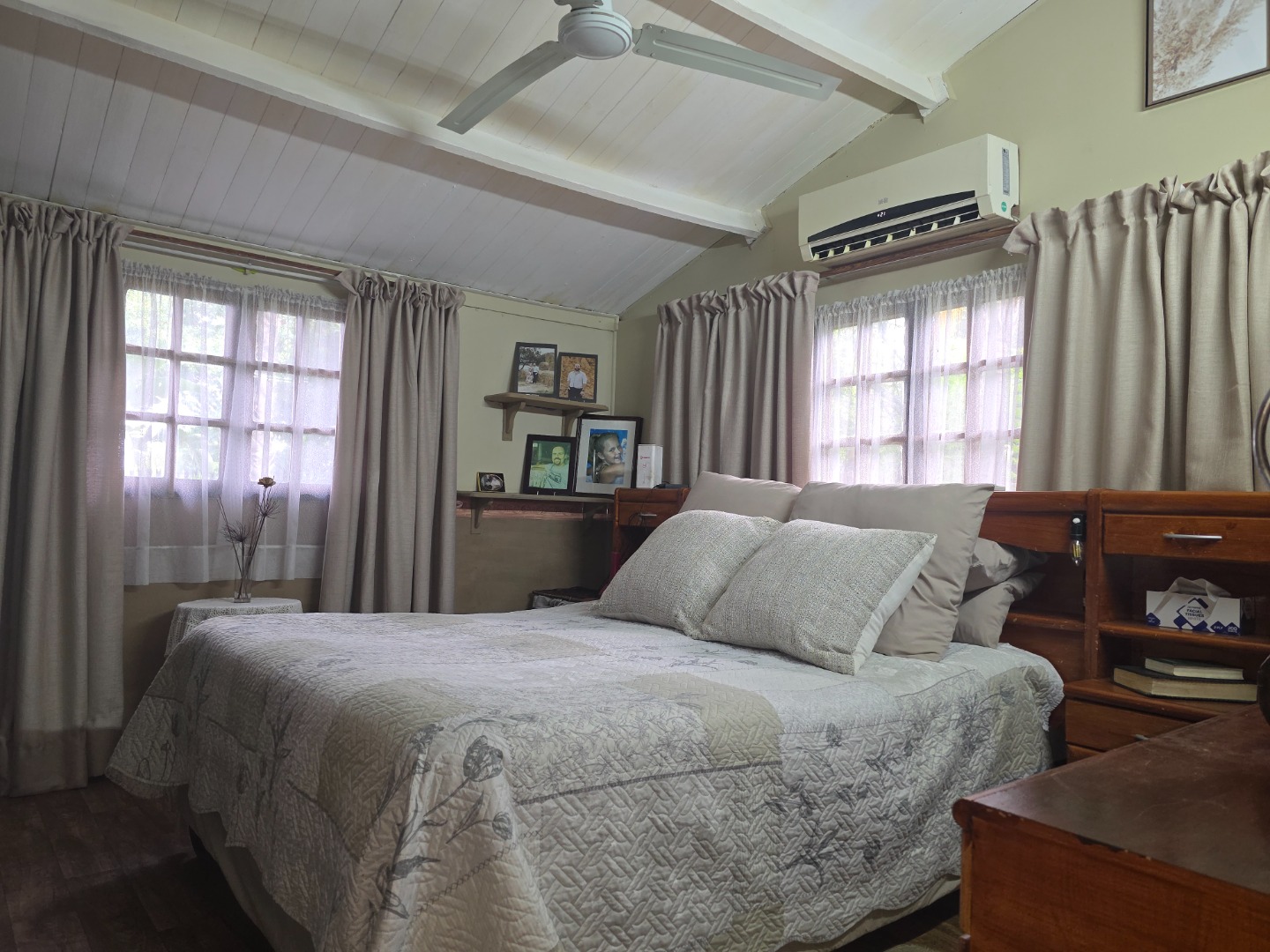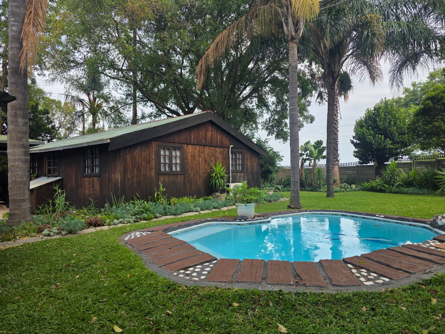 A charming 2-bedroom, 1-bathroom timber home with a warm, inviting feel. Features include a spacious covered braai area, a sparkling swimming pool, a large workshop/storage shed, and stunning established gardens with lush green lawns and mature trees.
