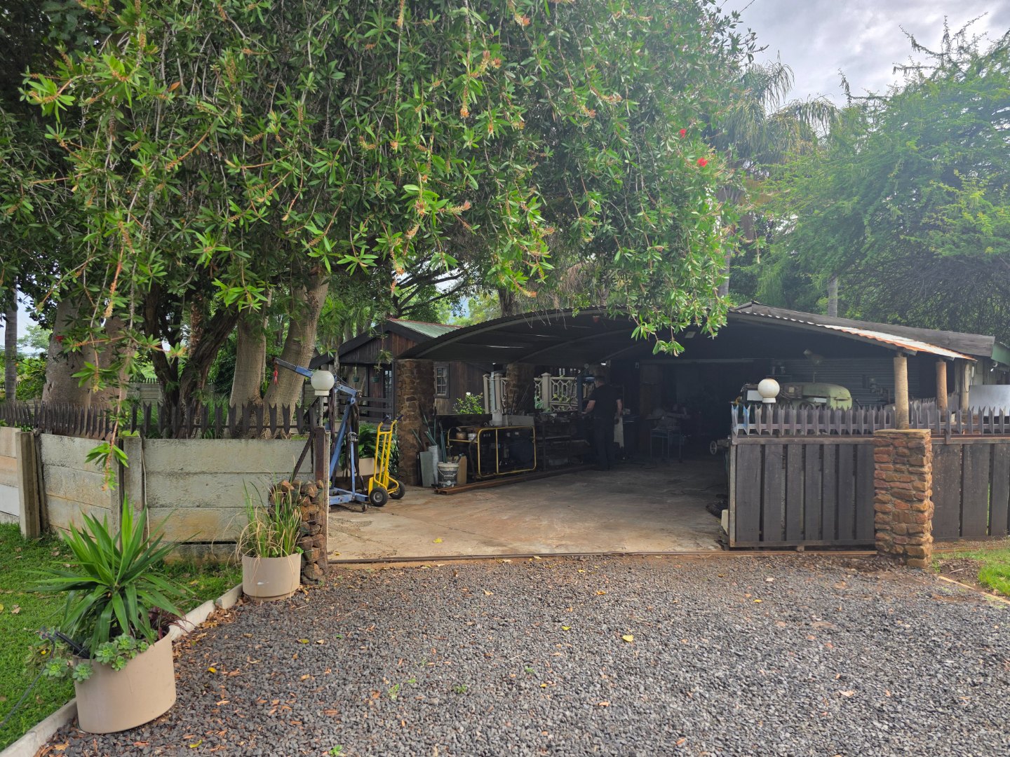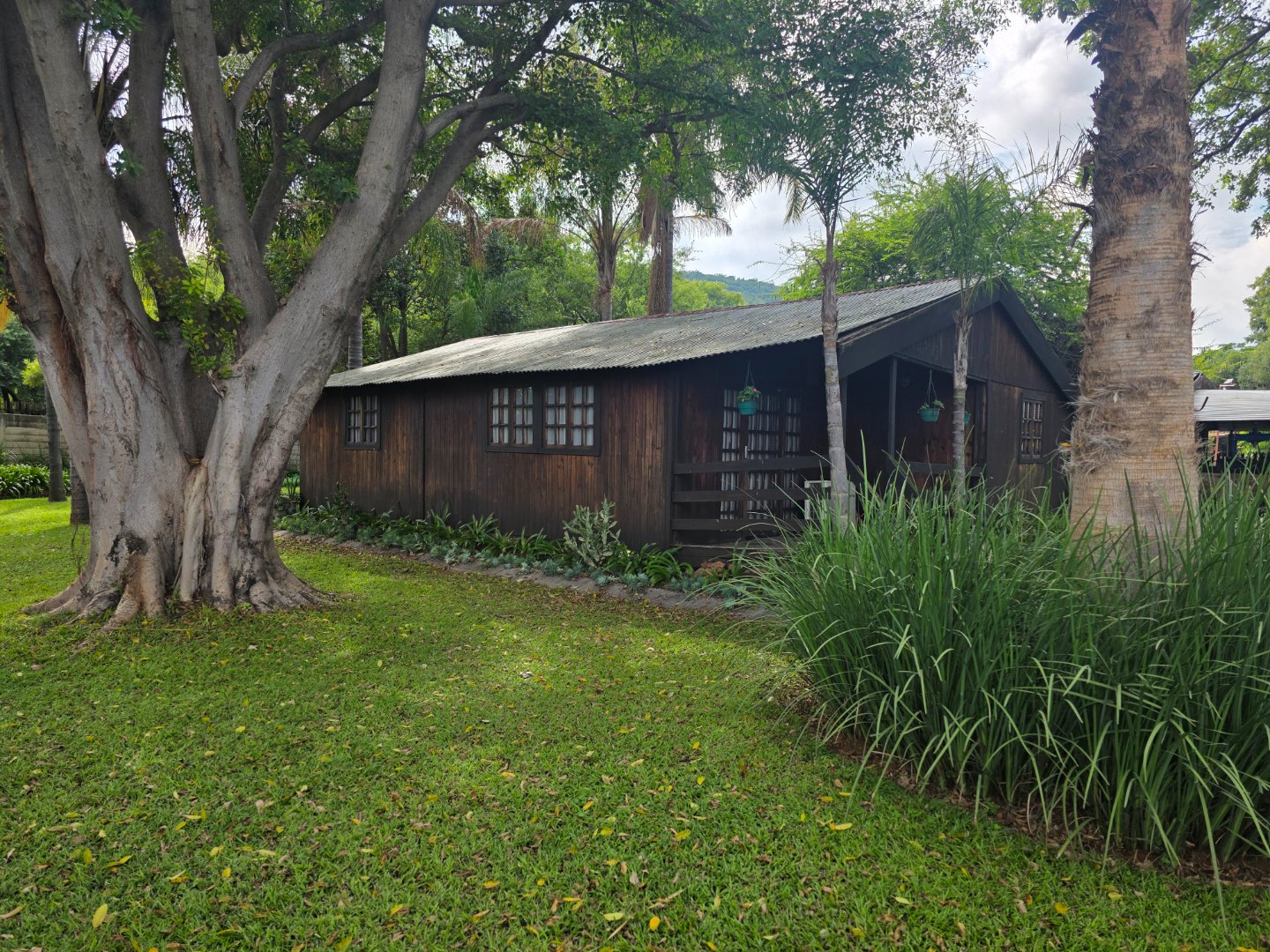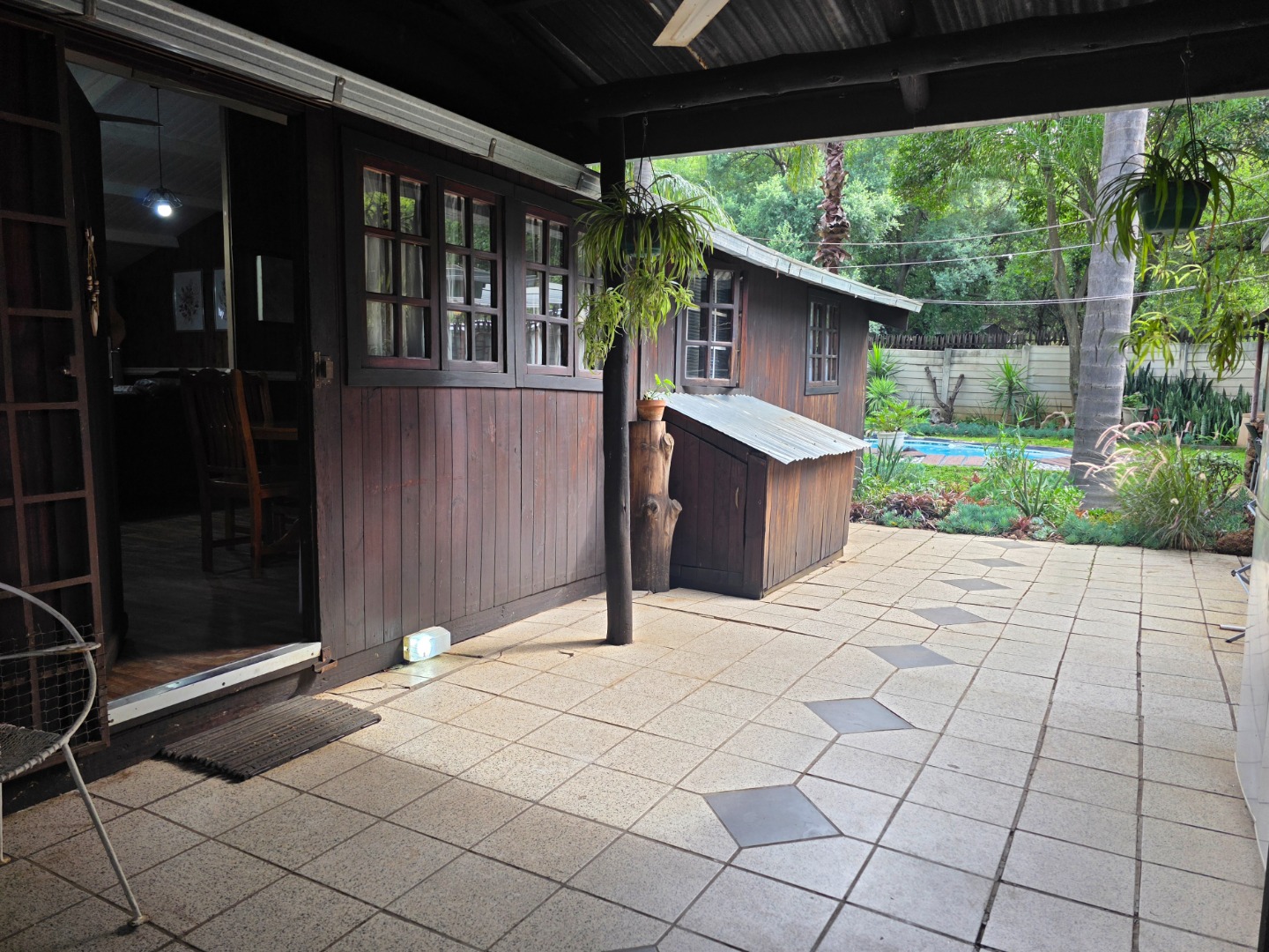 A charming 2-bedroom, 1-bathroom timber home with a warm, inviting feel. Features include a spacious covered braai area, a sparkling swimming pool, a large workshop/storage shed, and stunning established gardens with lush green lawns and mature trees.