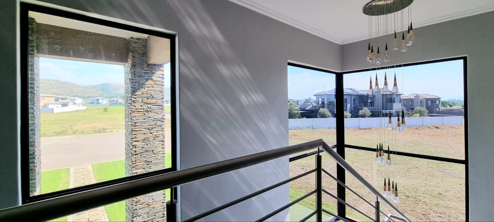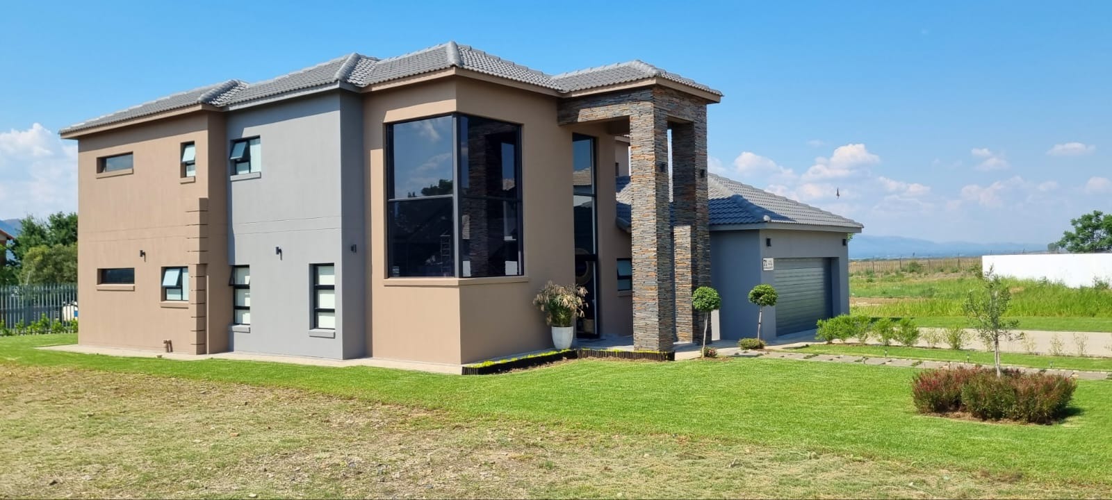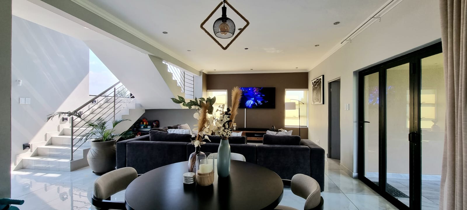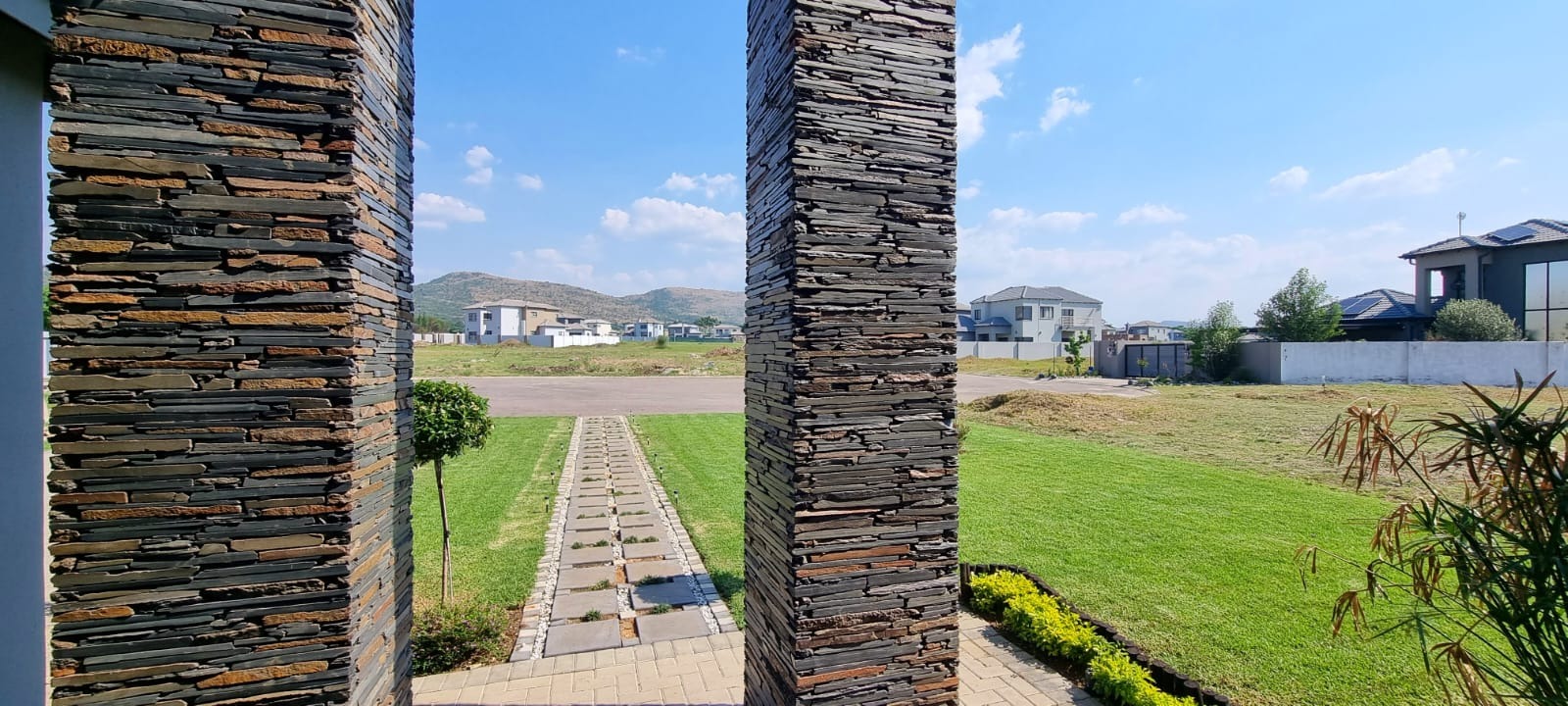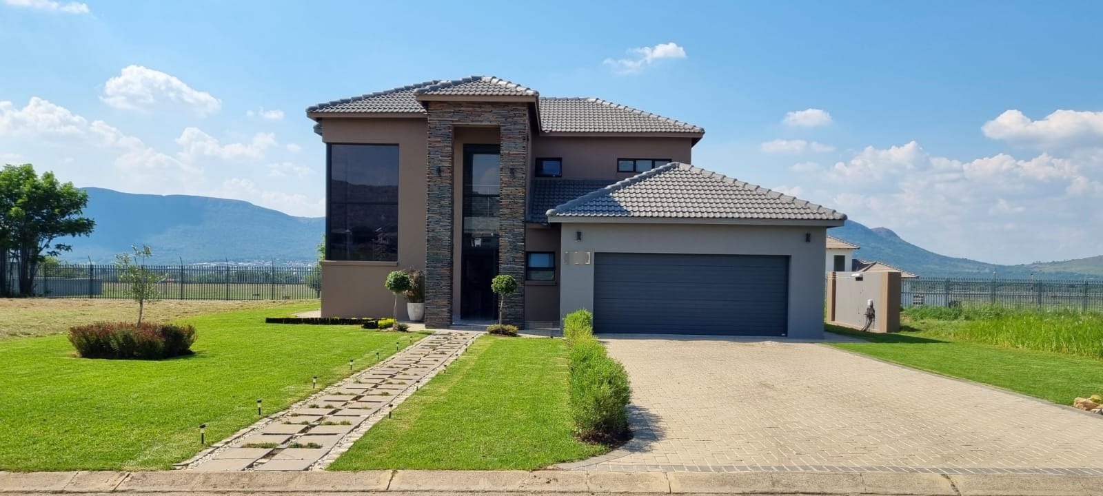 Discover modern living in this exquisite four-bedroom residence, perfectly situated within the secure Everglades Estate in Hartbeespoort. This contemporary two-story home immediately impresses with its stylish brown and grey facade, accented by elegant stone cladding and large tinted windows, all set against a backdrop of scenic mountain views. A well-maintained front lawn and paved driveway enhance its kerb appeal.