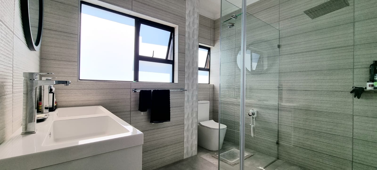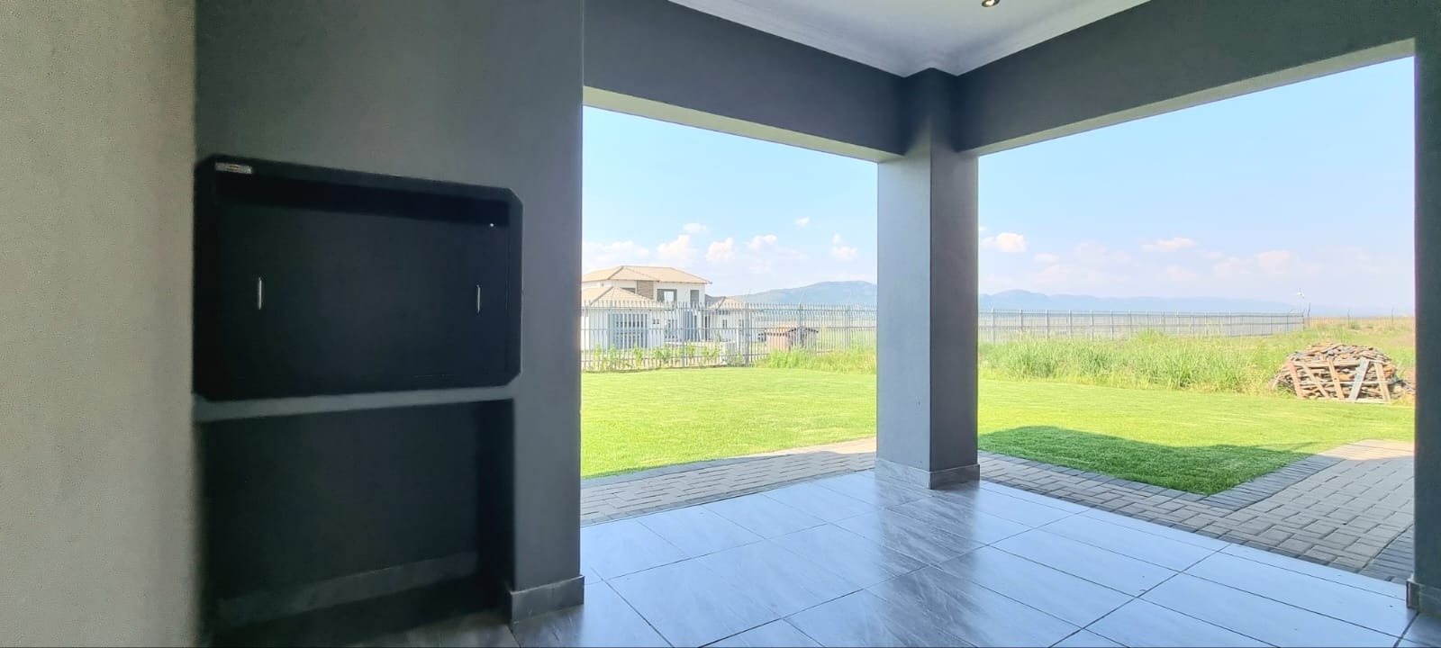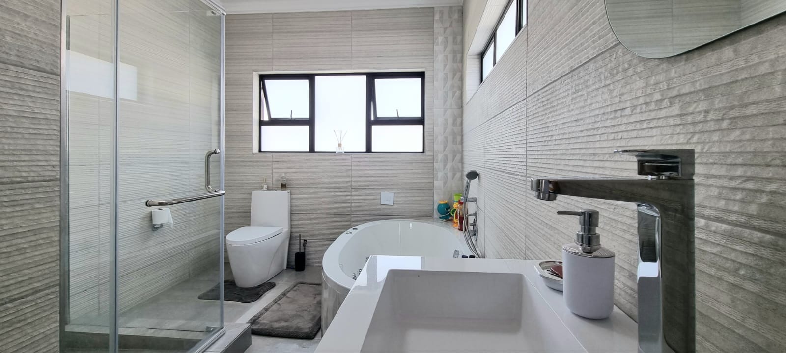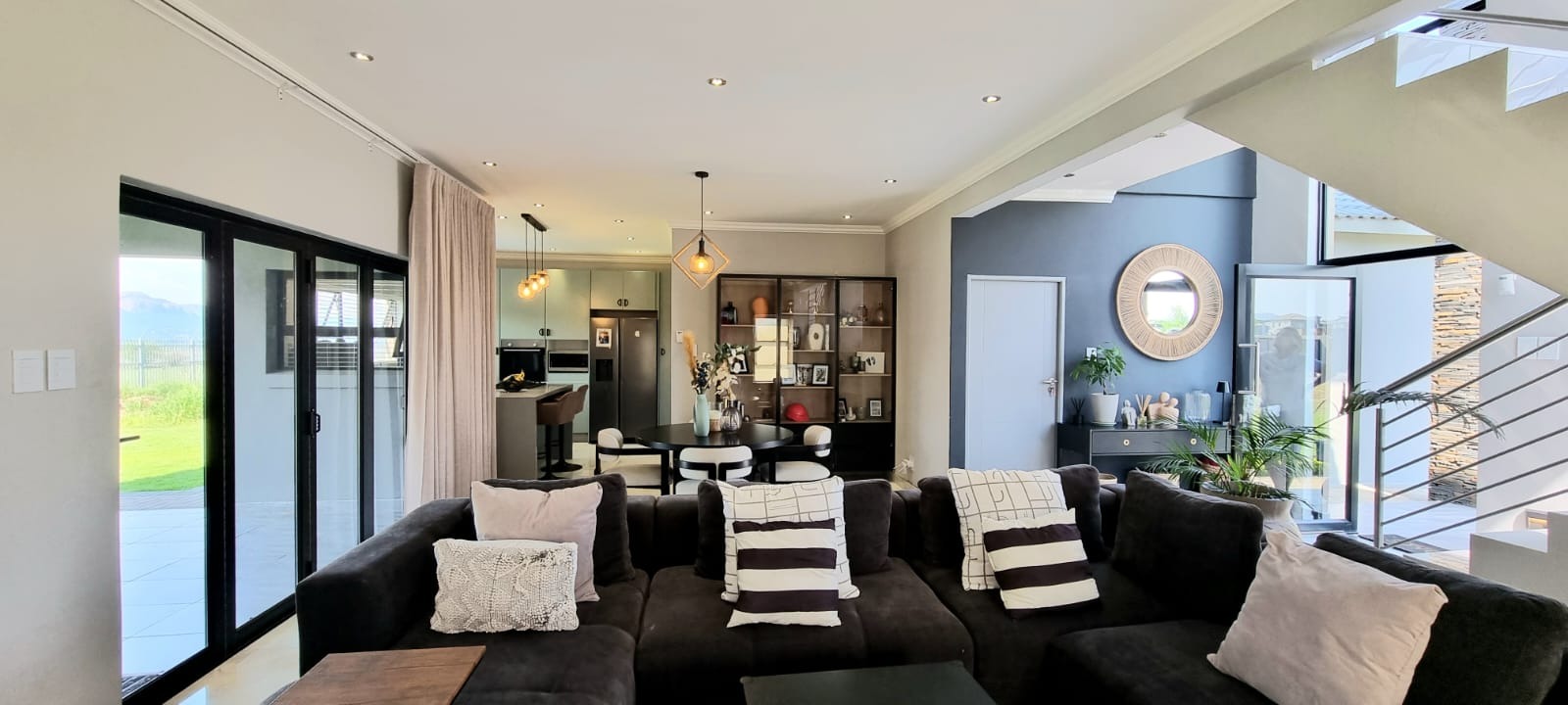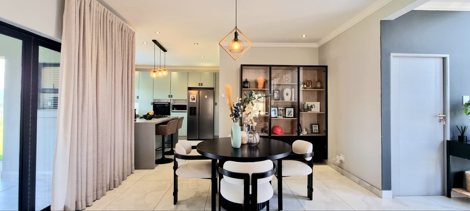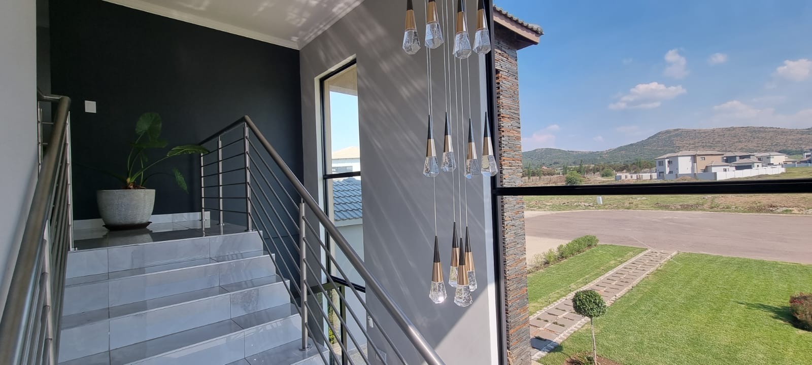 Discover modern living in this exquisite four-bedroom residence, perfectly situated within the secure Everglades Estate in Hartbeespoort. This contemporary two-story home immediately impresses with its stylish brown and grey facade, accented by elegant stone cladding and large tinted windows, all set against a backdrop of scenic mountain views. A well-maintained front lawn and paved driveway enhance its kerb appeal.