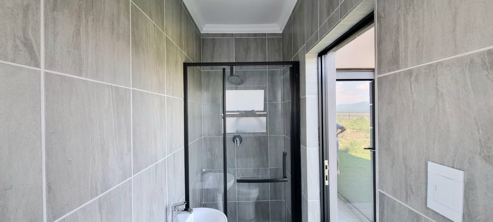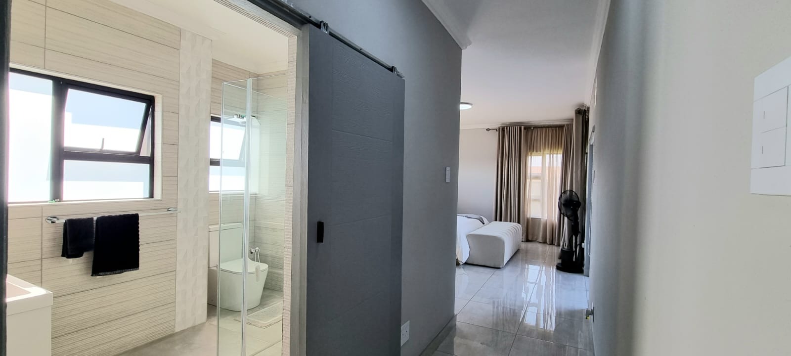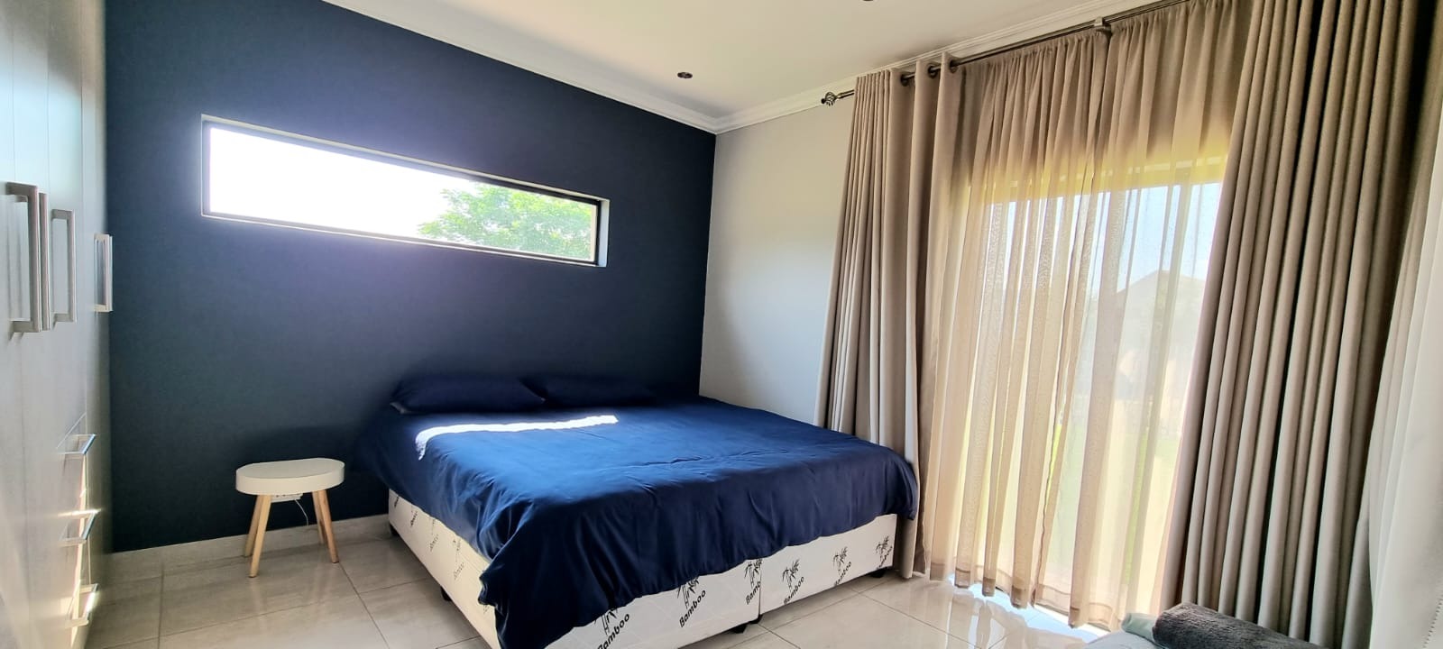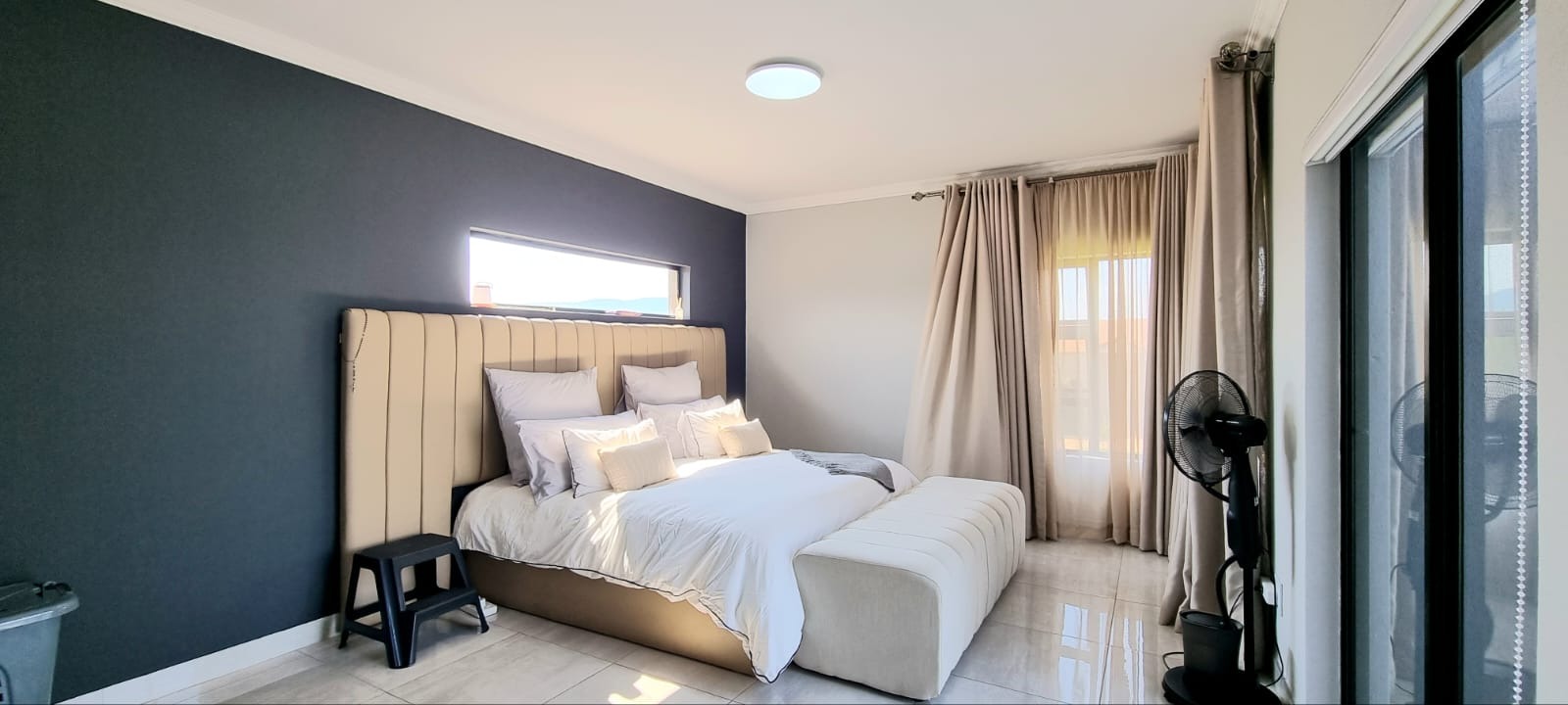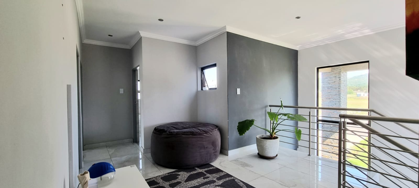 Discover modern living in this exquisite four-bedroom residence, perfectly situated within the secure Everglades Estate in Hartbeespoort. This contemporary two-story home immediately impresses with its stylish brown and grey facade, accented by elegant stone cladding and large tinted windows, all set against a backdrop of scenic mountain views. A well-maintained front lawn and paved driveway enhance its kerb appeal.