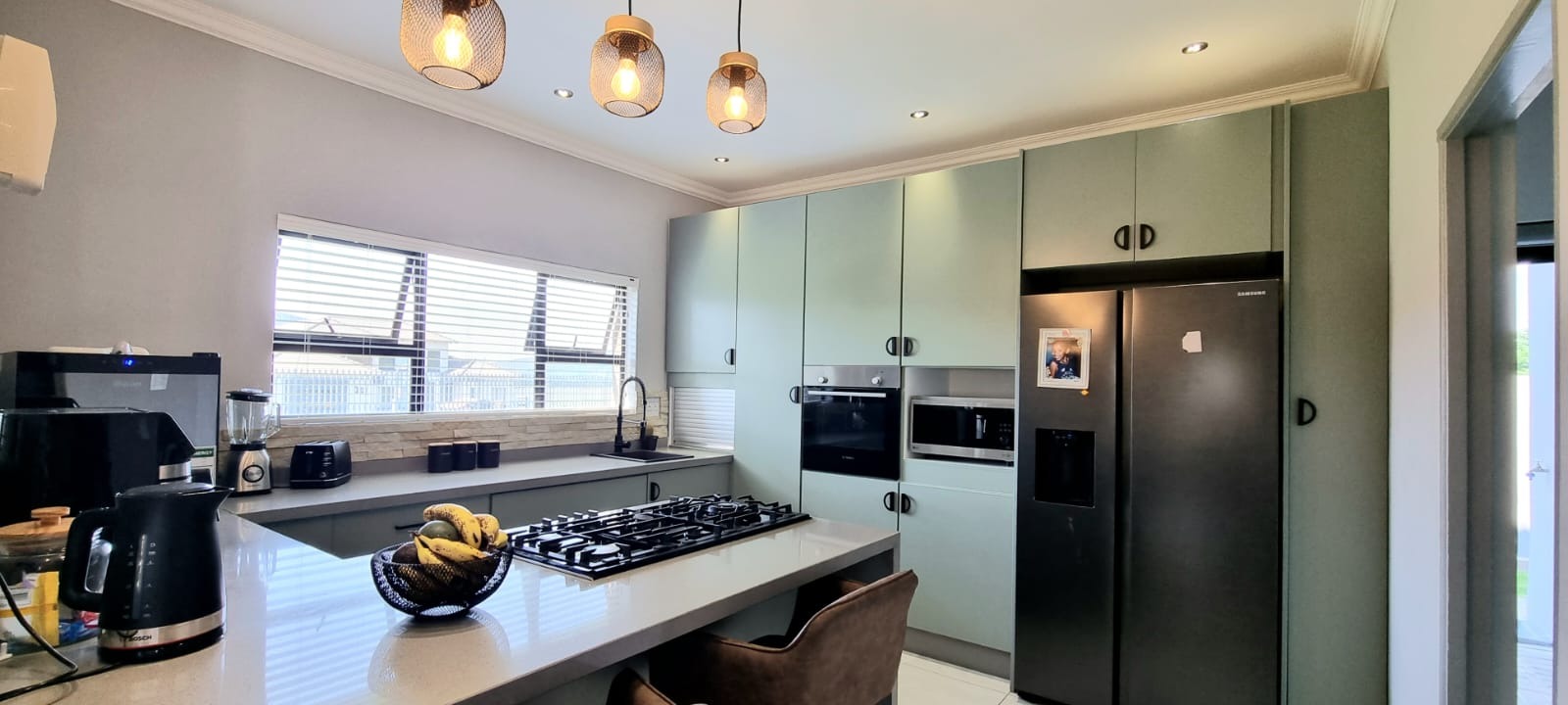 The heart of the home is its modern kitchen, featuring chic mint green cabinetry, an island with an integrated gas hob, and built-in appliances. This functional space flows effortlessly into the dining area, ideal for both everyday meals and entertaining. The residence offers four comfortable bedrooms, including two with private en-suite bathrooms, complemented by an additional 1.5 bathrooms, one of which features a luxurious spa bath, and a convenient guest toilet. A dedicated laundry room adds to the home's practicality.