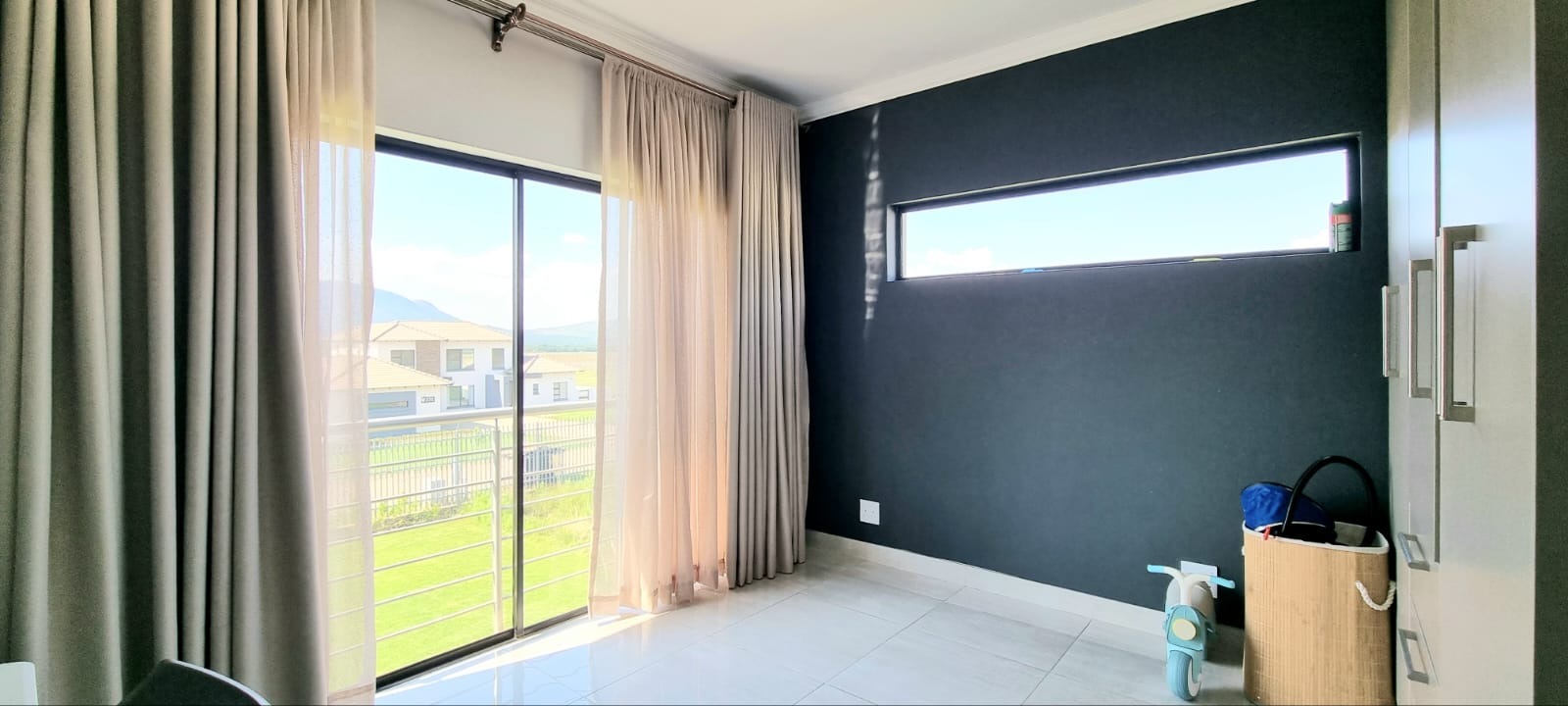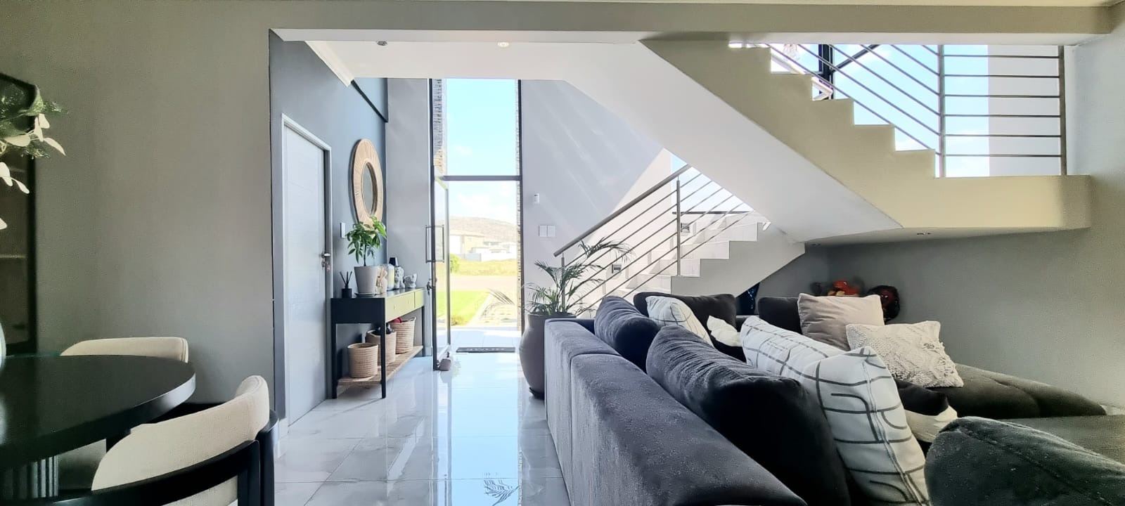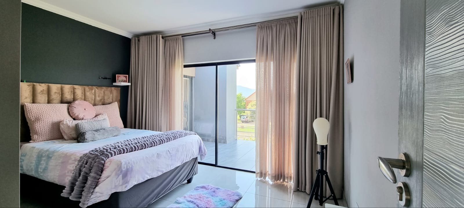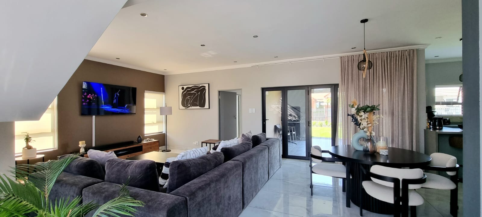 Discover modern living in this exquisite four-bedroom residence, perfectly situated within the secure Everglades Estate in Hartbeespoort. This contemporary two-story home immediately impresses with its stylish brown and grey facade, accented by elegant stone cladding and large tinted windows, all set against a backdrop of scenic mountain views. A well-maintained front lawn and paved driveway enhance its kerb appeal.