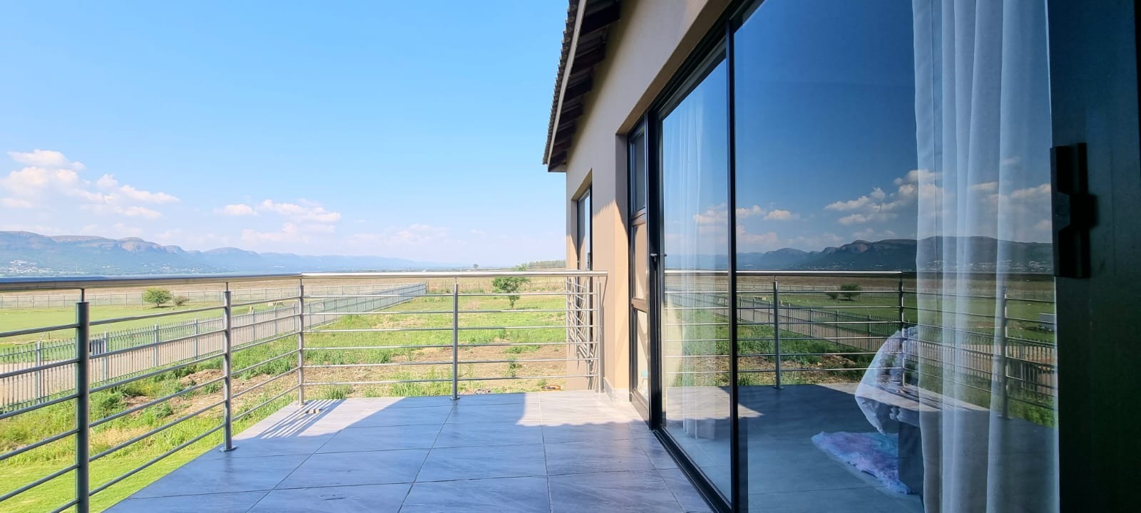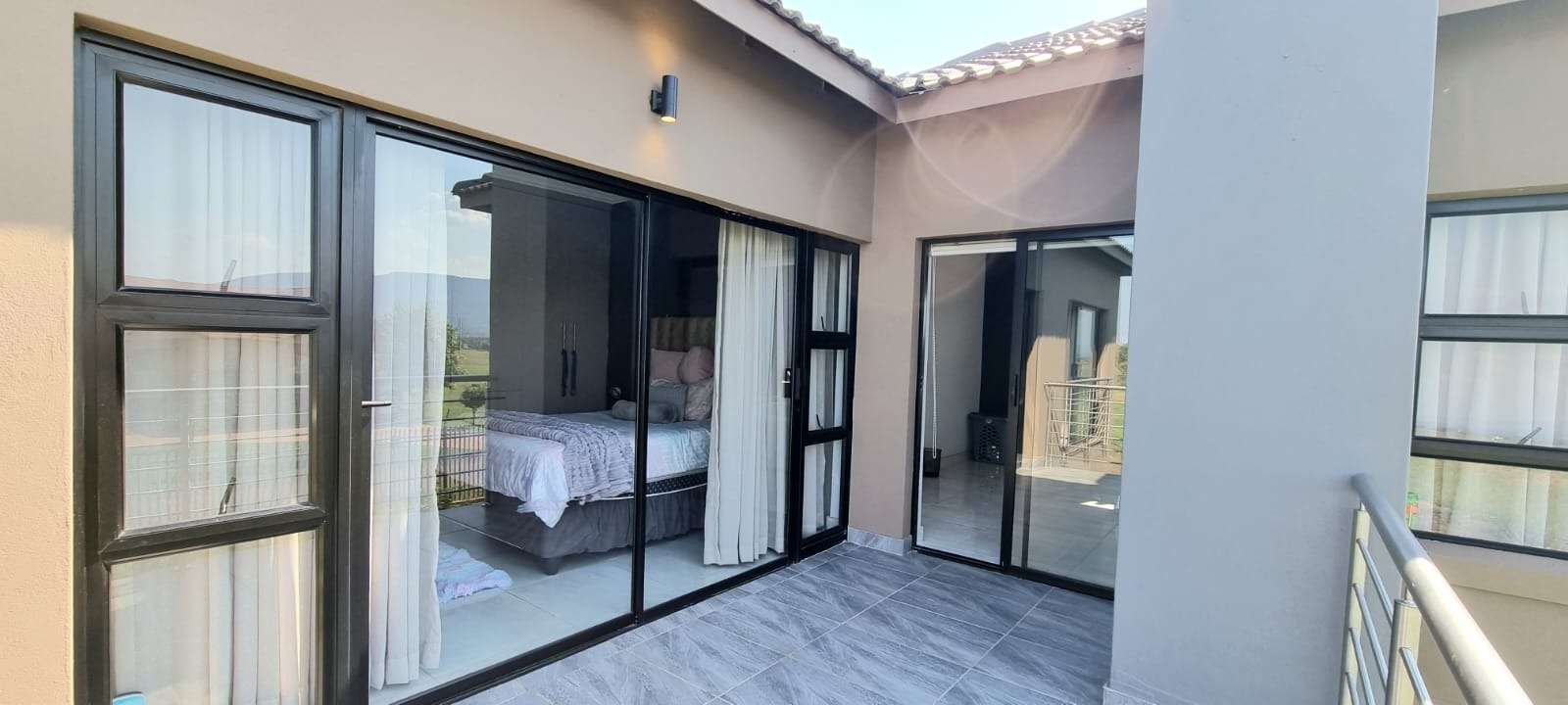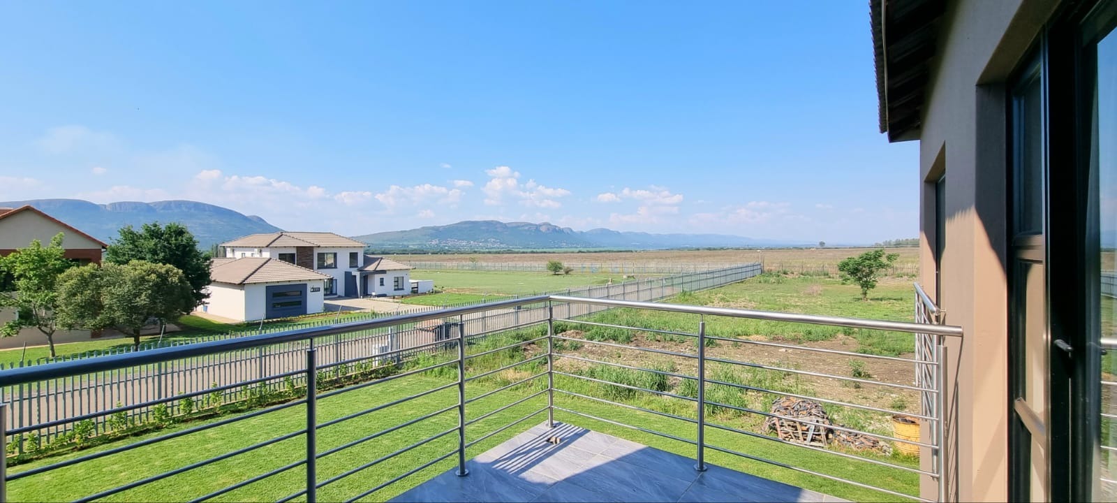 Discover modern living in this exquisite four-bedroom residence, perfectly situated within the secure Everglades Estate in Hartbeespoort. This contemporary two-story home immediately impresses with its stylish brown and grey facade, accented by elegant stone cladding and large tinted windows, all set against a backdrop of scenic mountain views. A well-maintained front lawn and paved driveway enhance its kerb appeal.