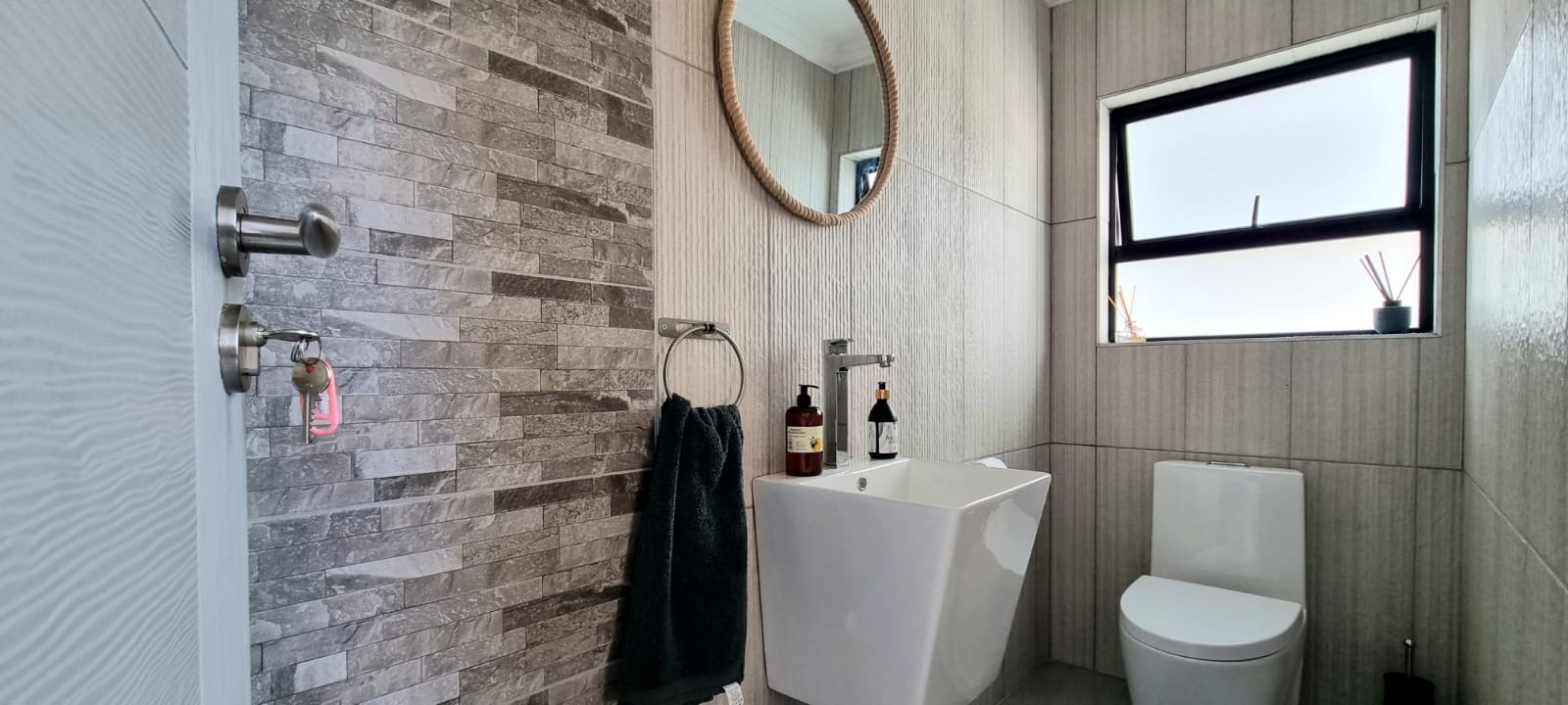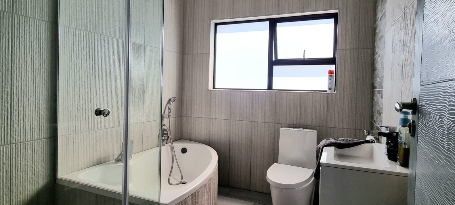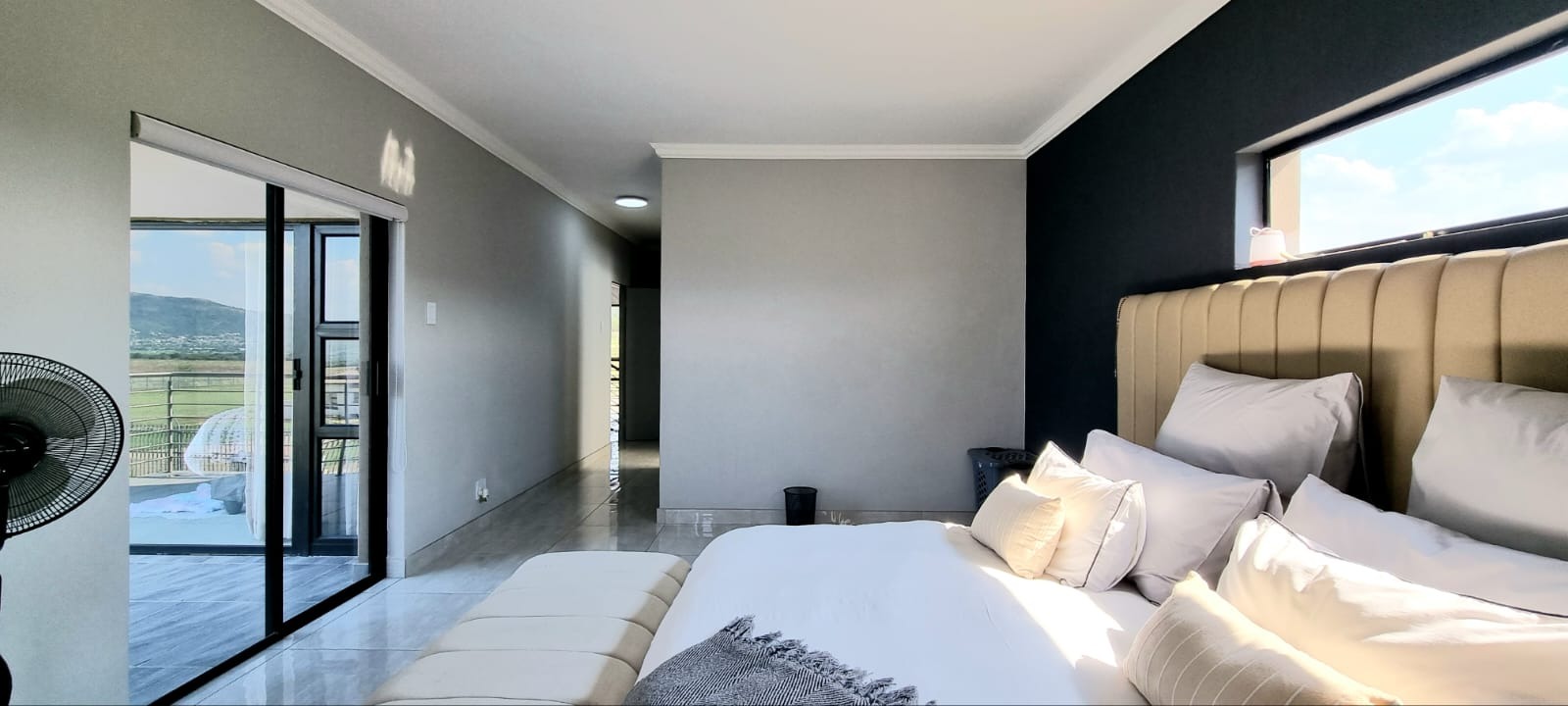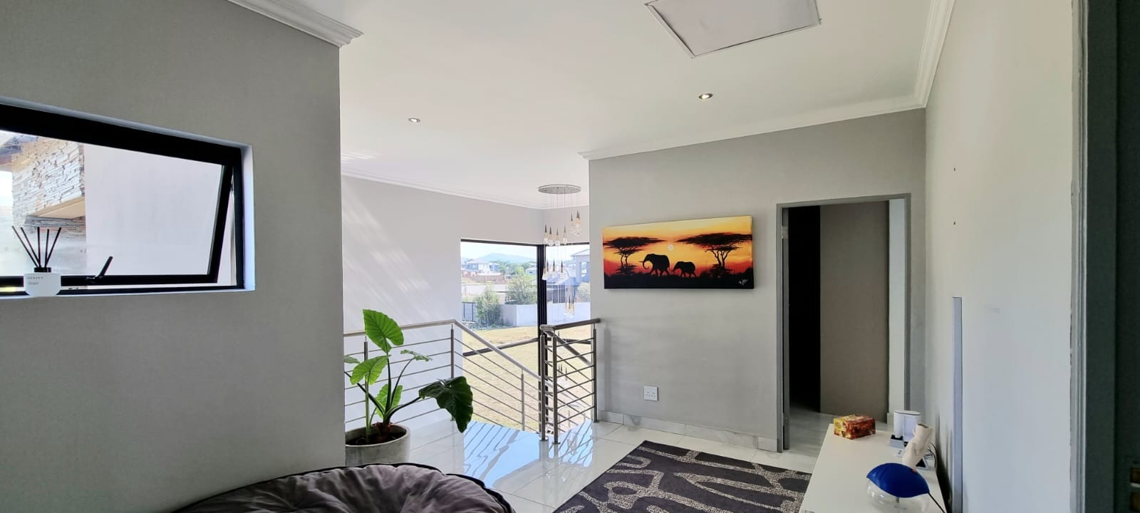 Discover modern living in this exquisite four-bedroom residence, perfectly situated within the secure Everglades Estate in Hartbeespoort. This contemporary two-story home immediately impresses with its stylish brown and grey facade, accented by elegant stone cladding and large tinted windows, all set against a backdrop of scenic mountain views. A well-maintained front lawn and paved driveway enhance its kerb appeal.