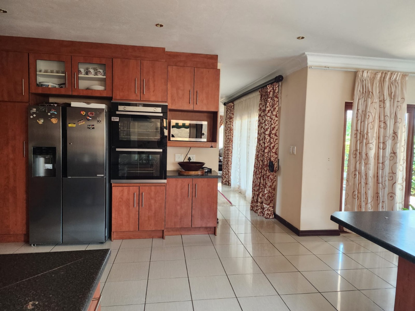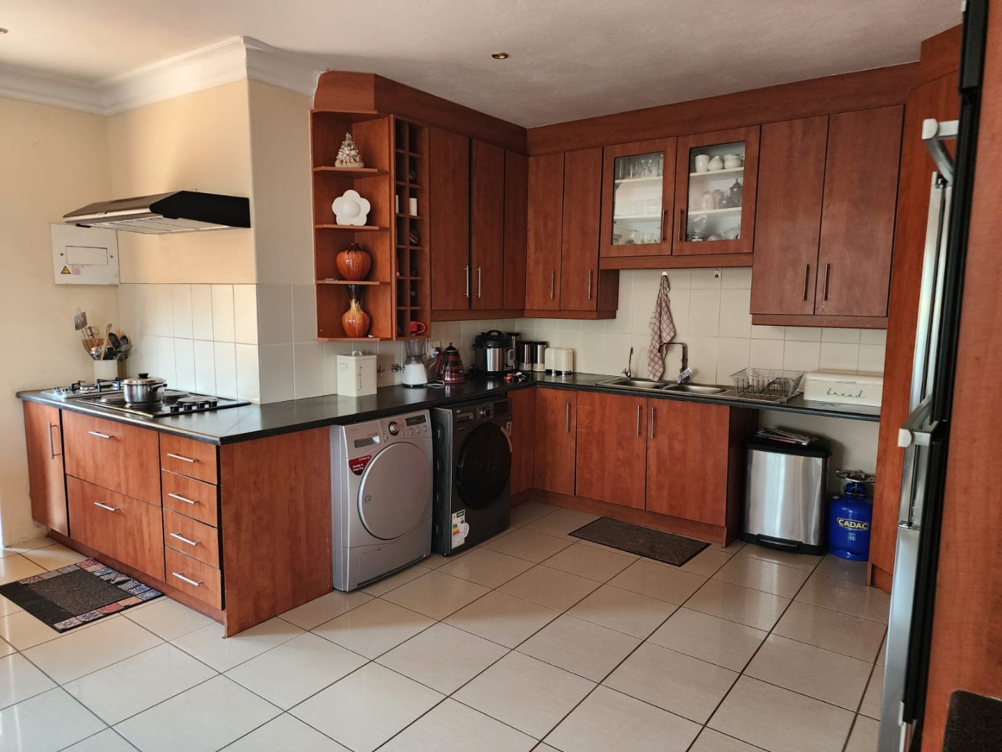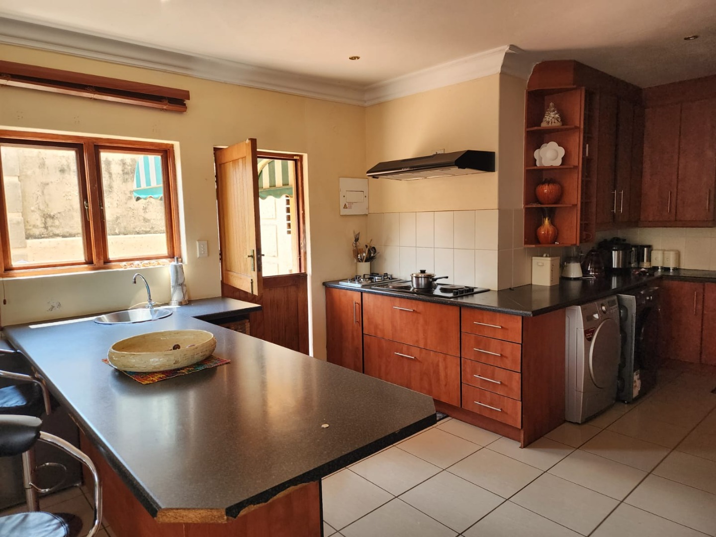 The functional kitchen features ample wooden cabinetry, dark countertops, a gas hob with extractor fan, double sink, and space for a washing machine and dryer. Accommodation includes three comfortable bedrooms, one en-suite, an additional full bathroom, and a guest toilet, plus staff quarters. Outdoors you’ll find a built-in braai, a well-kept garden, a double garage, and extra parking. With 24-hour security, electric fencing, access control, and pet-friendly living, this home offers a peaceful, secure lifestyle in one of Hartbeespoort’s most scenic estates.