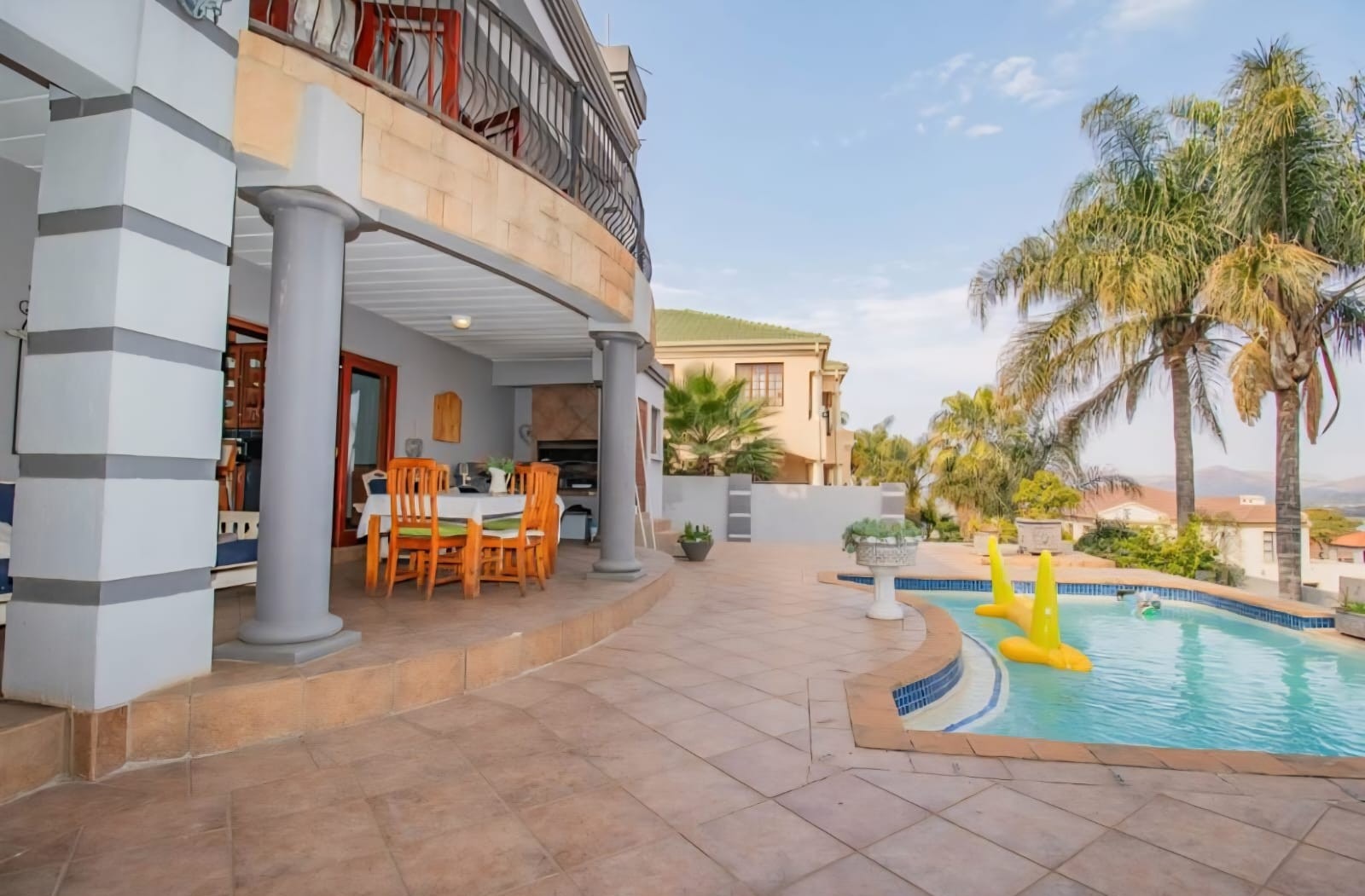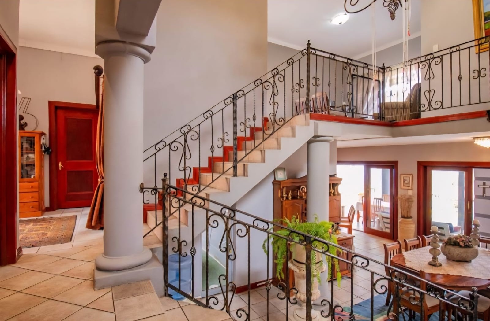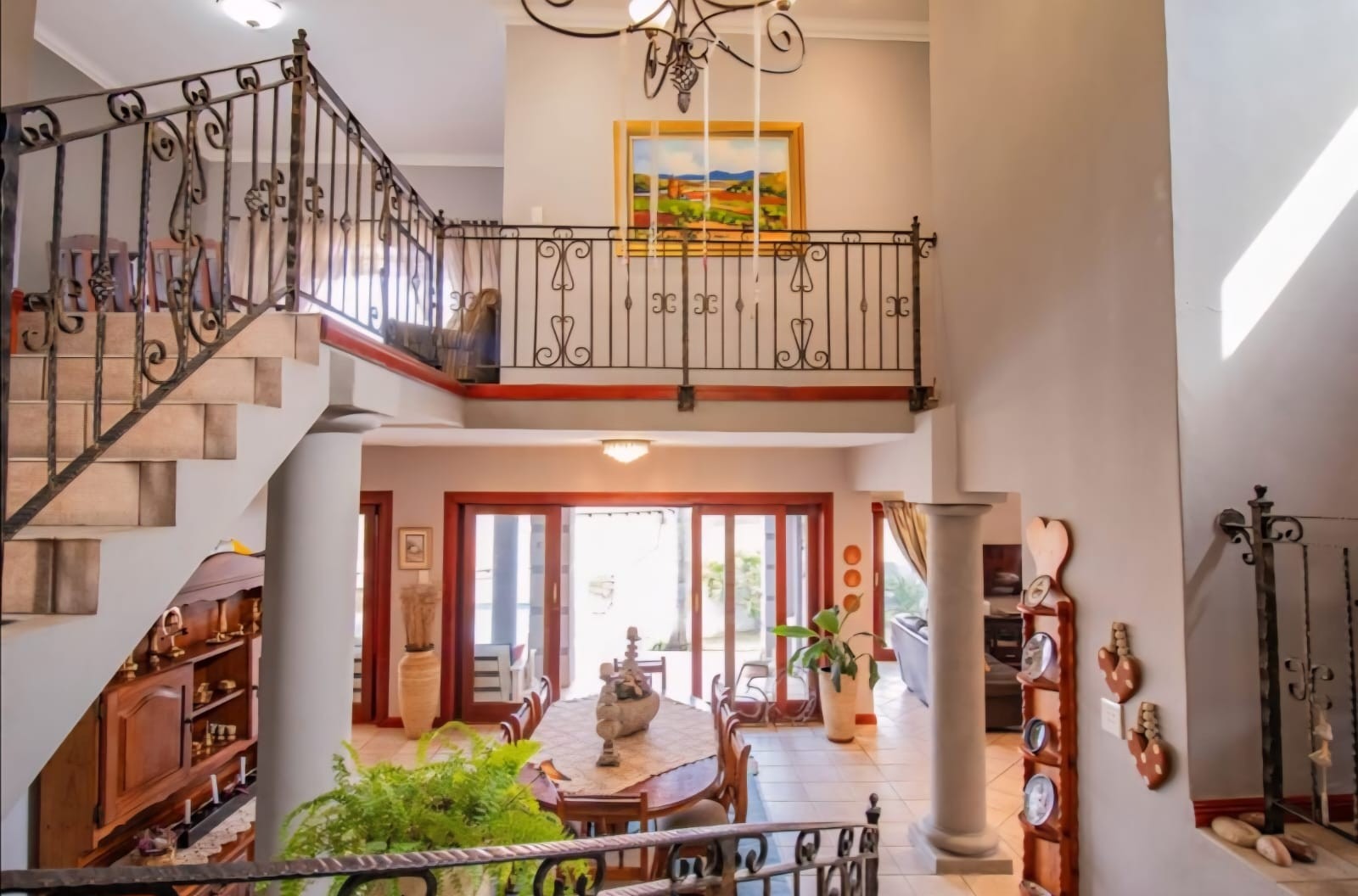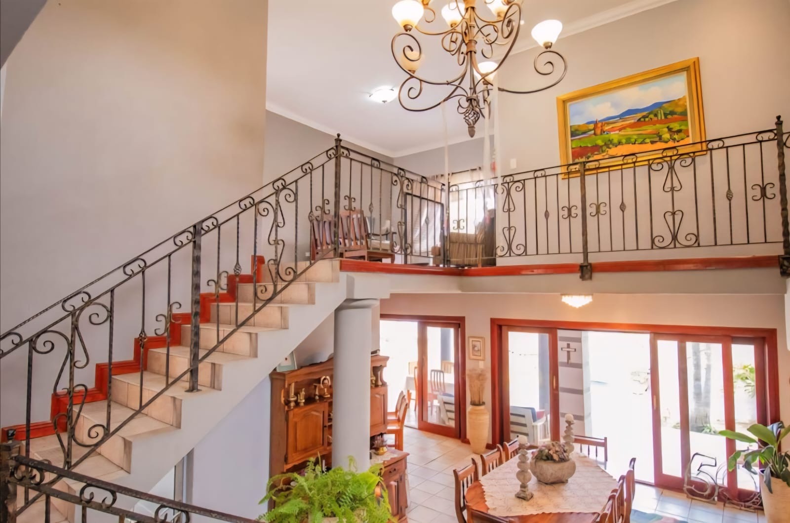 Exquisite double-storey home in Kosmos Ridge Estate, nestled at the foot of the Magaliesberg, offering secure estate living and breathtaking views of the Hartbeespoort Dam. This light-filled family residence welcomes you with a grand entrance, statement chandelier, and sweeping staircase that sets the tone for elegant living. Designed for both comfort and entertaining, the home boasts an expansive open-plan layout with high ceilings, two spacious lounges, a dining area, and a beautifully appointed kitchen featuring a large granite-topped island, ample cabinetry, and quality finishes throughout. Sliding doors seamlessly connect the indoor spaces to a covered stoop with a built-in braai, creating effortless indoor-outdoor flow.