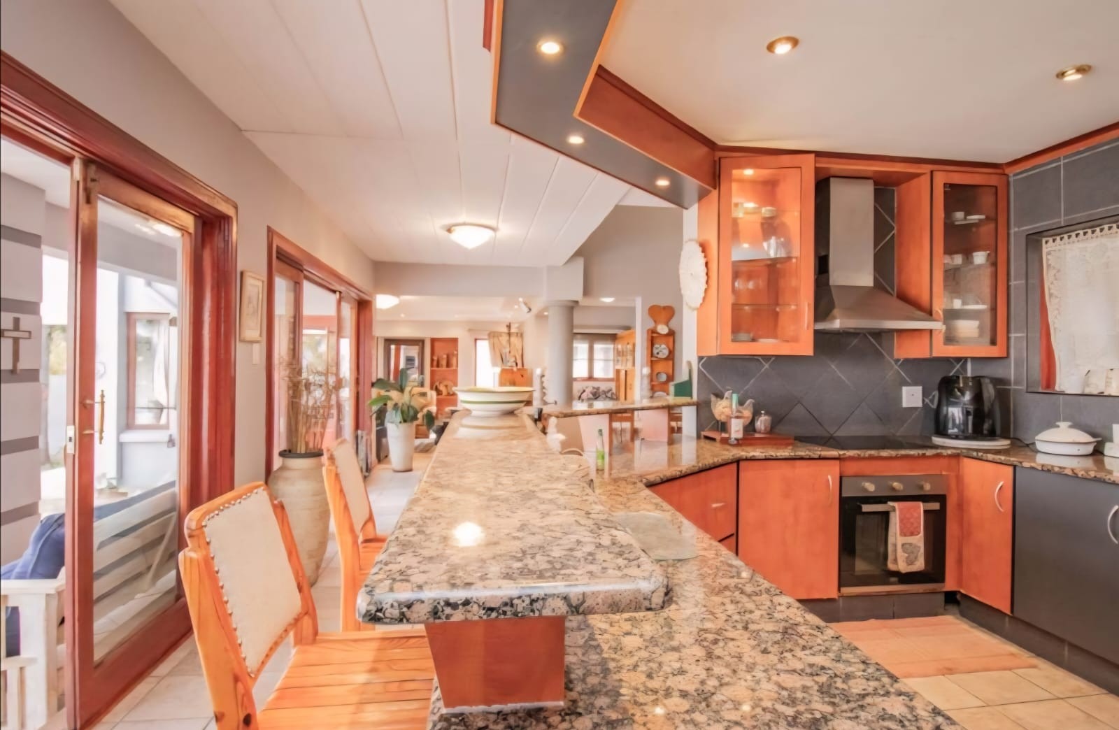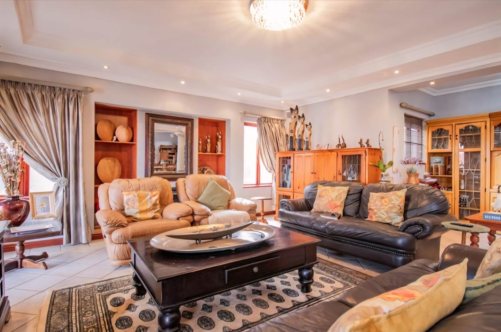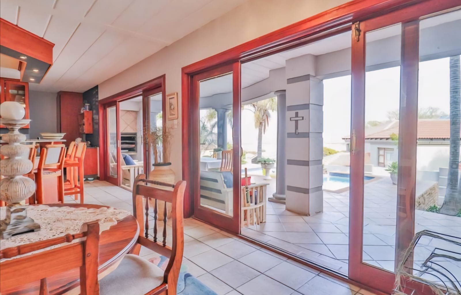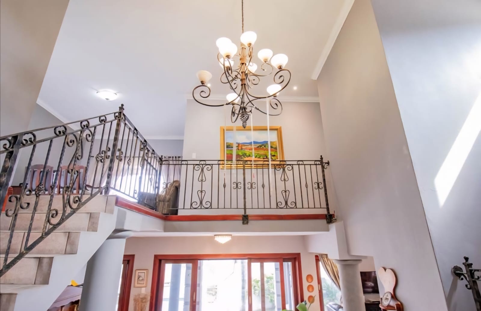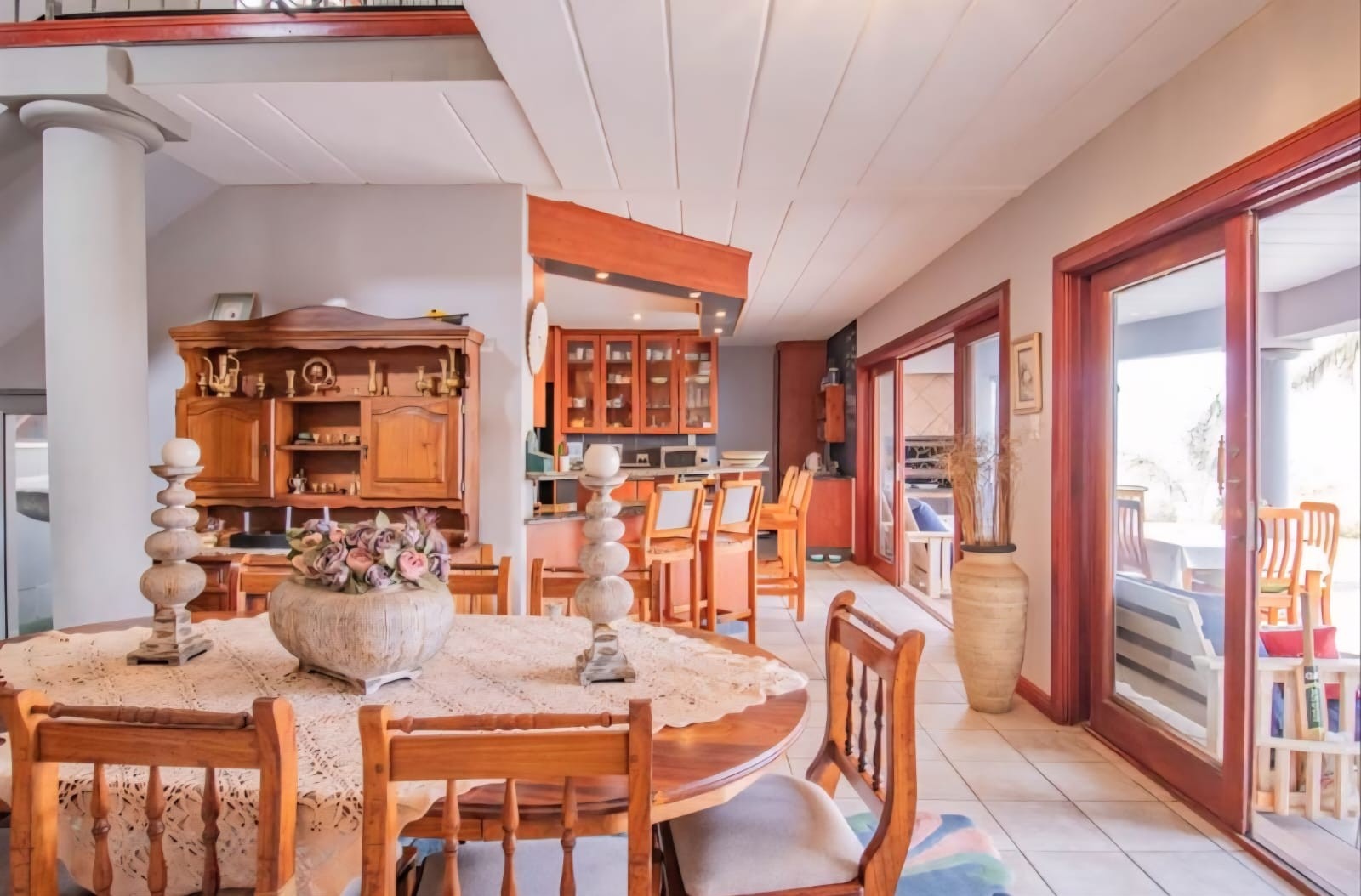 Exquisite double-storey home in Kosmos Ridge Estate, nestled at the foot of the Magaliesberg, offering secure estate living and breathtaking views of the Hartbeespoort Dam. This light-filled family residence welcomes you with a grand entrance, statement chandelier, and sweeping staircase that sets the tone for elegant living. Designed for both comfort and entertaining, the home boasts an expansive open-plan layout with high ceilings, two spacious lounges, a dining area, and a beautifully appointed kitchen featuring a large granite-topped island, ample cabinetry, and quality finishes throughout. Sliding doors seamlessly connect the indoor spaces to a covered stoop with a built-in braai, creating effortless indoor-outdoor flow.