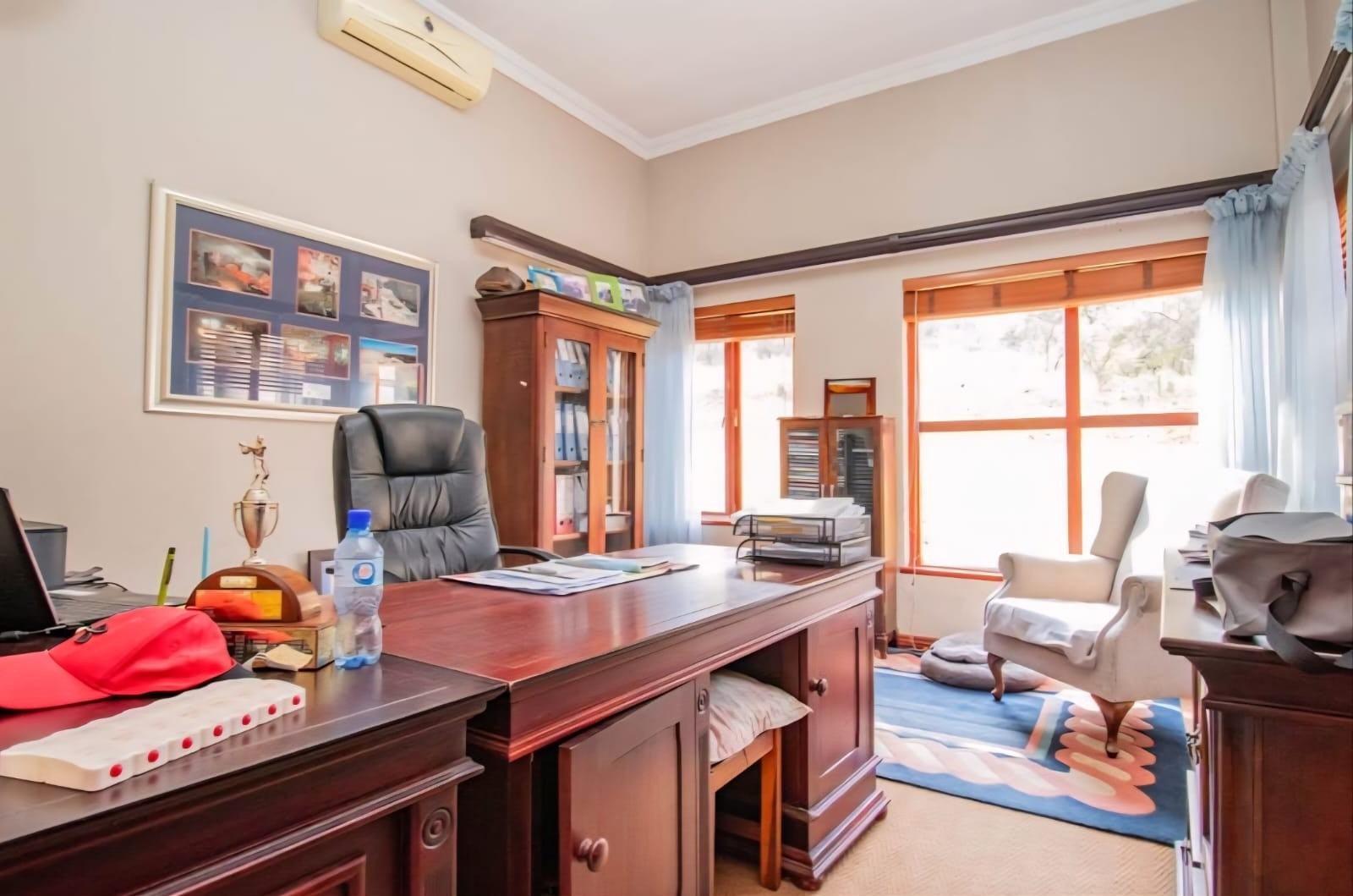 The property offers five generous bedrooms, with one easily convertible into a private study, along with three bathrooms (including an en-suite), a guest toilet, and staff quarters. Air conditioning, a laundry, and pantry add to the home’s practicality. Outside, a sparkling swimming pool, landscaped garden, multiple balconies with scenic lake and mountain views, and a spacious driveway complement the double garage and additional parking. Combining style, space, and versatility, this exceptional home is move-in ready and perfectly positioned to embrace the relaxed Hartbeespoort lifestyle.