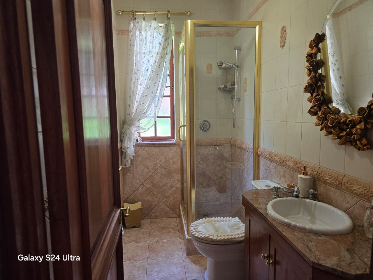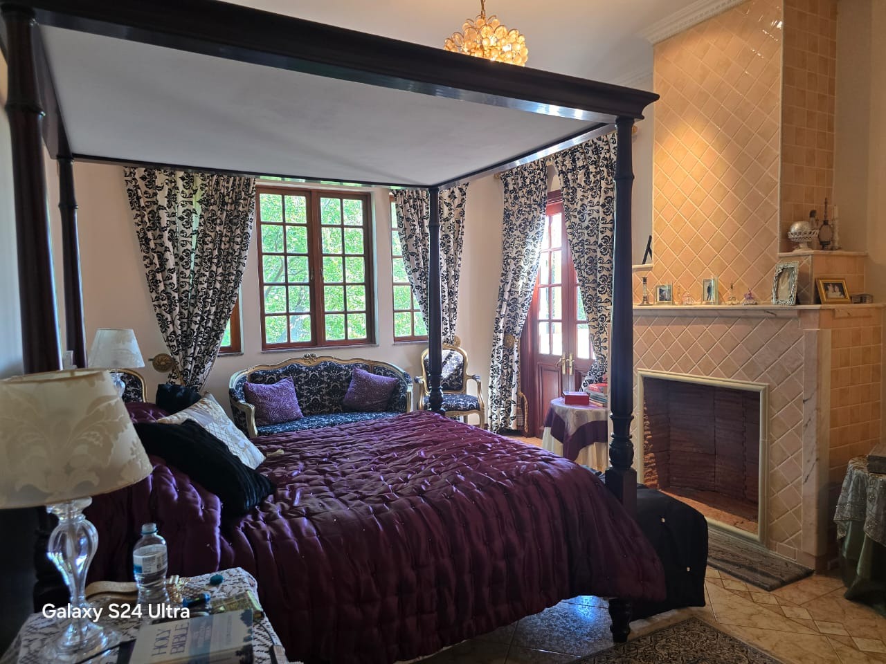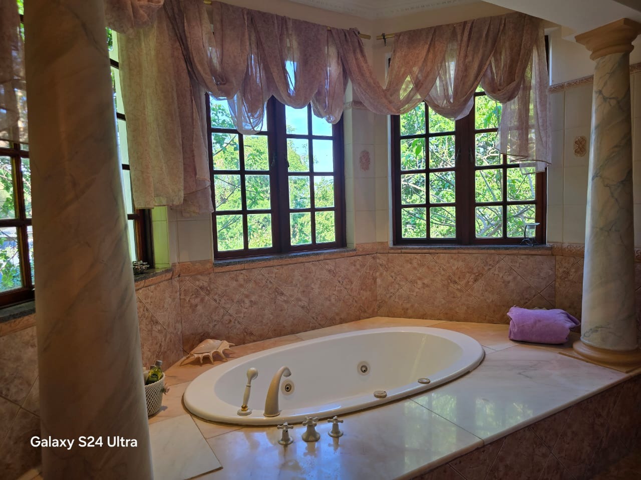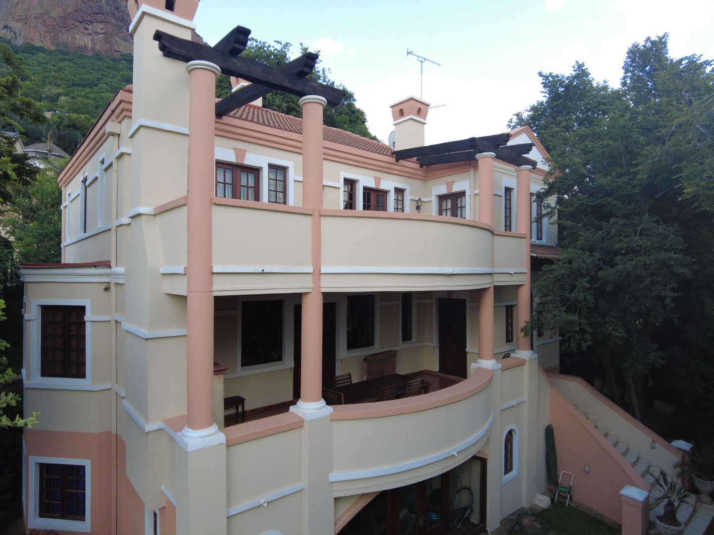 As you enter the double front door, you are greeted by a granite staircase, mirrored walls on the one side and a painted mural on the other. Up or down? The top level offers 2 bedrooms, a family bathroom, lounge with access to a balcony. The third bedroom, the master suite, also on this level, was made with luxurious living in mind, complete with fireplace, access to the balcony, separate dress room, and a bathroom designed for long lazy baths in the spa bath, or enjoying the steam room in the double shower. It also includes a double basin and separate toilet.