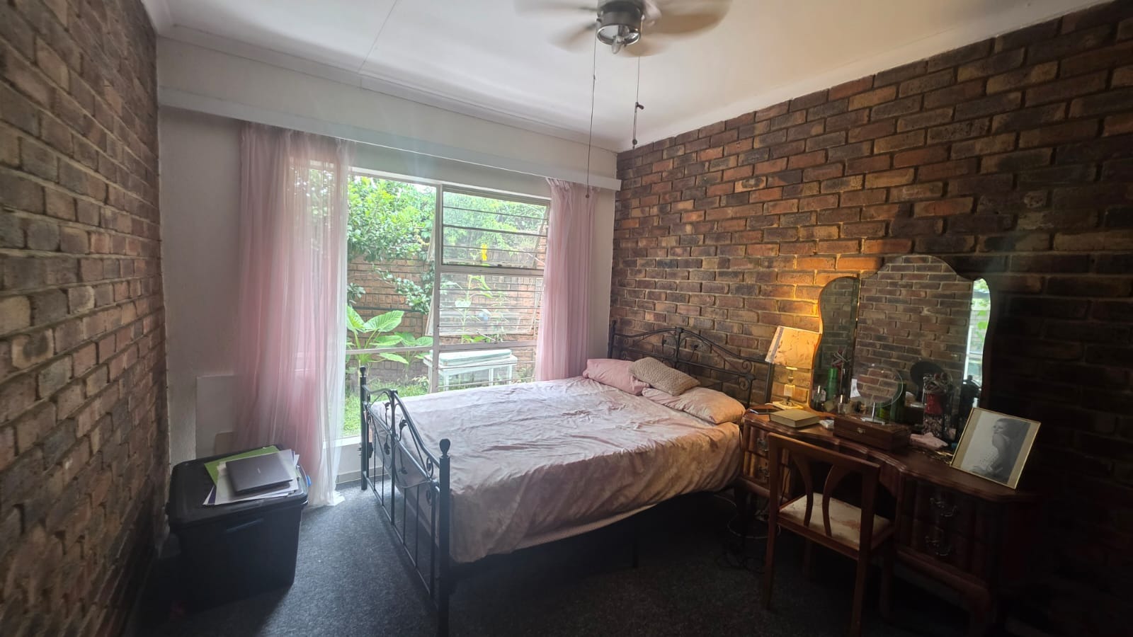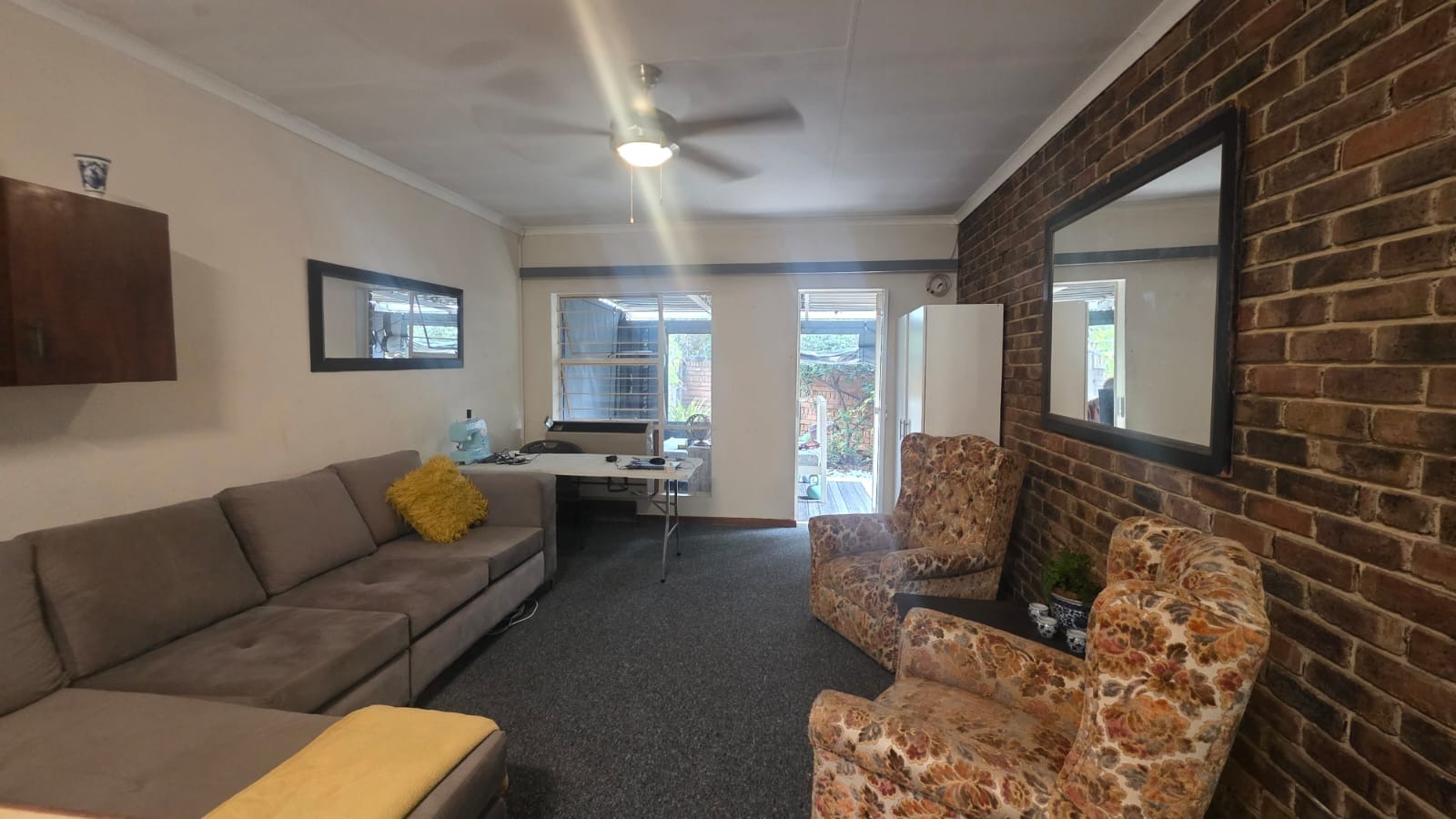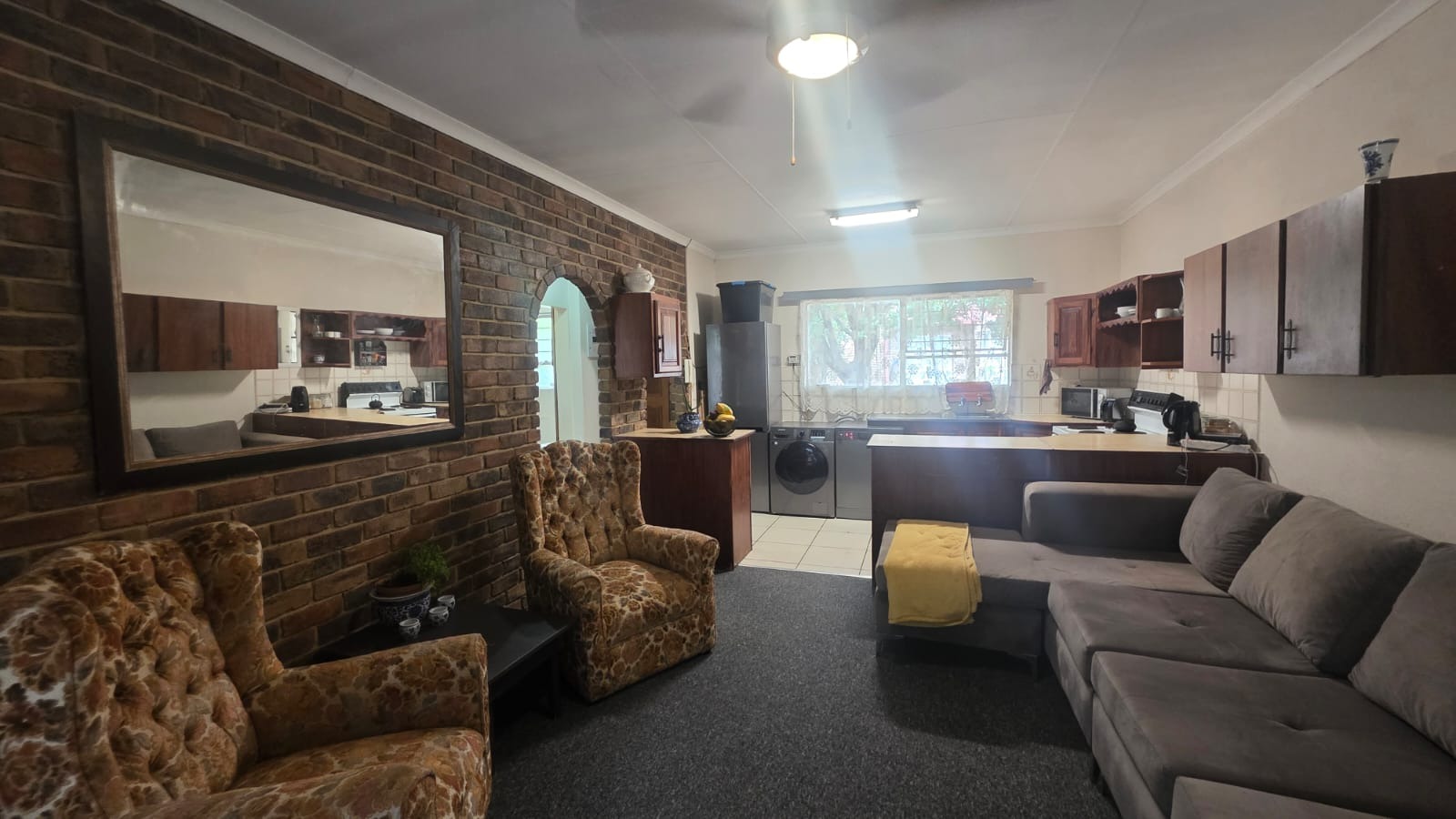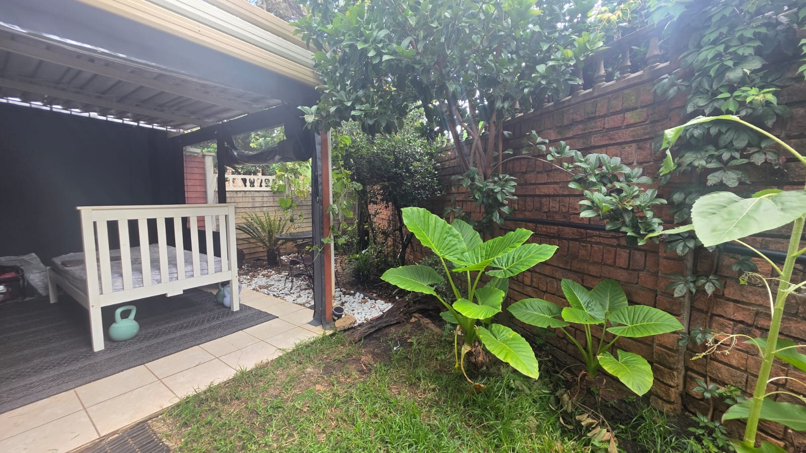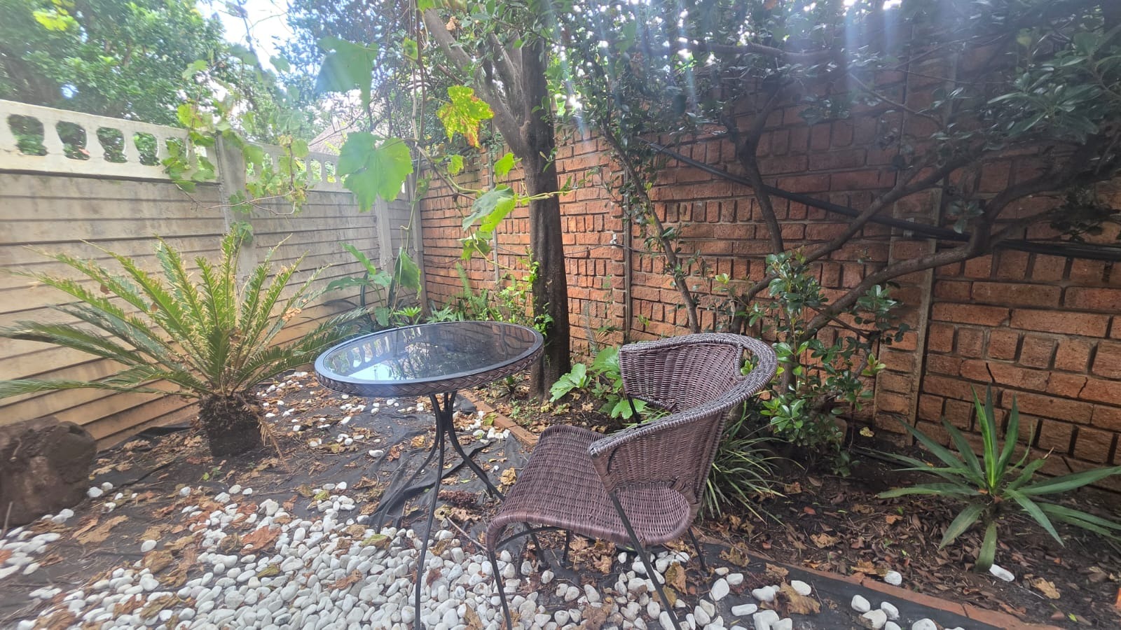 Inside, an open-plan living and kitchen area creates a warm and inviting atmosphere, filled with natural light and complemented by exposed brick accent walls. The functional kitchen includes wooden cabinetry, light countertops, and modern appliances, while the bedroom offers a cosy retreat with a ceiling fan. The bathroom is well-appointed with both a bath and a separate shower. Outdoors, a private seating area and low-maintenance garden provide the perfect space to unwind, all within a secure setting offering peace of mind.