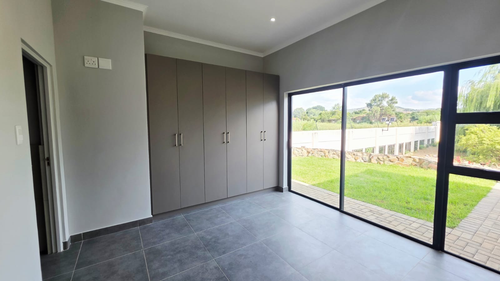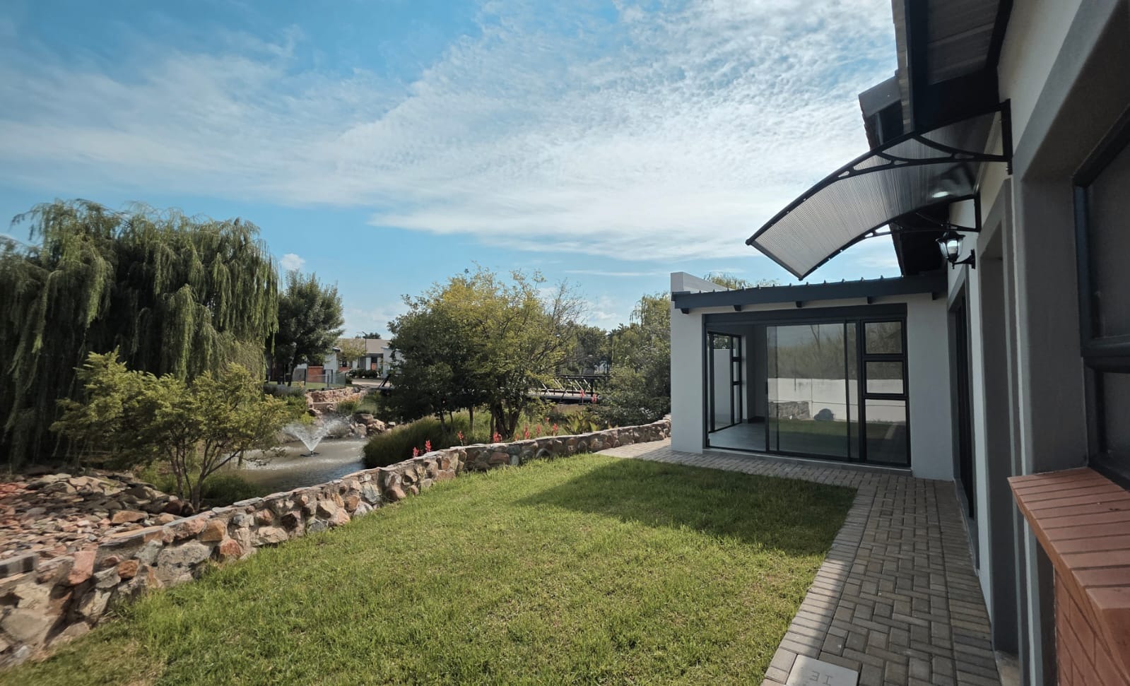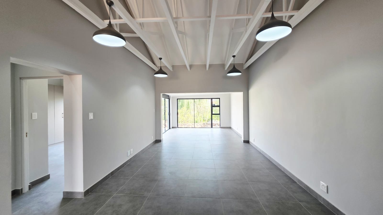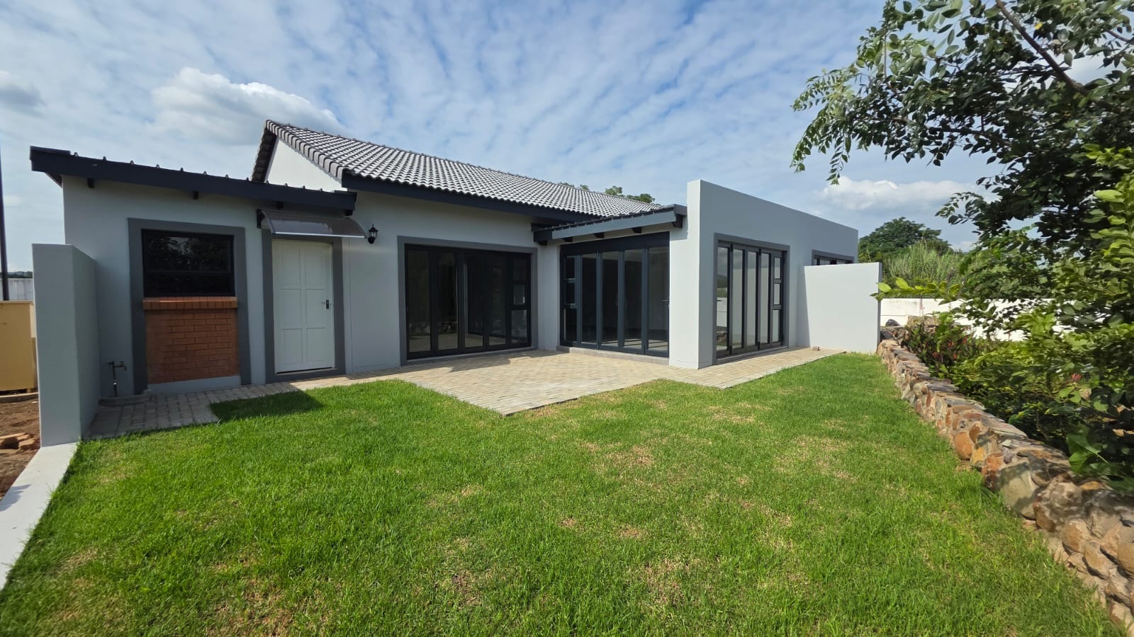 Living room with sliding door opens unto an open patio with built-in braai.