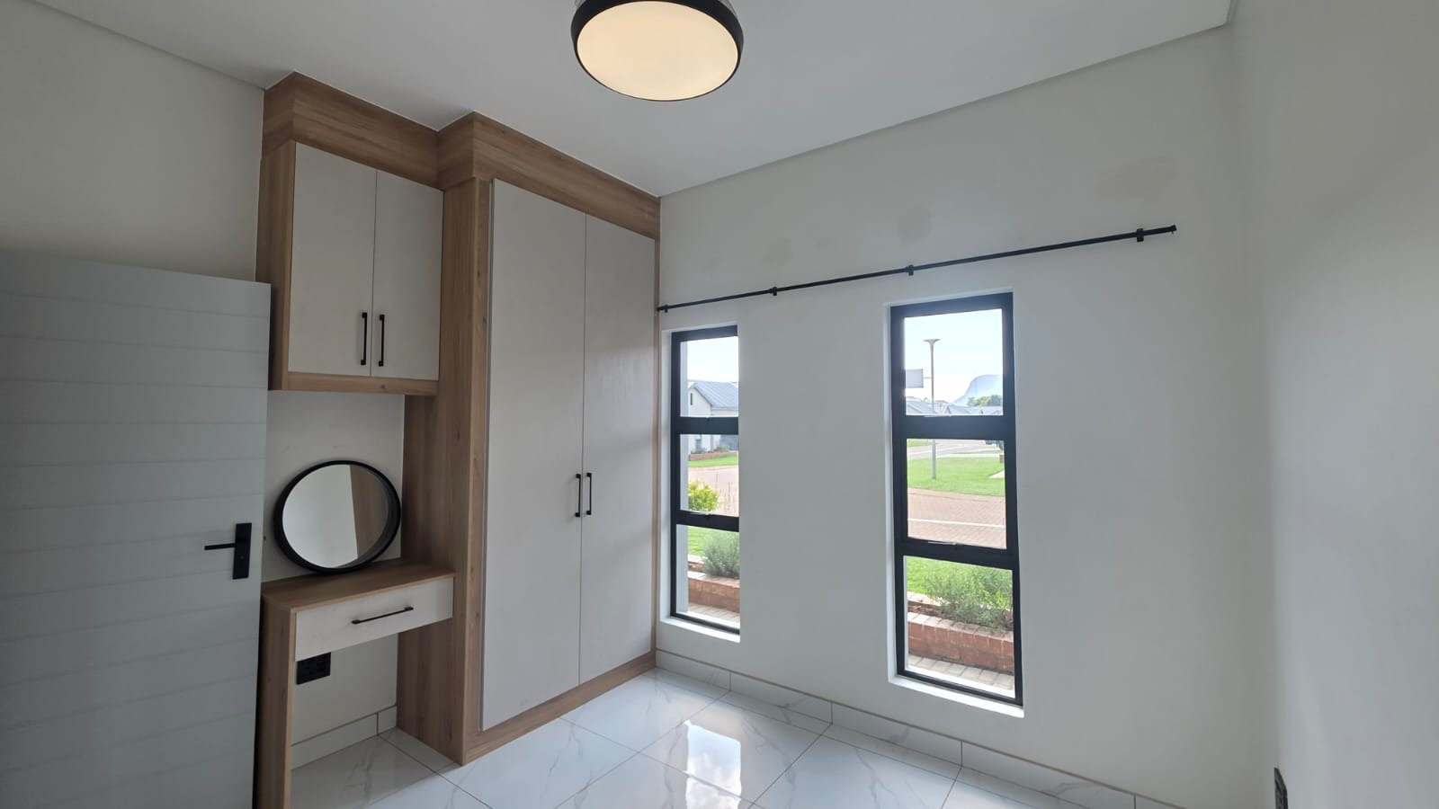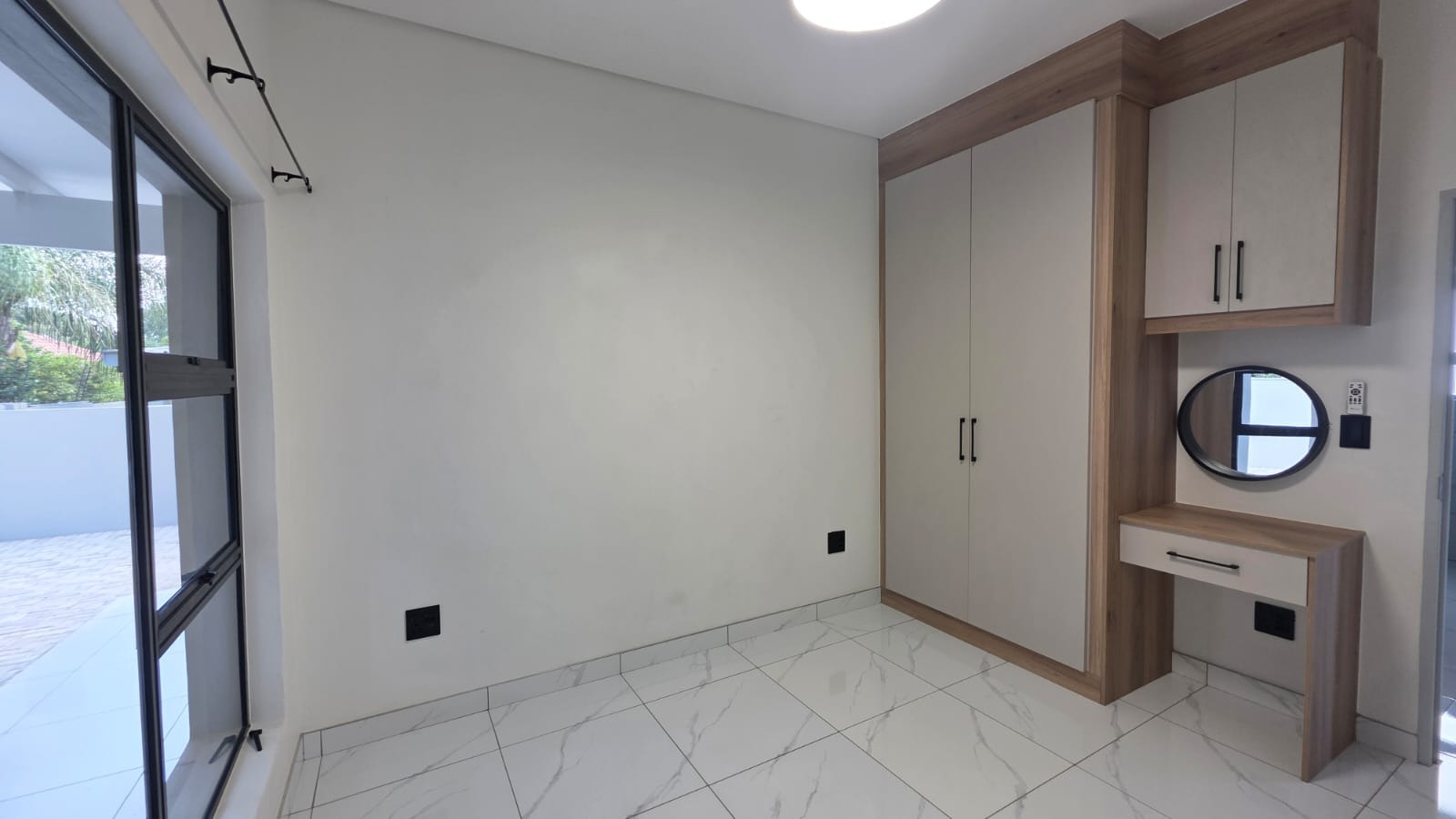 Inside, the bright open-plan living area boasts high vaulted ceilings, abundant natural light, and elegant marble-look tiled flooring, flowing seamlessly into a modern kitchen with light cabinetry, white countertops, a new gas hob, oven, and separate laundry area. Three comfortable bedrooms include built-in cupboards, with one en-suite, while the stylish bathrooms feature black fixtures, floating vanities, and a glass-enclosed shower. Sliding doors lead to a patio and garden, ideal for relaxed outdoor living, with two parking spaces and pets allowed.
