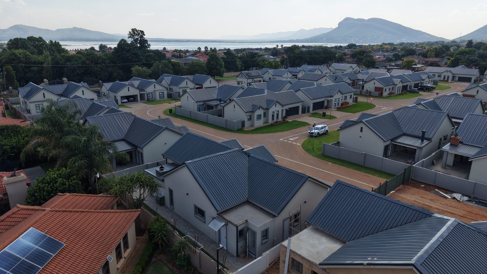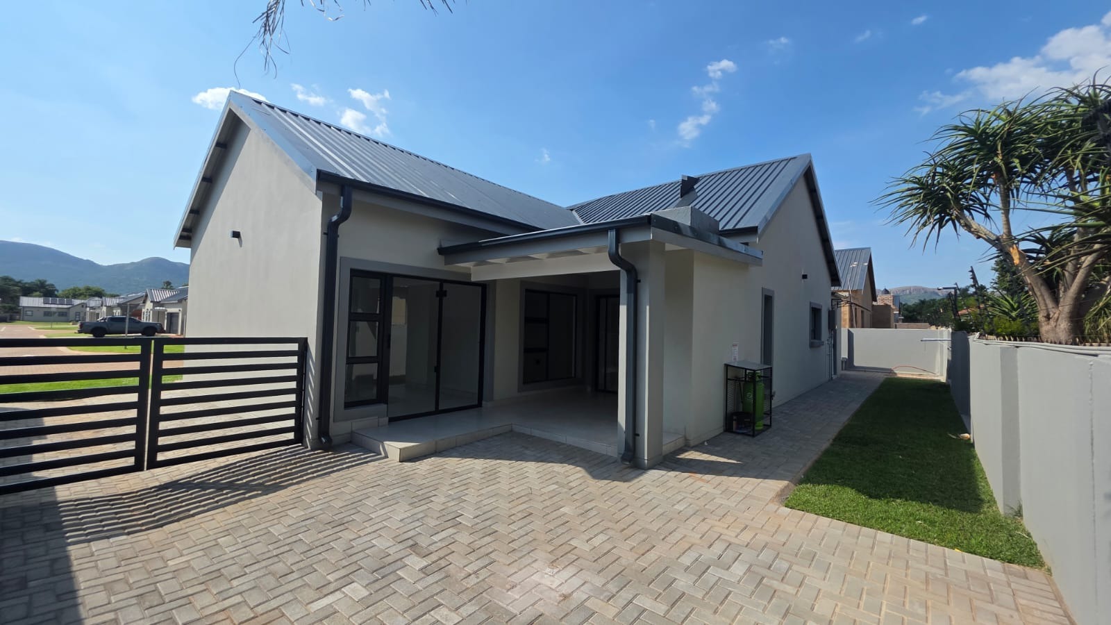 Discover modern estate living in this newly built 3-bedroom, 2.5-bathroom home situated in the sought-after Melodie, Hartbeespoort. The contemporary design features a dark metal roof, light exterior, paved driveway, and neat front lawn, all set within a secure estate offering privacy and scenic mountain and green views. The home includes solar panels for energy efficiency and benefits from 24-hour security with access control and electric fencing.