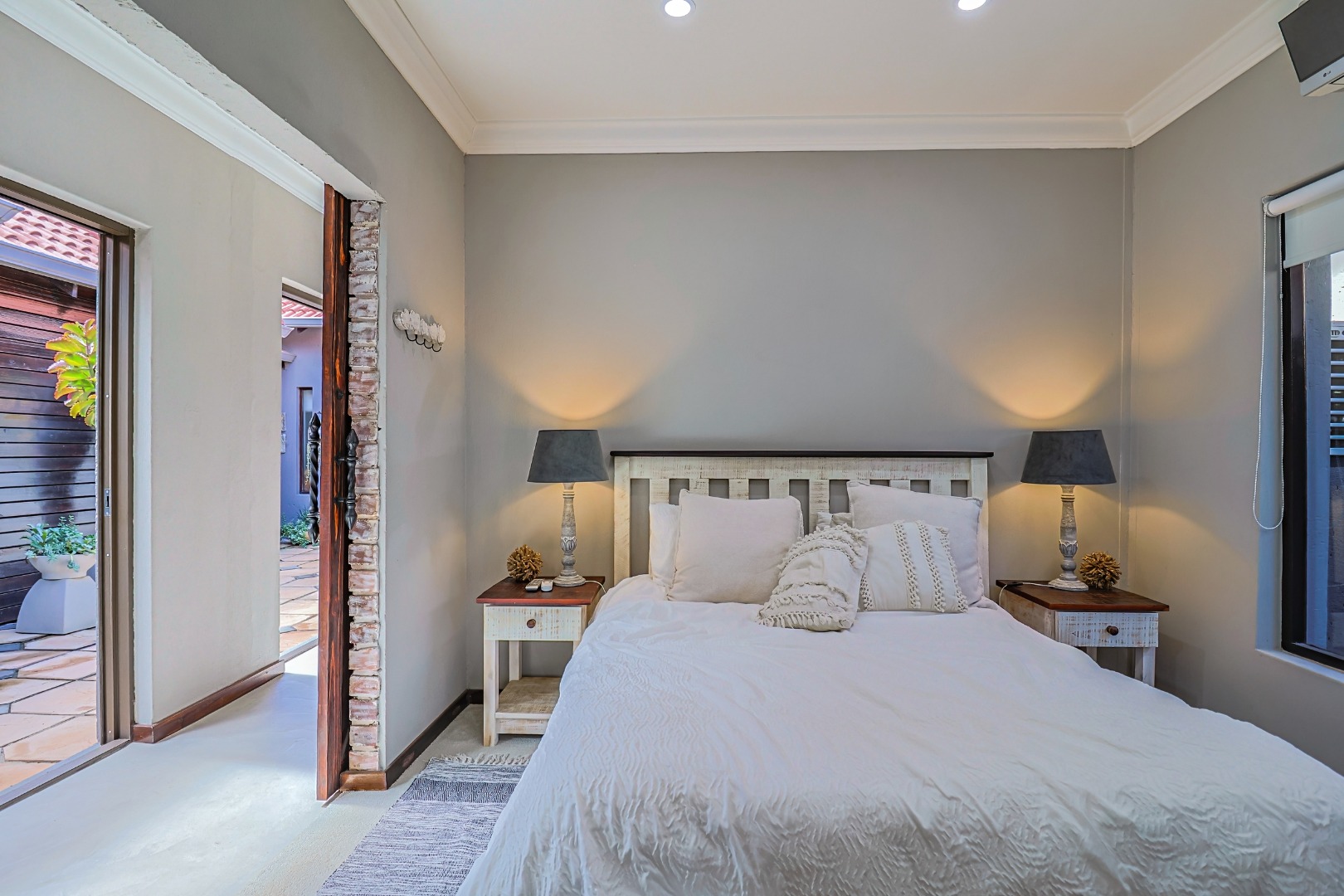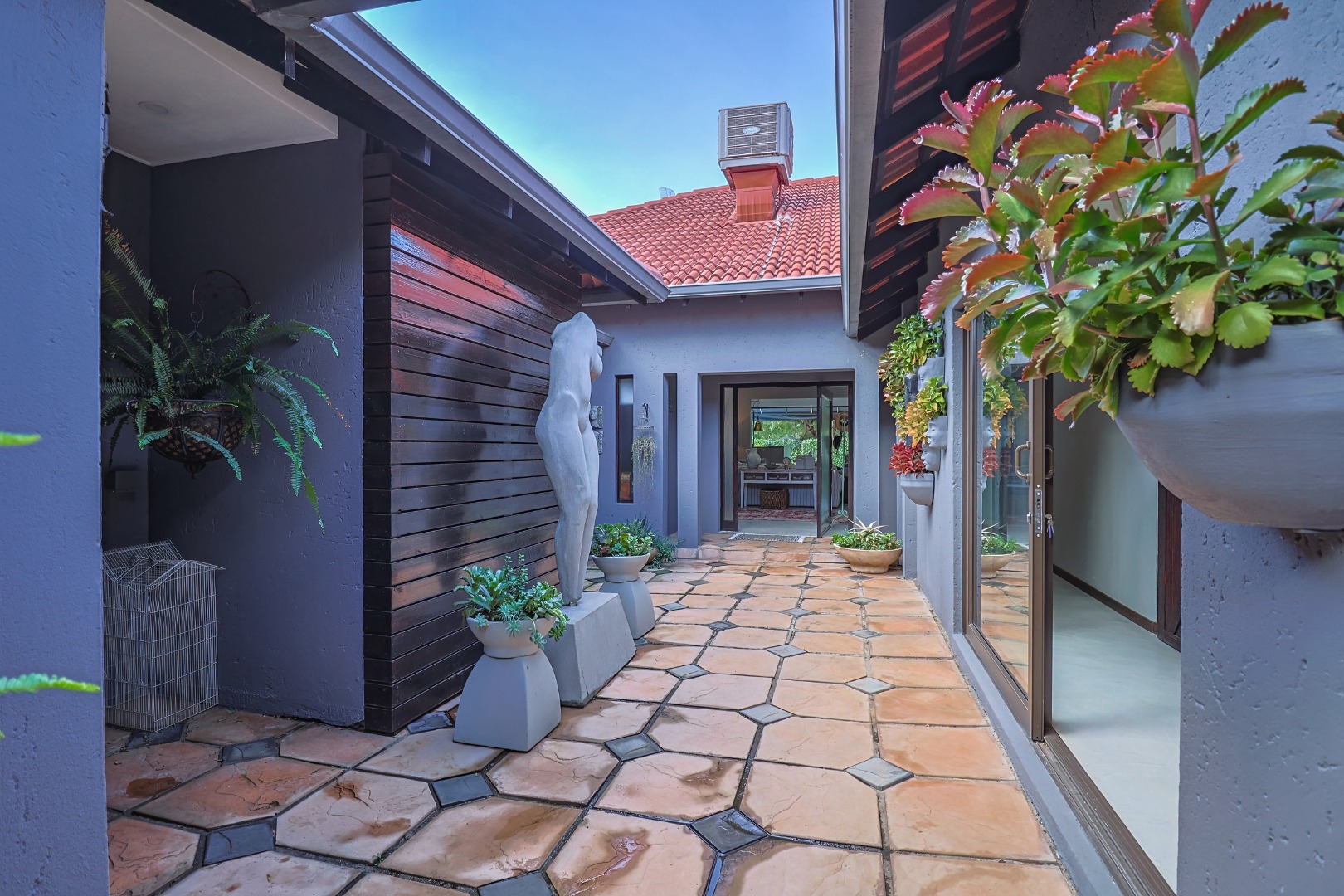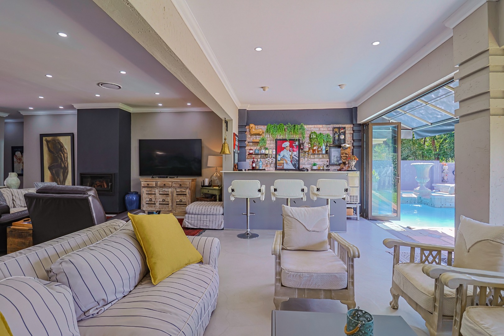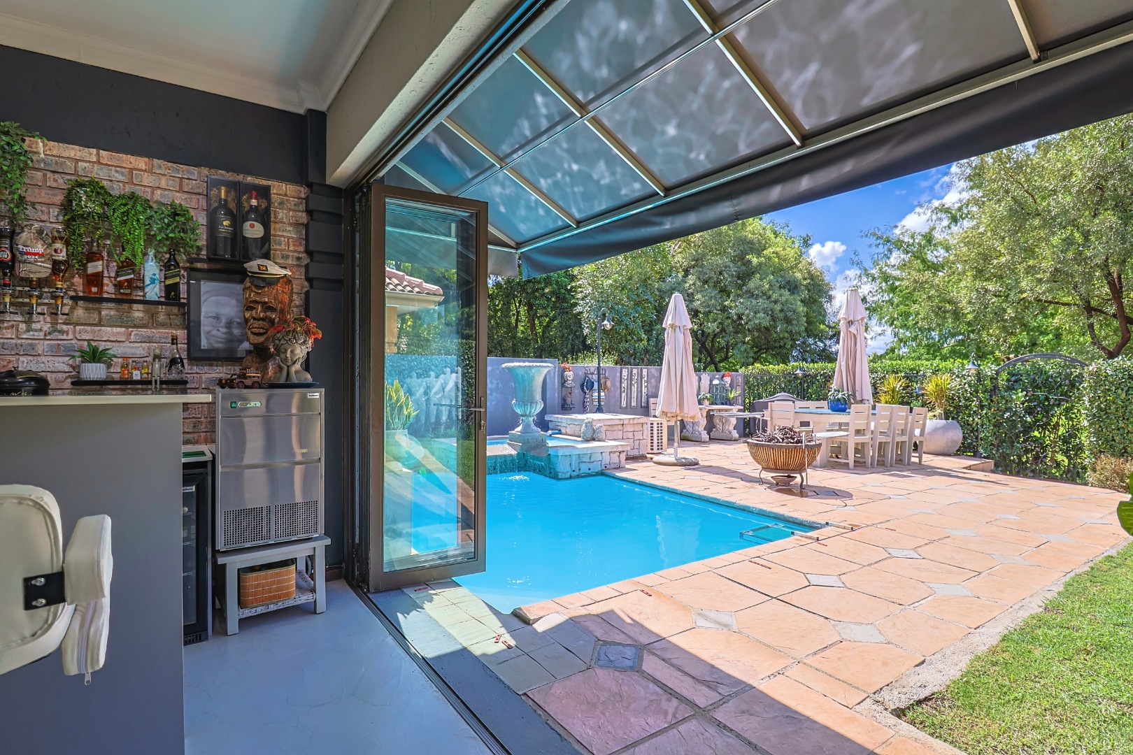 Well positioned within the sought-after Pecanwood Golf Estate, this exceptional single-storey residence offers a seamless blend of contemporary design, comfort, and privacy. Designed for those who appreciate modern elegance with functional living, the home showcases immaculate, upmarket finishes and thoughtfully curated spaces throughout. Expansive open-plan living and dining areas create an effortless flow, complemented by a stylish central fireplace that adds warmth and character. The modern, fully equipped kitchen integrates beautifully with the living spaces, making everyday living as well as entertaining a pleasure. Large stacking doors open out to the private heated pool within a beautifully landscaped garden. The entertainment offering is truly impressive, featuring a fitted bar that opens to the outdoor area. Each bedroom is spacious and complemented by its own en-suite bathroom, ensuring privacy and comfort throughout. Three of the bedrooms enjoy direct access to a private courtyard, enhancing the home’s indoor-outdoor flow and creating a calm, natural setting. The main suite serves as a peaceful sanctuary, opening onto the pool and garden, and offering a perfect space to unwind. In addition, the home is equipped with solar panels and inverter, integrated washing machine and dishwasher and ice machine, 2 fireplaces, 4 aircons.