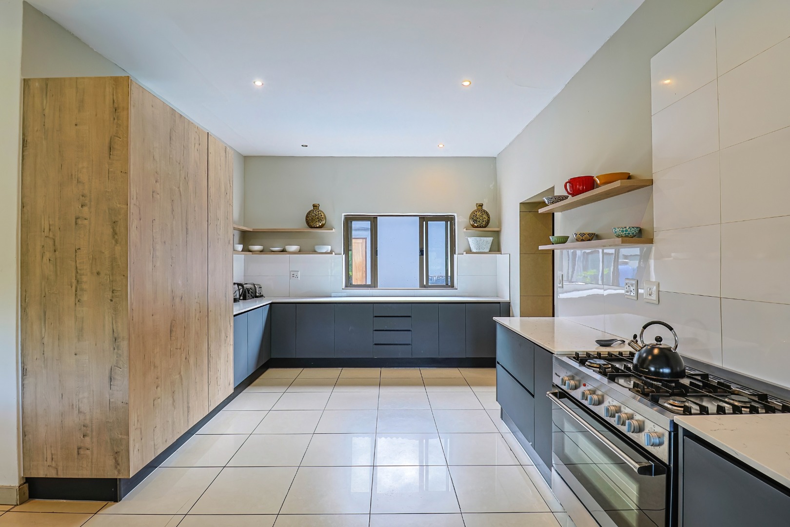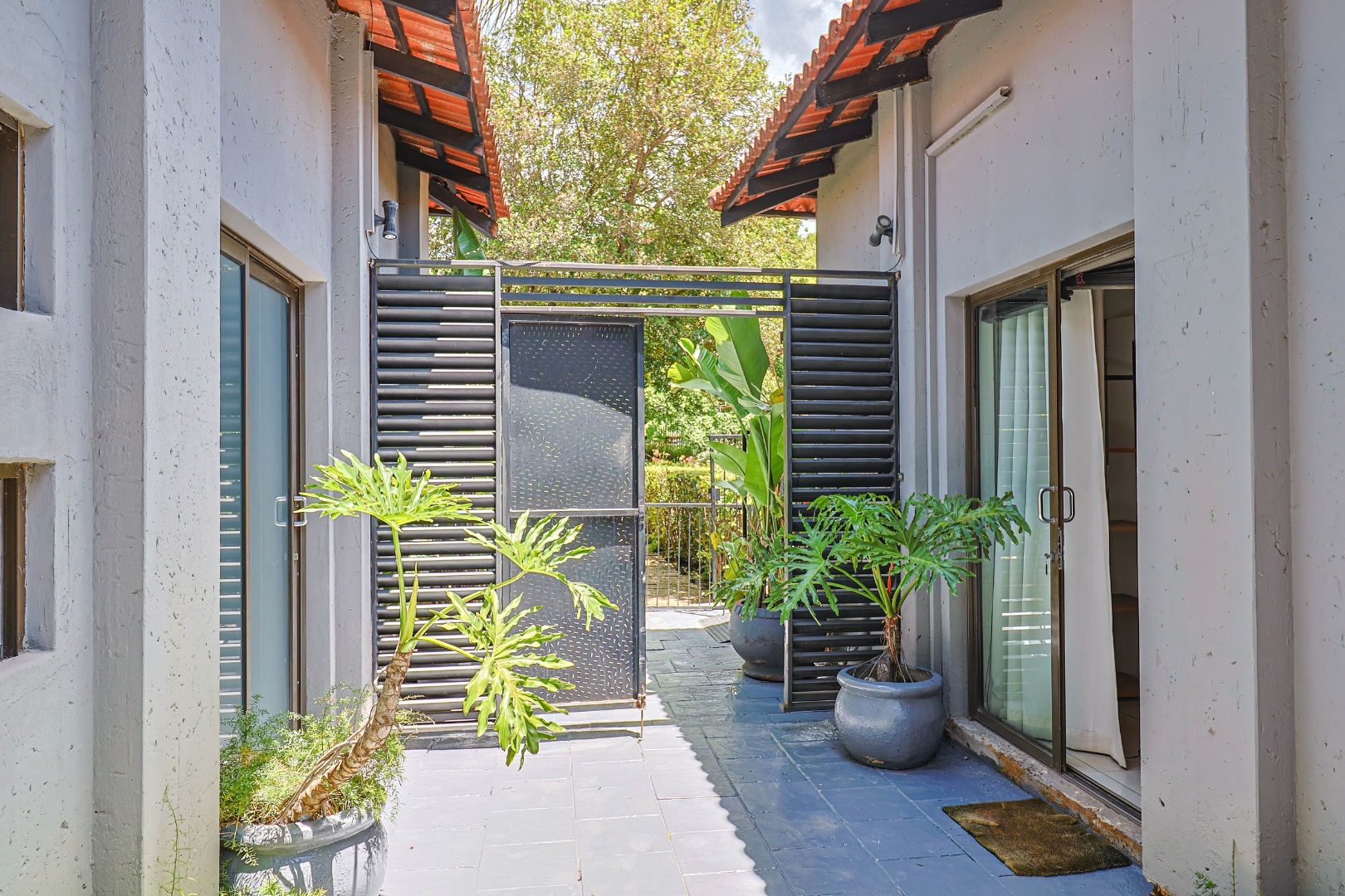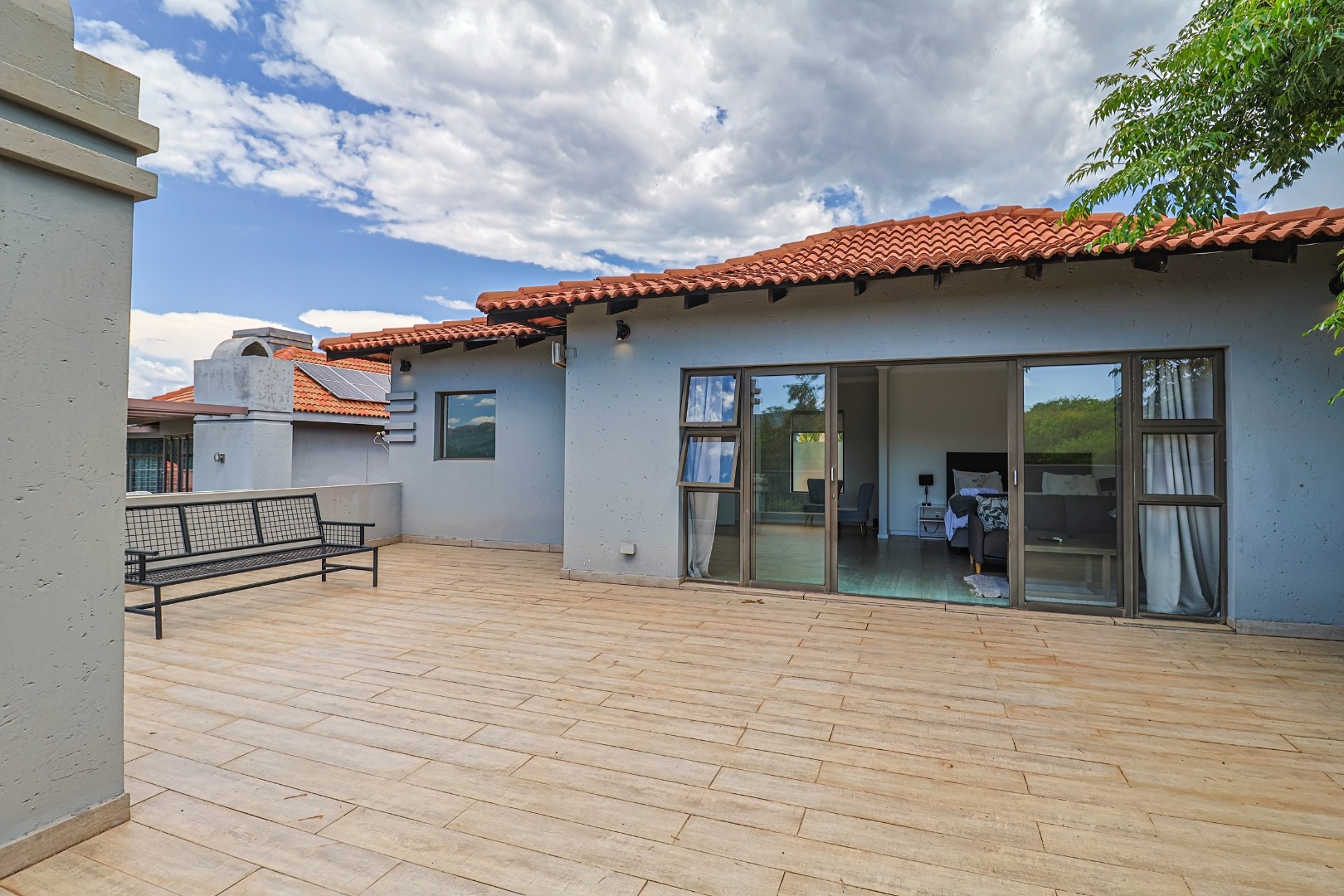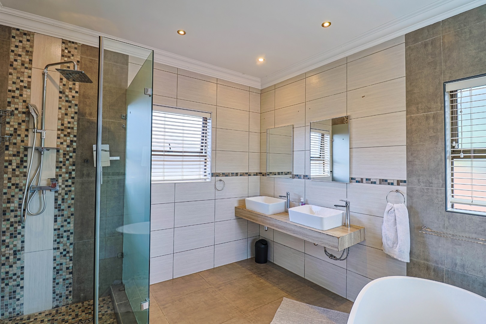 Discover refined golf-estate living in this exceptional double-storey home nestled within the sought-after Pecanwood Estate in Hartbeespoort. Designed with timeless elegance, the residence welcomes you with its classic terracotta roofline, lush greenery, and inviting sense of privacy. Inside, light-filled open-plan living areas flow seamlessly from the modern gourmet kitchen—complete with dark cabinetry, gas stove and pantry—to the dining and lounge spaces complemented by a feature fireplace and a separate family TV room. Five spacious bedrooms and four luxurious bathrooms, three en-suite, ensure comfort and convenience for family and guests.