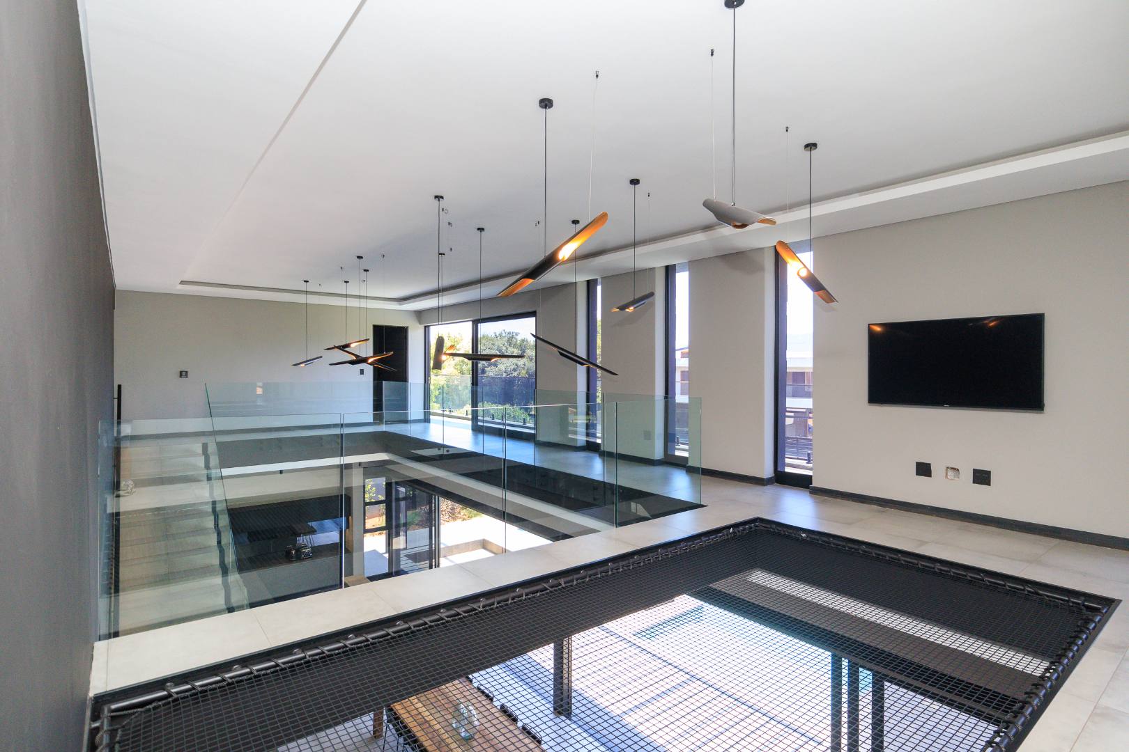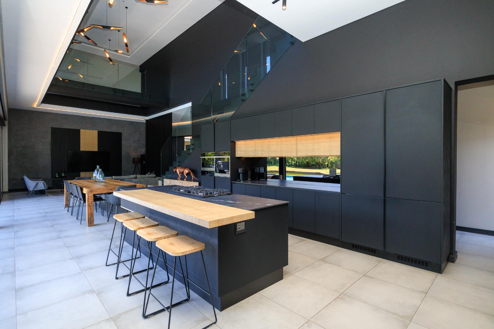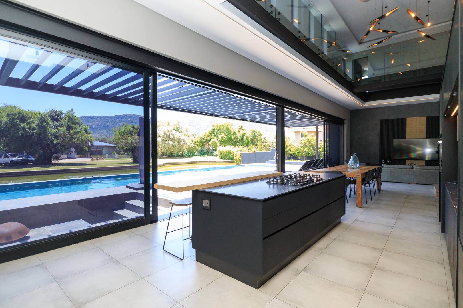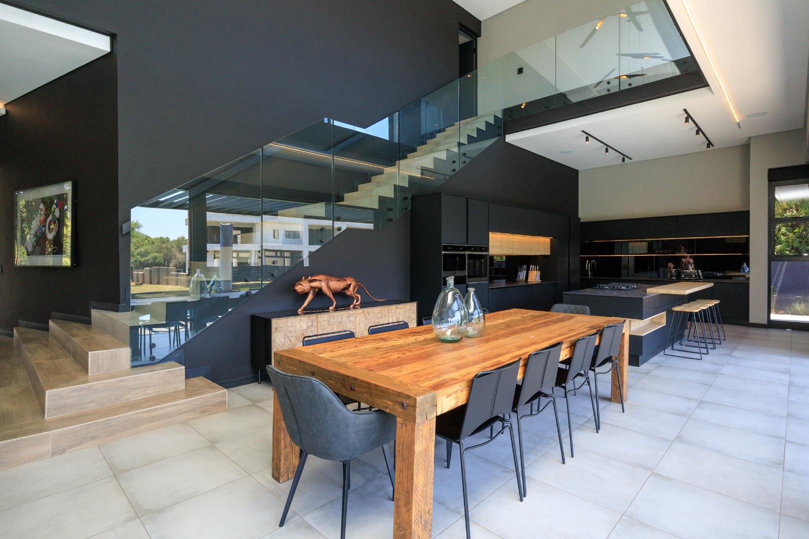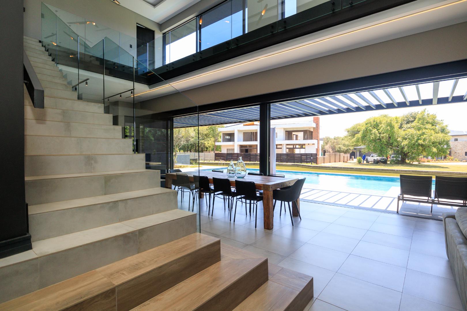 This ultra-modern residence in The Islands Estate epitomises luxury living, seamlessly blending glass, aluminium, and light to create an atmosphere of sophistication and openness. Set on a 1,149m² stand, the home features double-volume ceilings and expansive open-plan living spaces. A designer kitchen with integrated appliances flows effortlessly into the lounge and dining area, opening onto a spacious patio with an extra-length swimming pool, boma, and gas braai — perfect for entertaining. The home’s elegant staircase, accentuated by statement light fittings, enhances the sleek architectural lines.