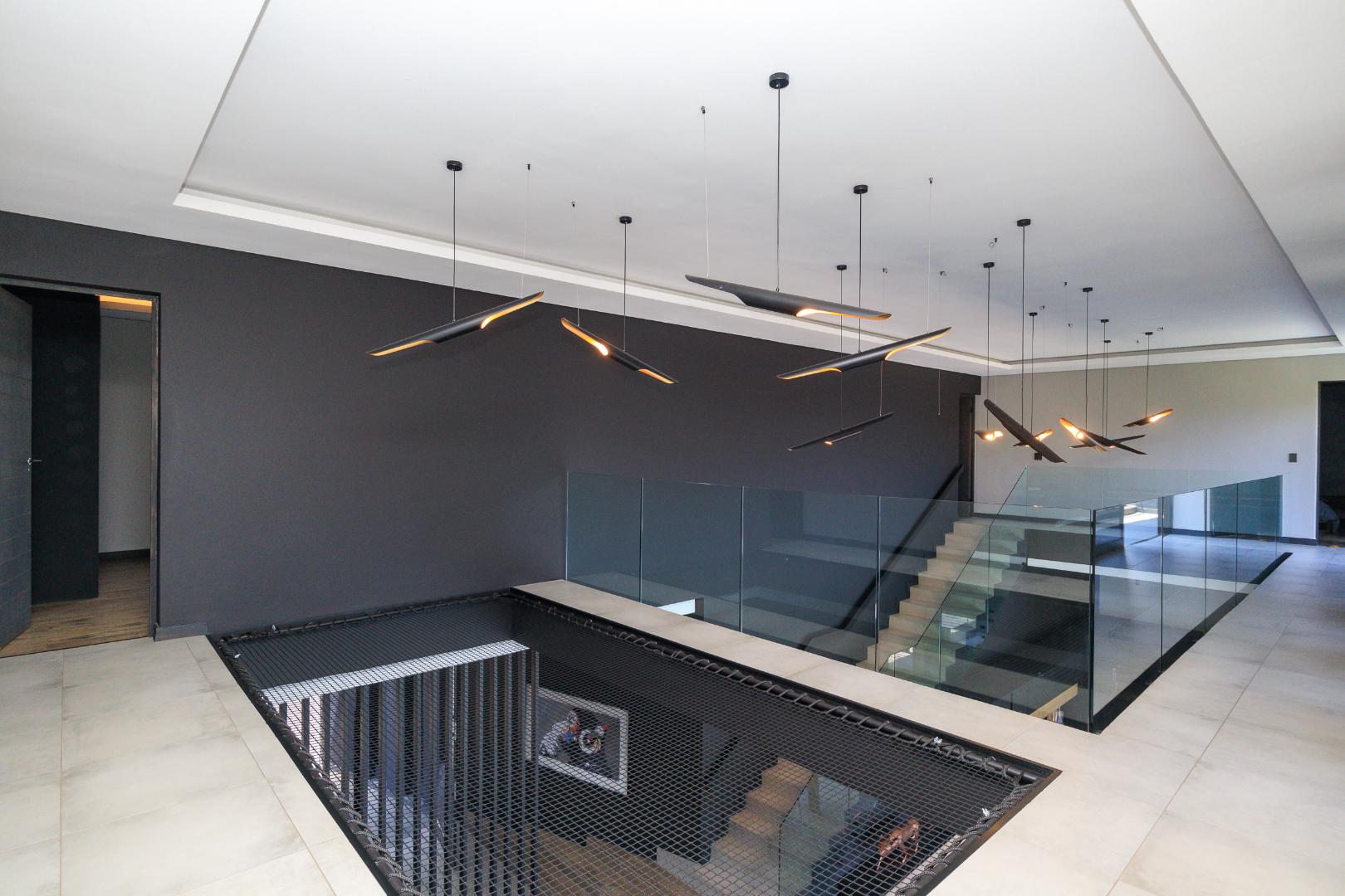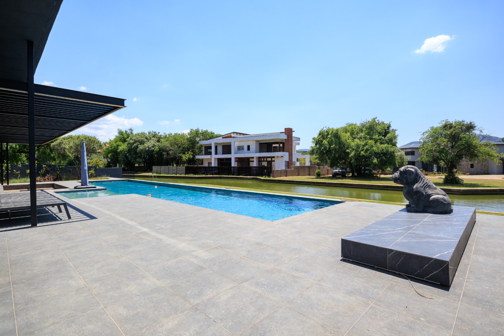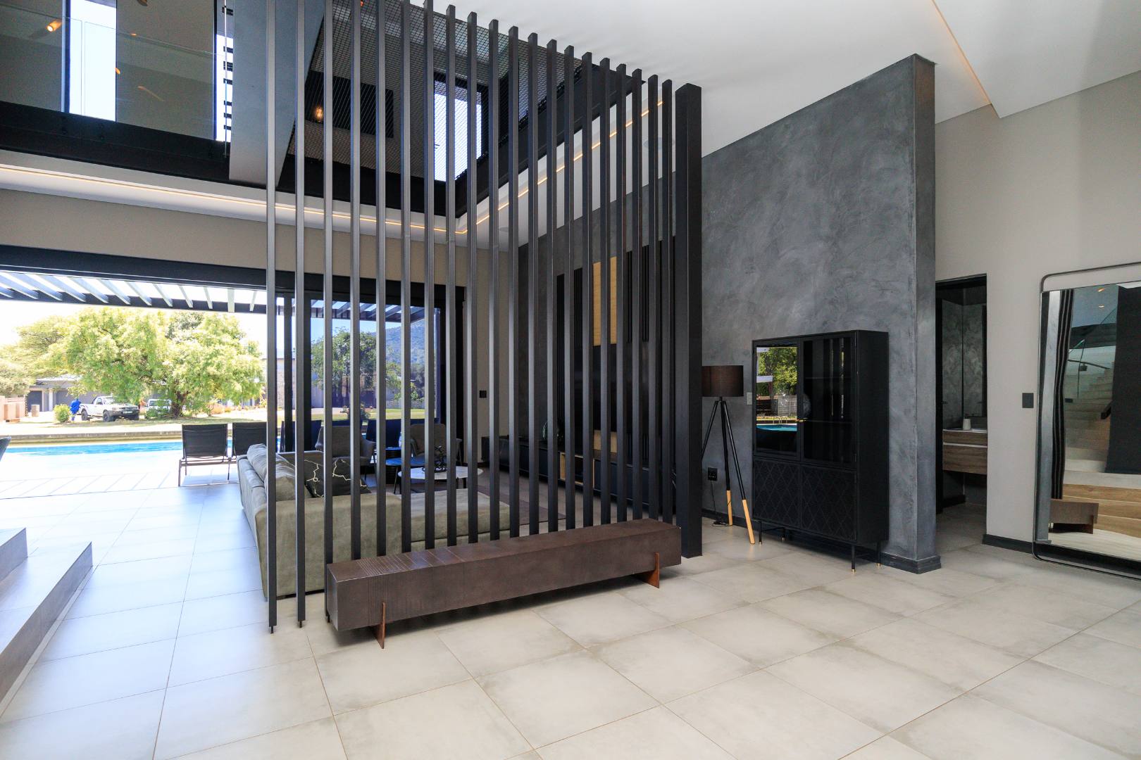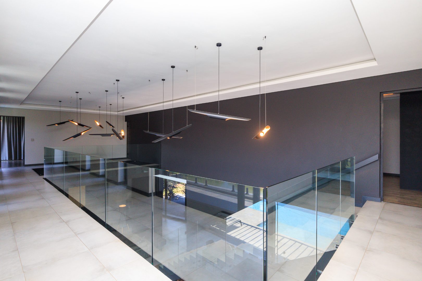 This ultra-modern residence in The Islands Estate epitomises luxury living, seamlessly blending glass, aluminium, and light to create an atmosphere of sophistication and openness. Set on a 1,149m² stand, the home features double-volume ceilings and expansive open-plan living spaces. A designer kitchen with integrated appliances flows effortlessly into the lounge and dining area, opening onto a spacious patio with an extra-length swimming pool, boma, and gas braai — perfect for entertaining. The home’s elegant staircase, accentuated by statement light fittings, enhances the sleek architectural lines.