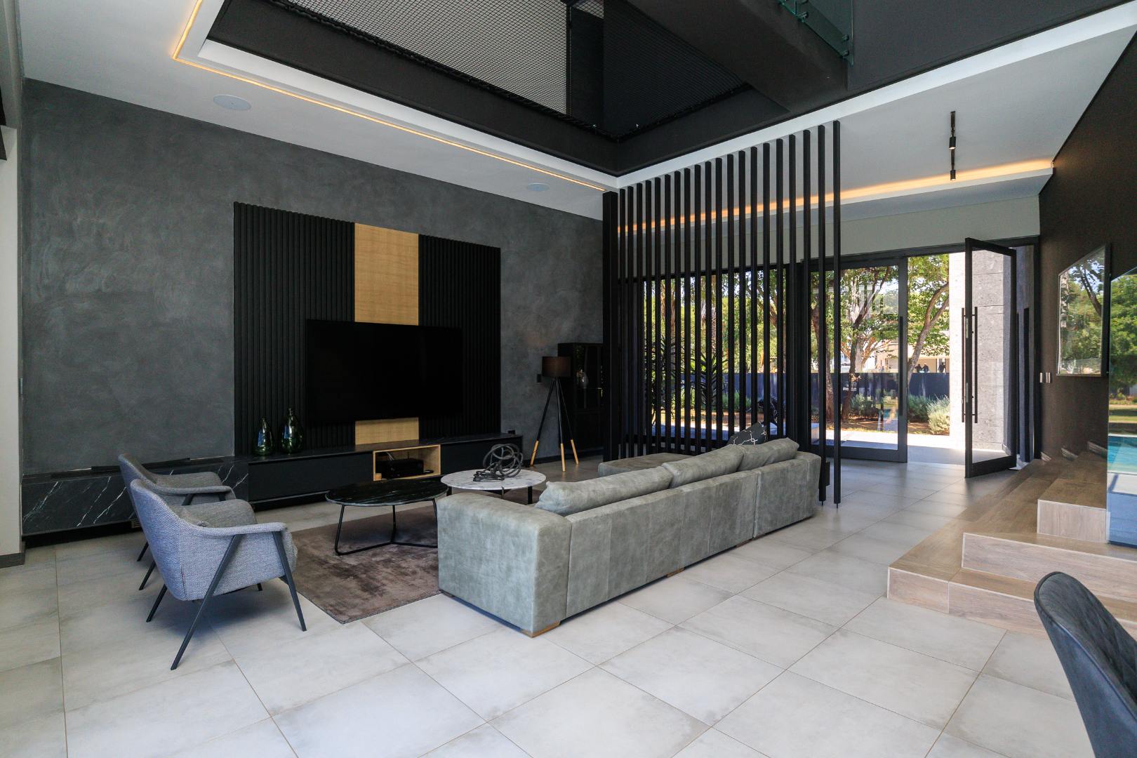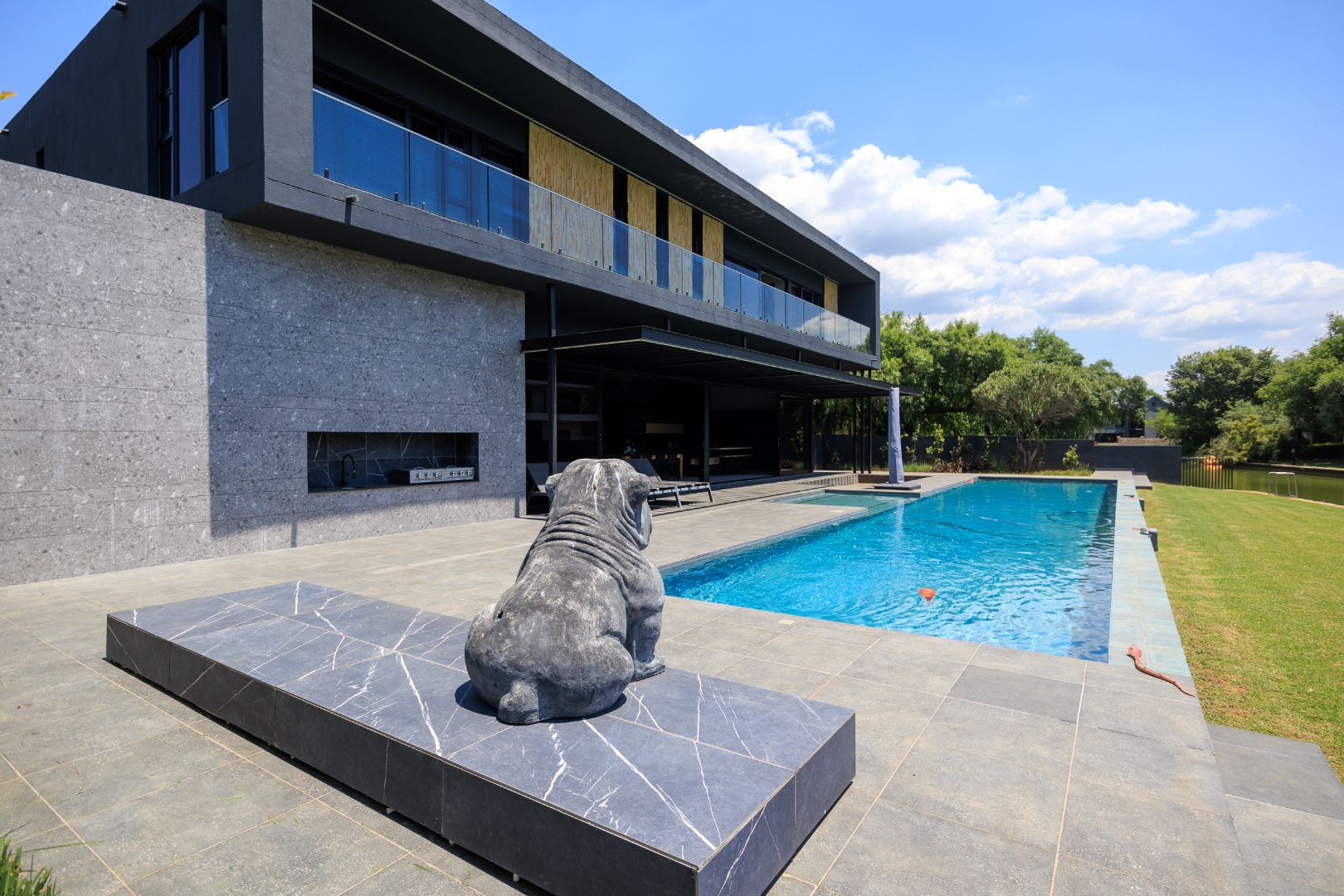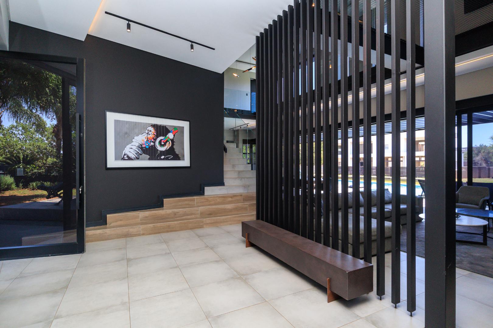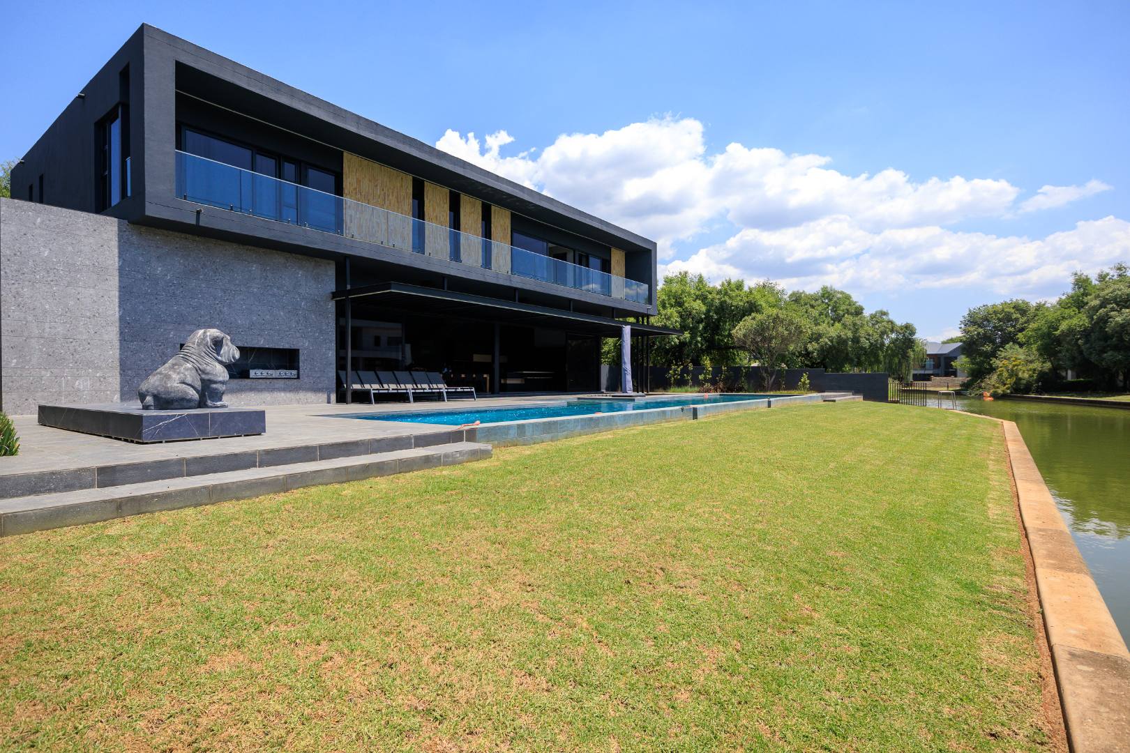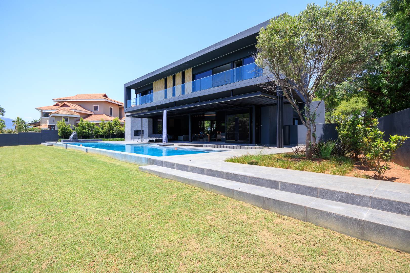 This ultra-modern residence in The Islands Estate epitomises luxury living, seamlessly blending glass, aluminium, and light to create an atmosphere of sophistication and openness. Set on a 1,149m² stand, the home features double-volume ceilings and expansive open-plan living spaces. A designer kitchen with integrated appliances flows effortlessly into the lounge and dining area, opening onto a spacious patio with an extra-length swimming pool, boma, and gas braai — perfect for entertaining. The home’s elegant staircase, accentuated by statement light fittings, enhances the sleek architectural lines.