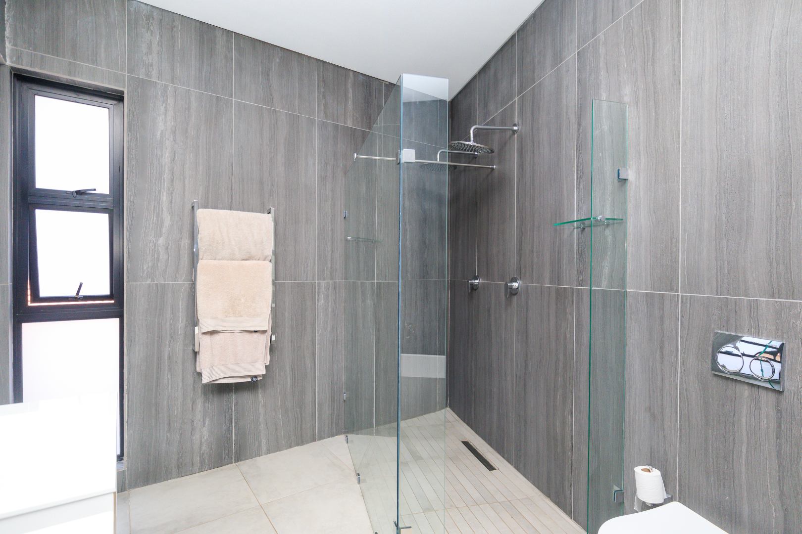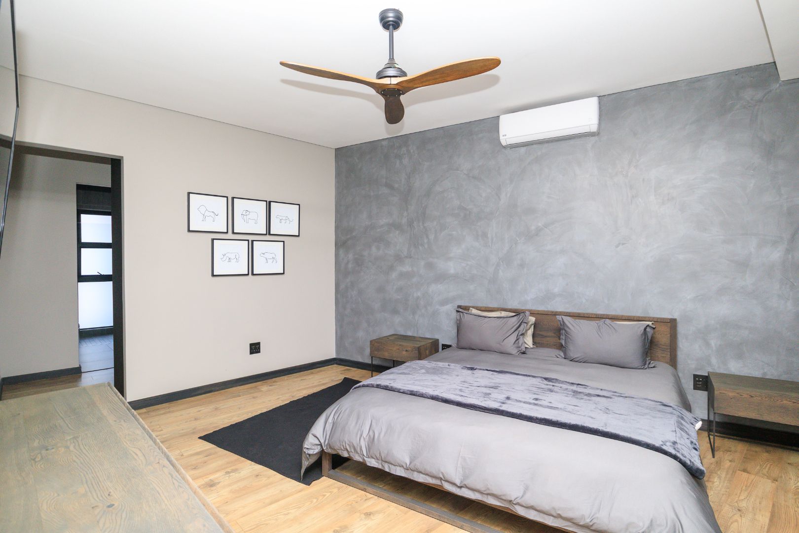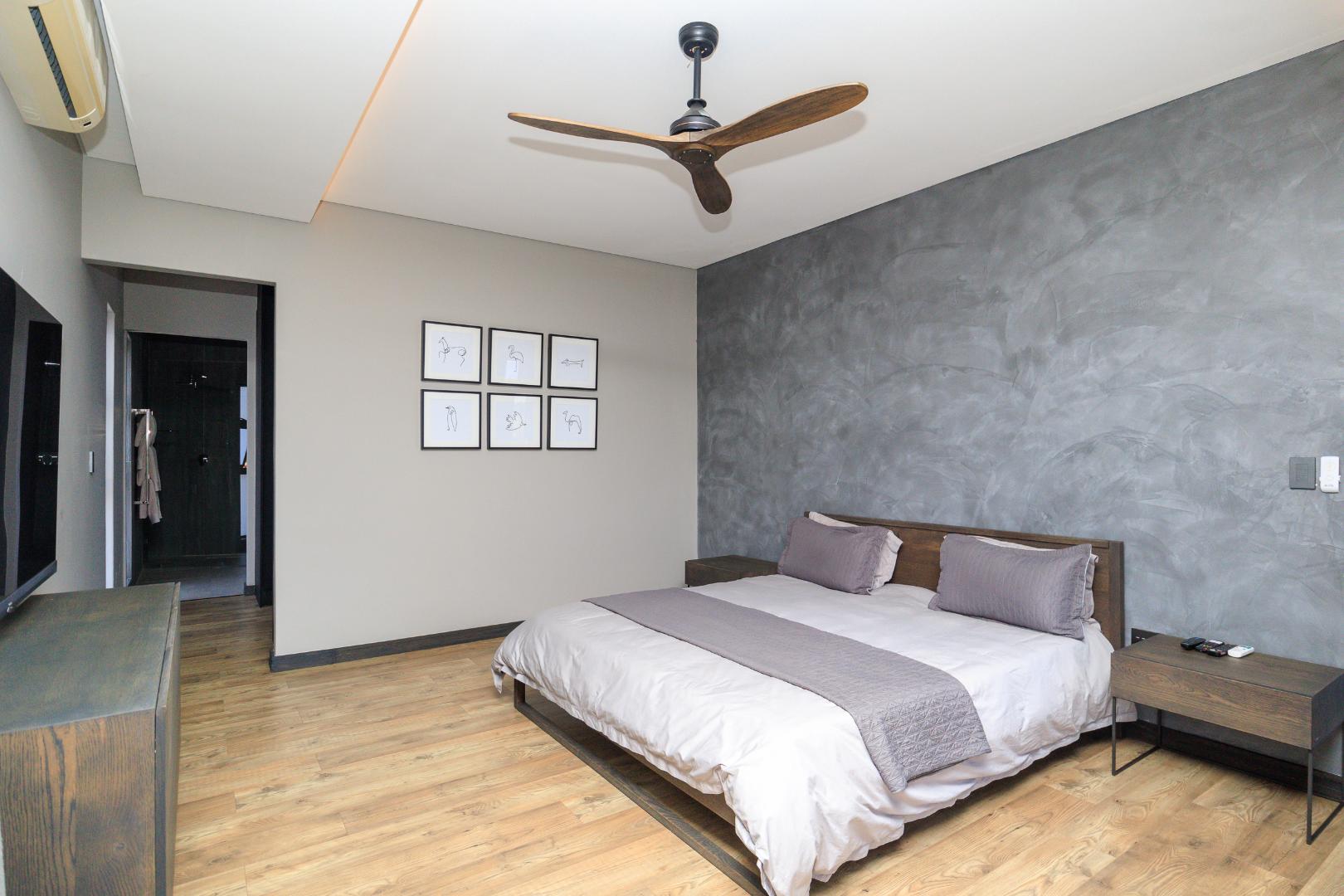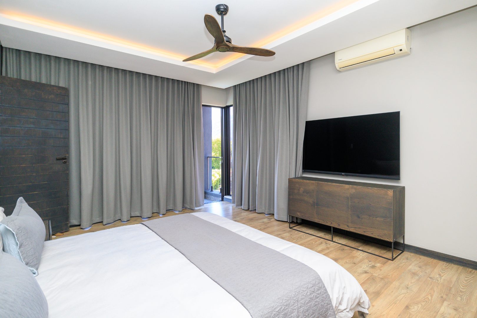 This ultra-modern residence in The Islands Estate epitomises luxury living, seamlessly blending glass, aluminium, and light to create an atmosphere of sophistication and openness. Set on a 1,149m² stand, the home features double-volume ceilings and expansive open-plan living spaces. A designer kitchen with integrated appliances flows effortlessly into the lounge and dining area, opening onto a spacious patio with an extra-length swimming pool, boma, and gas braai — perfect for entertaining. The home’s elegant staircase, accentuated by statement light fittings, enhances the sleek architectural lines.