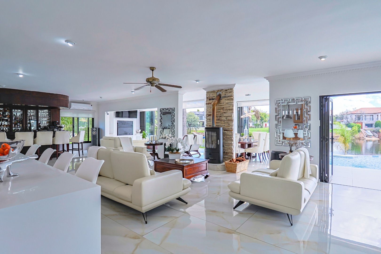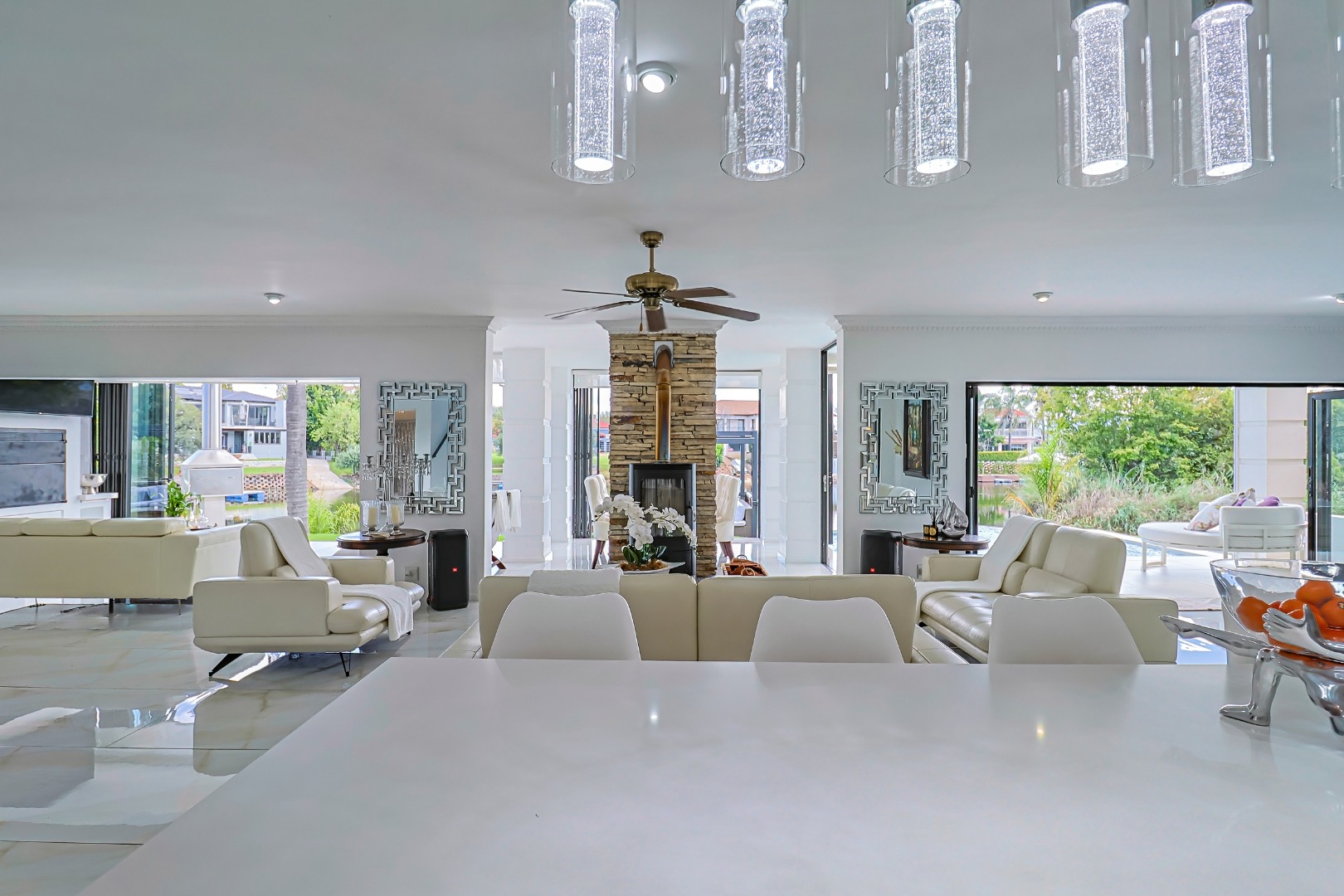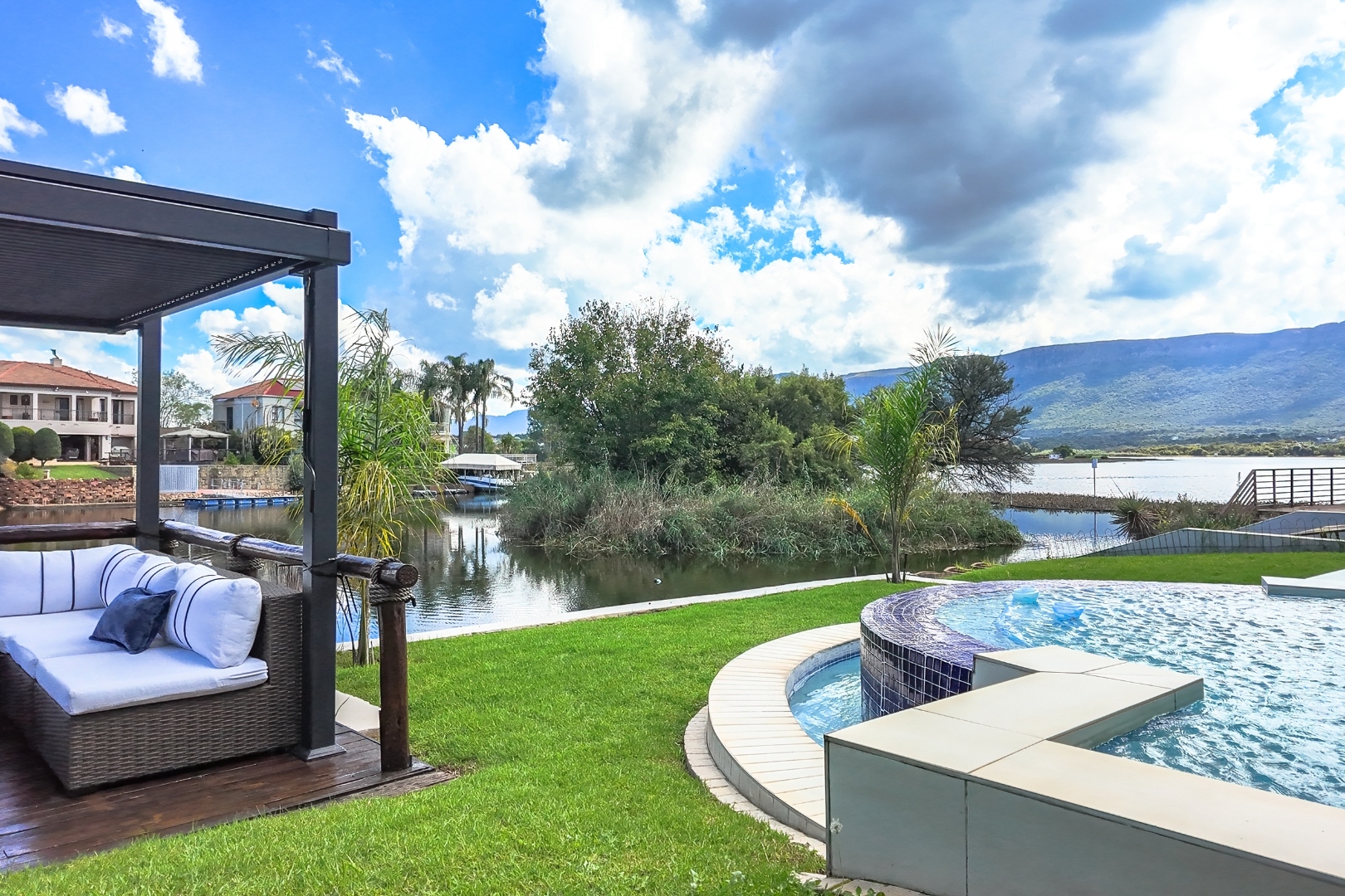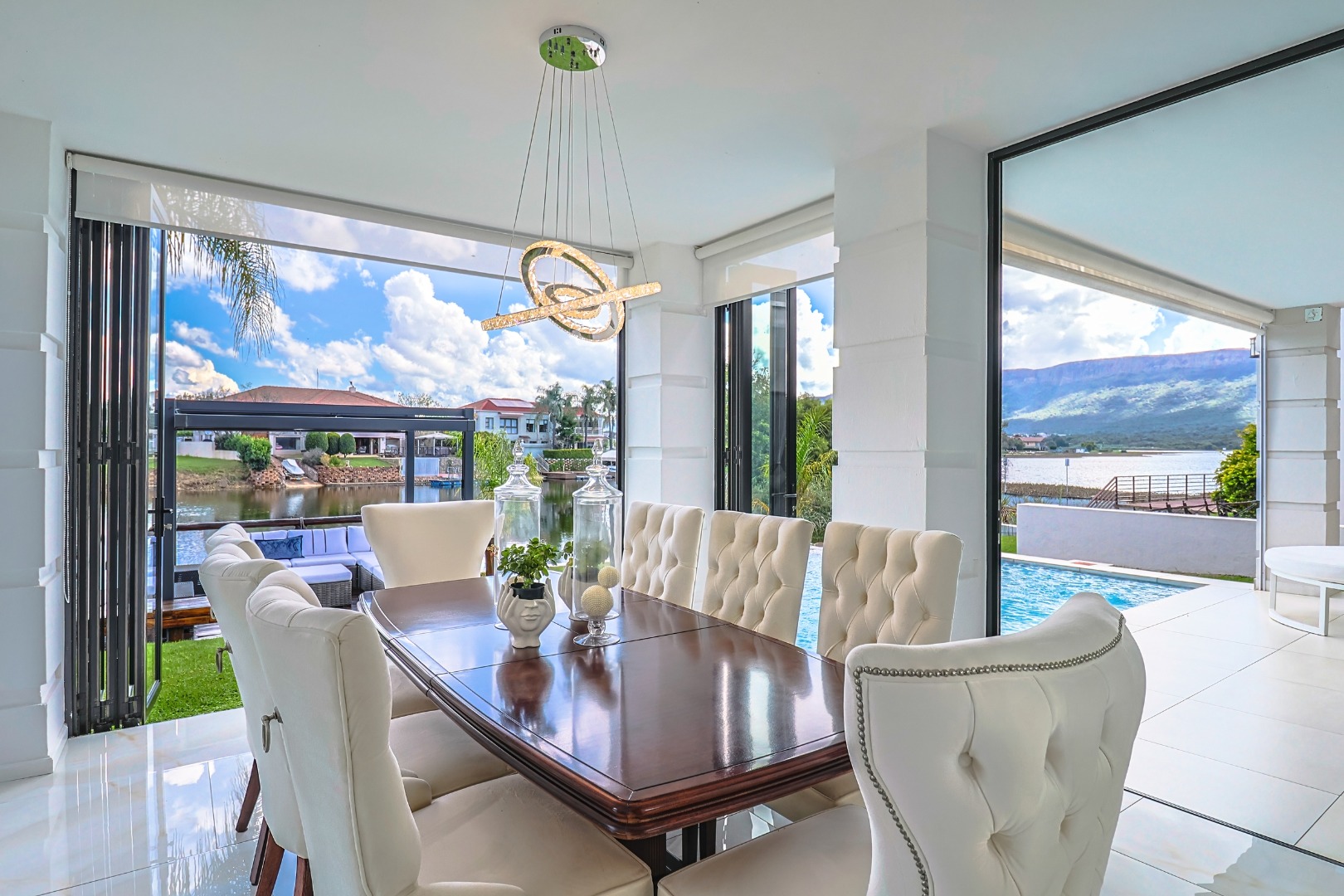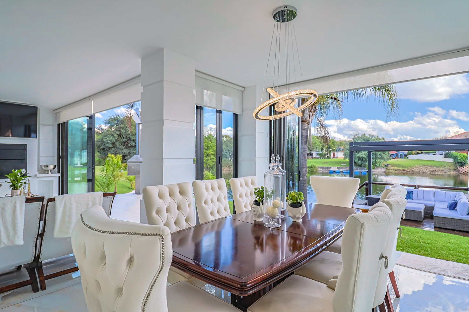 Set on a generous 1,111 sqm stand, this immaculate double-storey home offers 5 spacious bedrooms and 4.5 bathrooms, all complemented by a beautifully finished, upmarket interior. Automated gates welcome you into a glamorous entrance with porcelain tiles, leading seamlessly into expansive open-plan reception areas. The lounge and dining areas flow effortlessly, enhanced by a built-in bar and a stylish braai room—ideal for entertaining. From here, the home opens onto a patio overlooking a rim-flow heated pool, lapa, and fire pit, creating a relaxed outdoor setting with direct access to the dam, your own private jetty, and a private boat launching facility. The well-equipped kitchen, complete with a separate scullery and laundry, adds both practicality and ease to everyday living, while air-conditioning in the lounge and bedrooms ensures year-round comfort.
