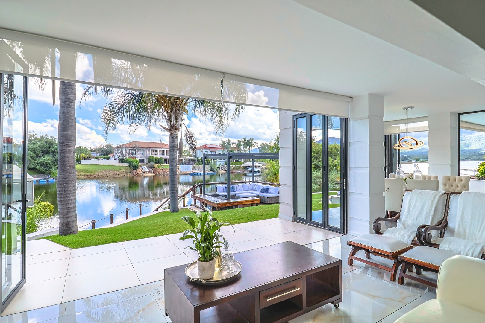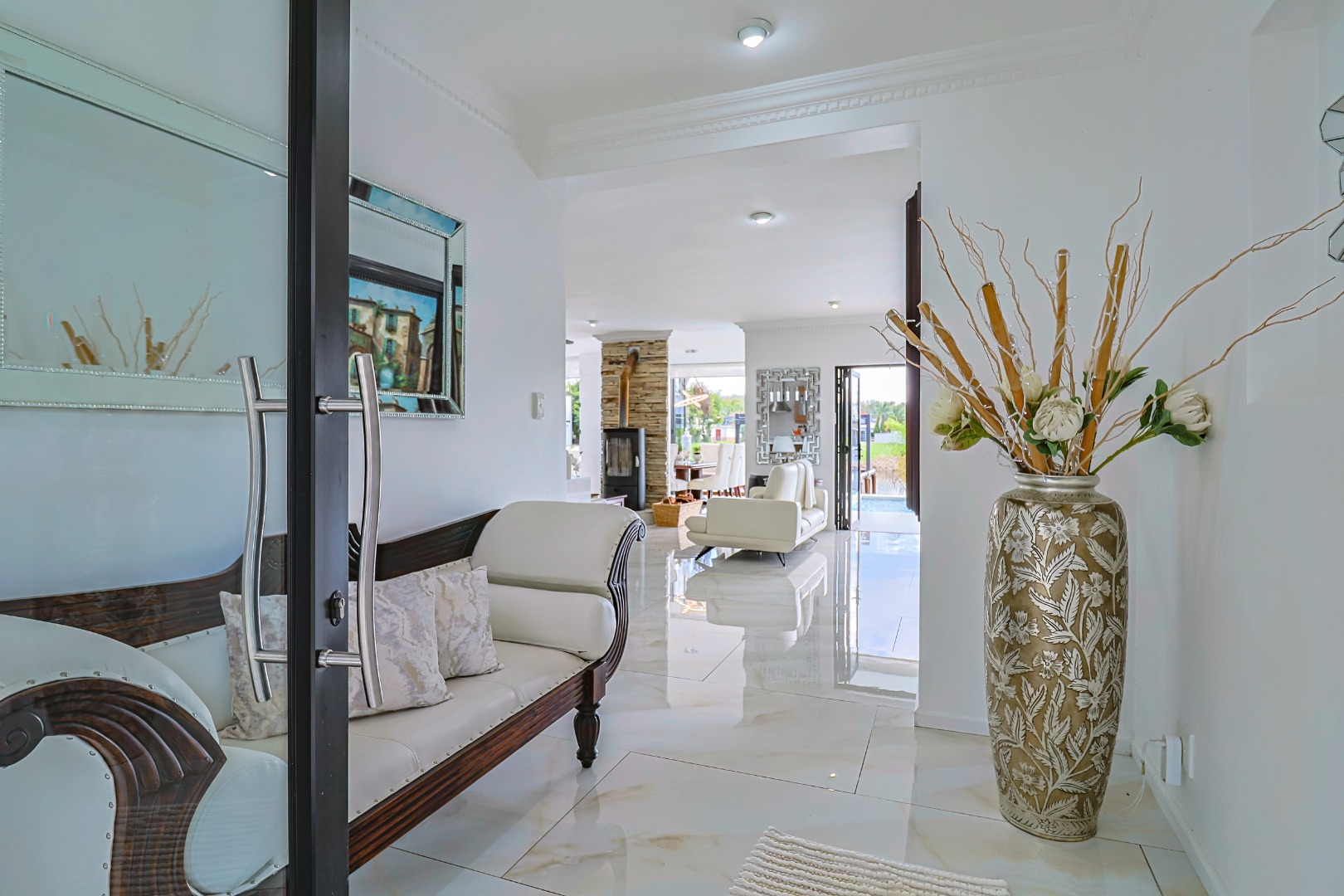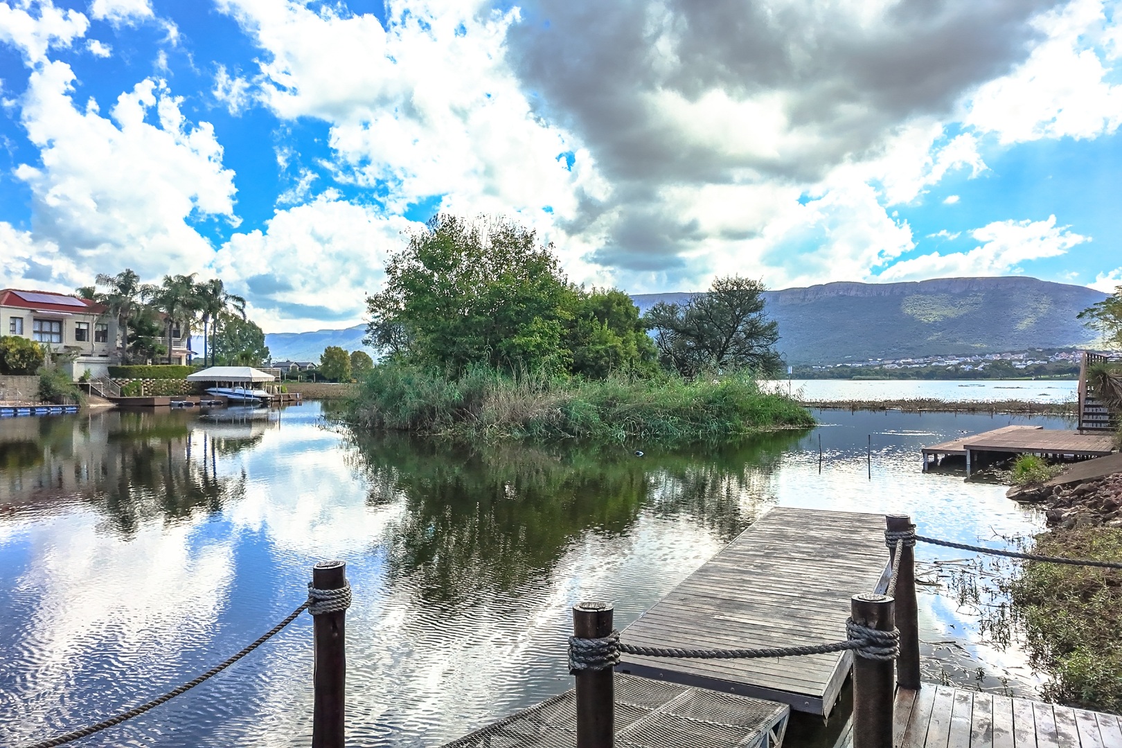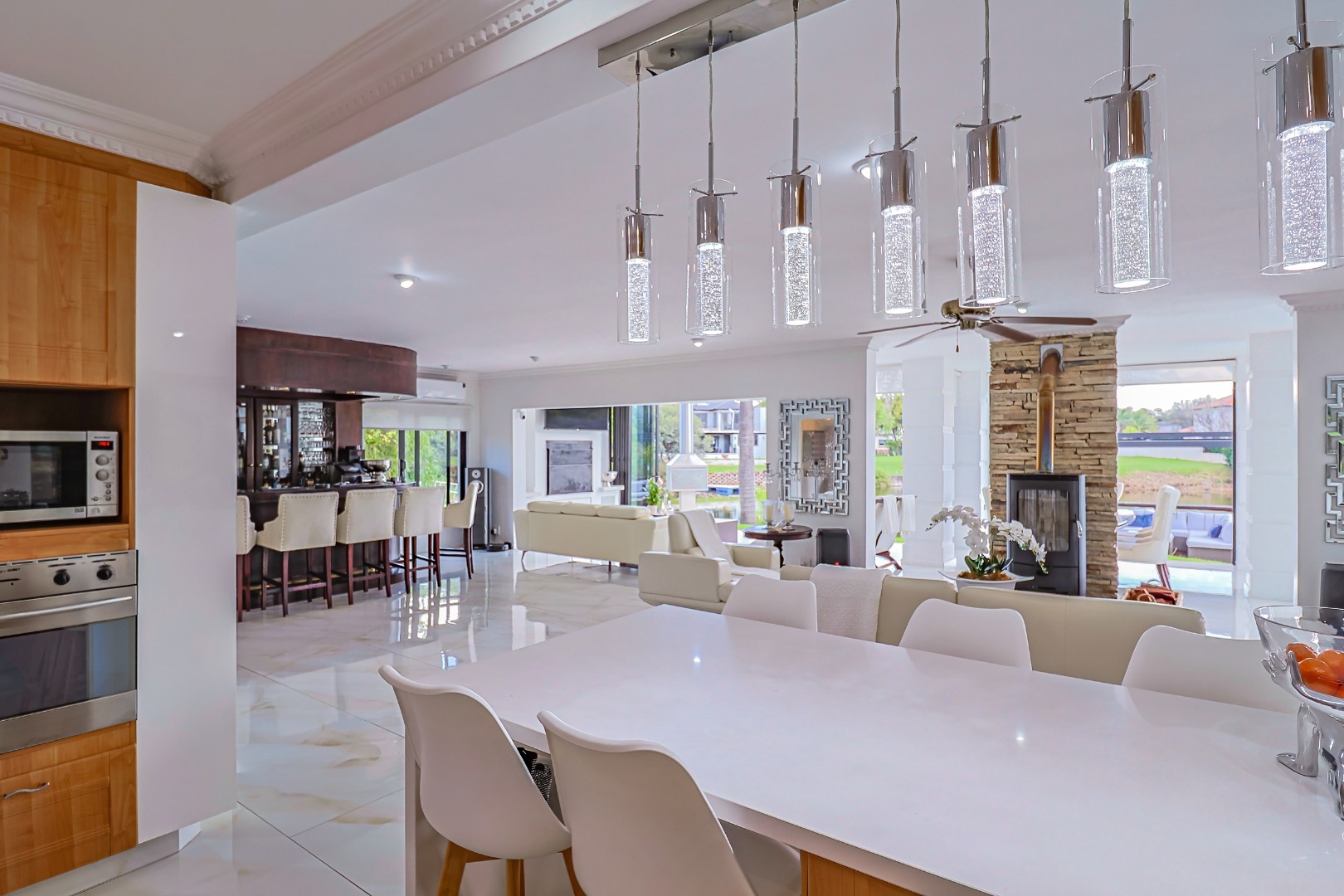 Set on a generous 1,111 sqm stand, this immaculate double-storey home offers 5 spacious bedrooms and 4.5 bathrooms, all complemented by a beautifully finished, upmarket interior. Automated gates welcome you into a glamorous entrance with porcelain tiles, leading seamlessly into expansive open-plan reception areas. The lounge and dining areas flow effortlessly, enhanced by a built-in bar and a stylish braai room—ideal for entertaining. From here, the home opens onto a patio overlooking a rim-flow heated pool, lapa, and fire pit, creating a relaxed outdoor setting with direct access to the dam, your own private jetty, and a private boat launching facility. The well-equipped kitchen, complete with a separate scullery and laundry, adds both practicality and ease to everyday living, while air-conditioning in the lounge and bedrooms ensures year-round comfort.