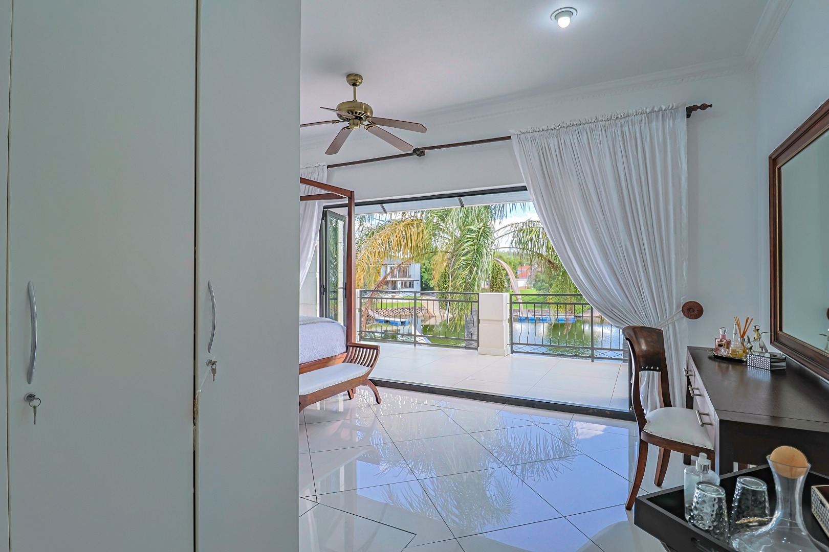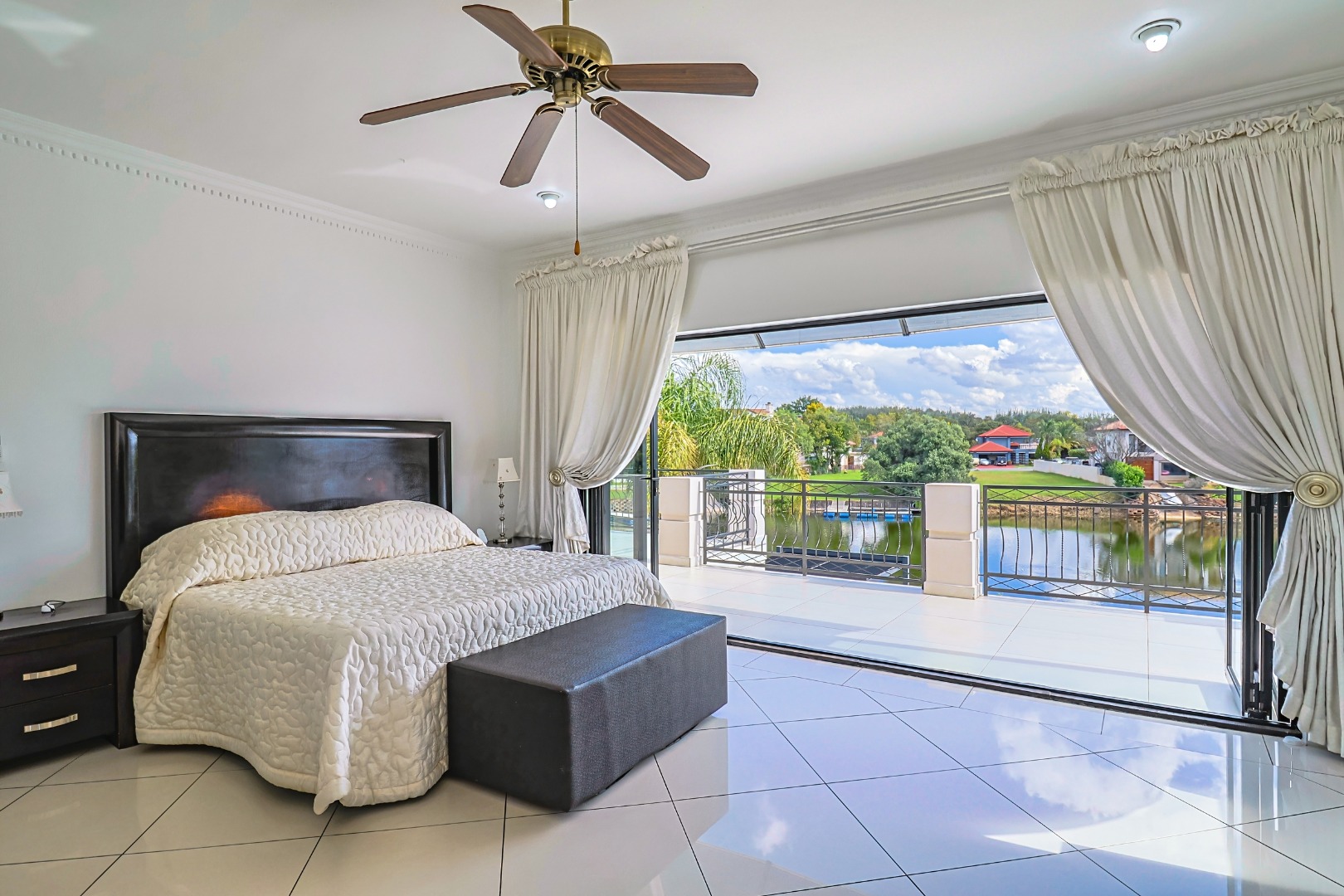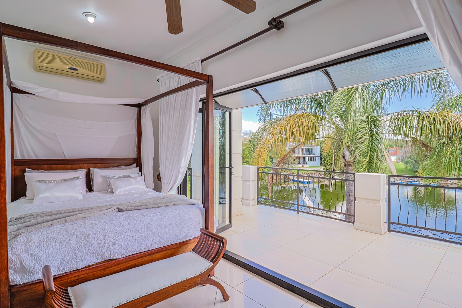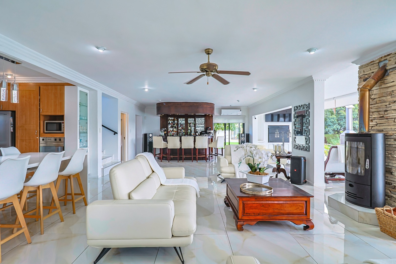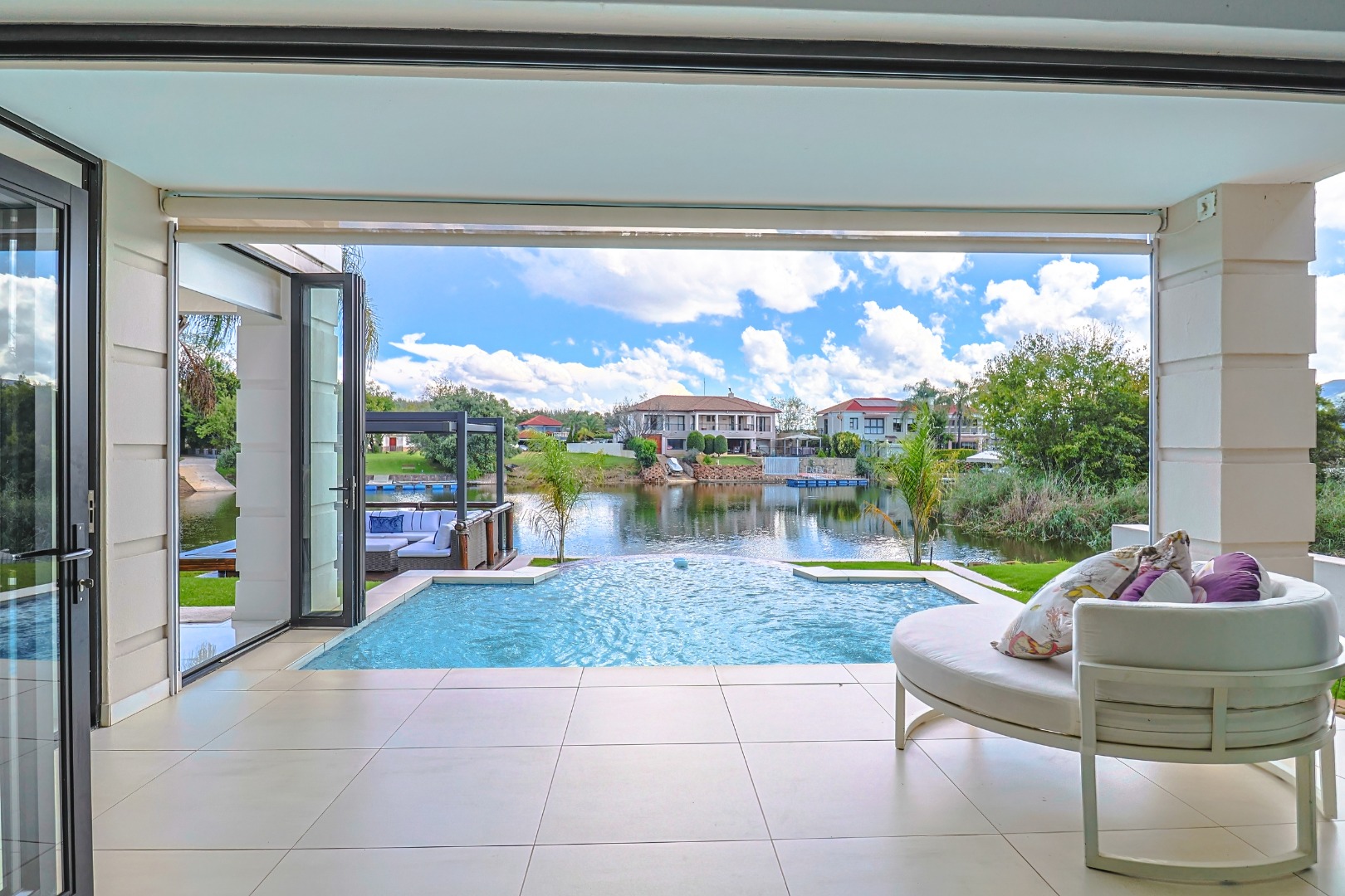 Set on a generous 1,111 sqm stand, this immaculate double-storey home offers 5 spacious bedrooms and 4.5 bathrooms, all complemented by a beautifully finished, upmarket interior. Automated gates welcome you into a glamorous entrance with porcelain tiles, leading seamlessly into expansive open-plan reception areas. The lounge and dining areas flow effortlessly, enhanced by a built-in bar and a stylish braai room—ideal for entertaining. From here, the home opens onto a patio overlooking a rim-flow heated pool, lapa, and fire pit, creating a relaxed outdoor setting with direct access to the dam, your own private jetty, and a private boat launching facility. The well-equipped kitchen, complete with a separate scullery and laundry, adds both practicality and ease to everyday living, while air-conditioning in the lounge and bedrooms ensures year-round comfort.