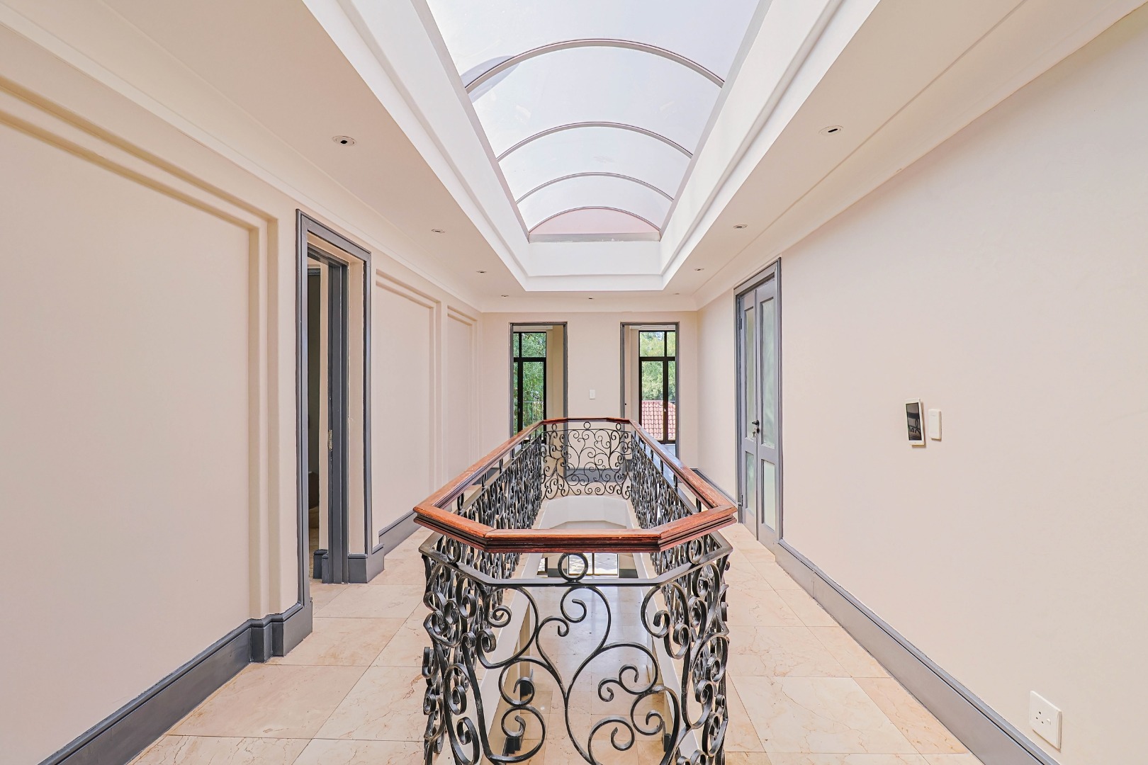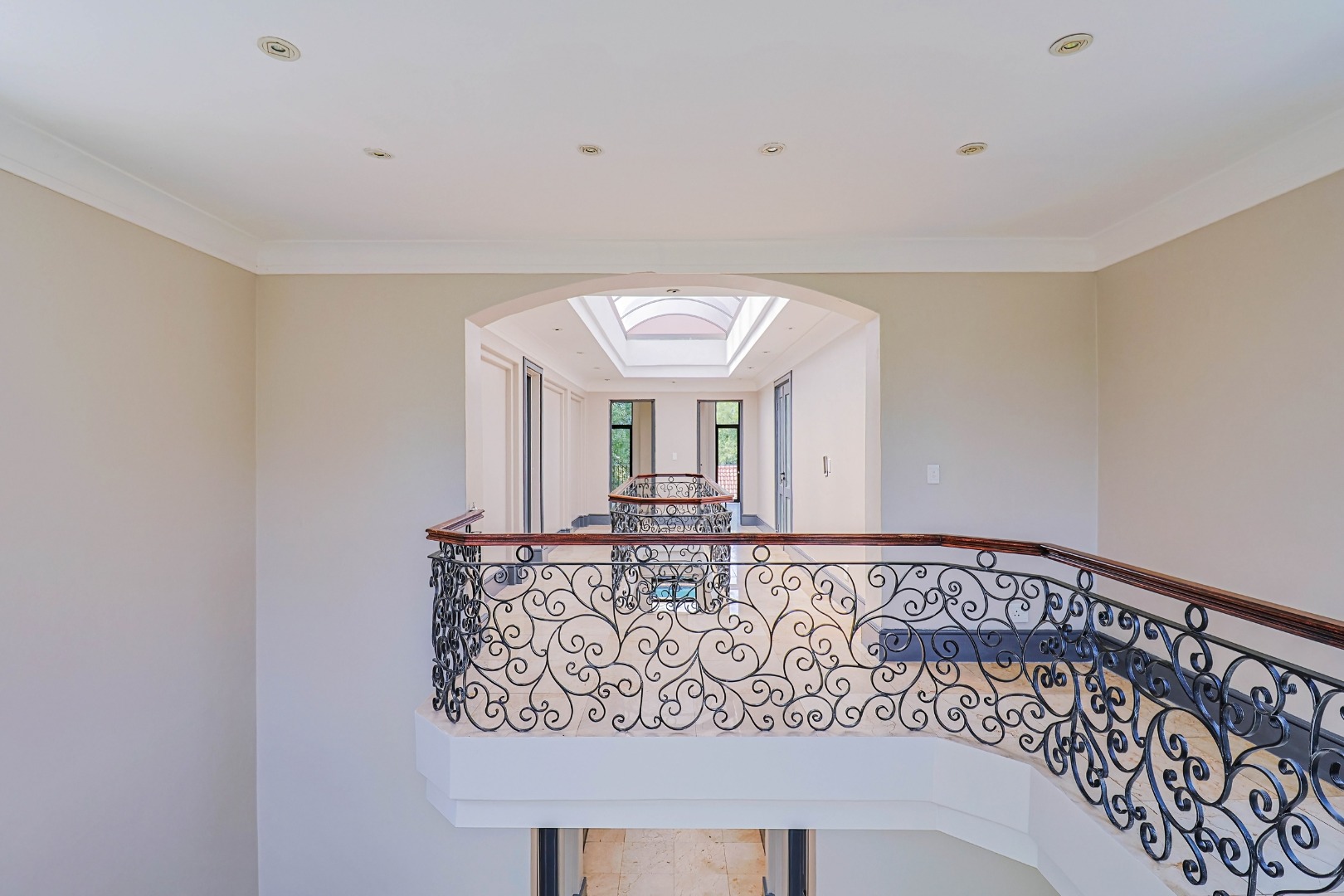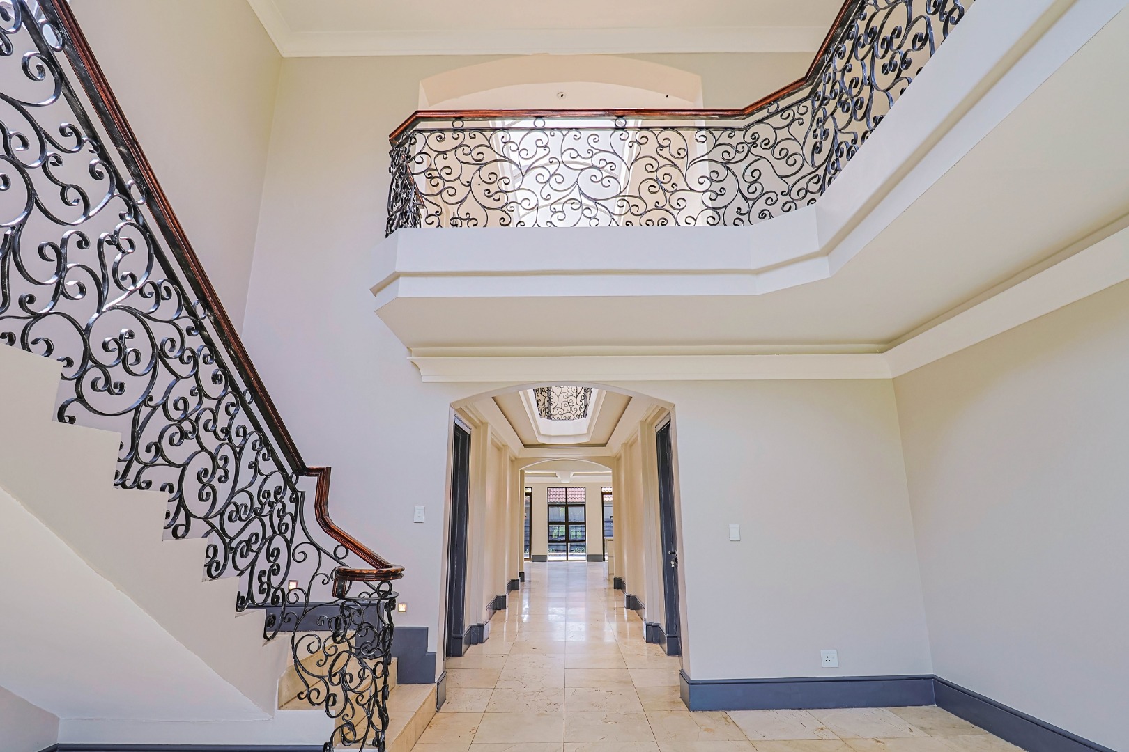 A welcoming entrance leads into the heart of the home, where a statement staircase with elegant wrought iron balustrades adds a touch of timeless sophistication and architectural charm.
