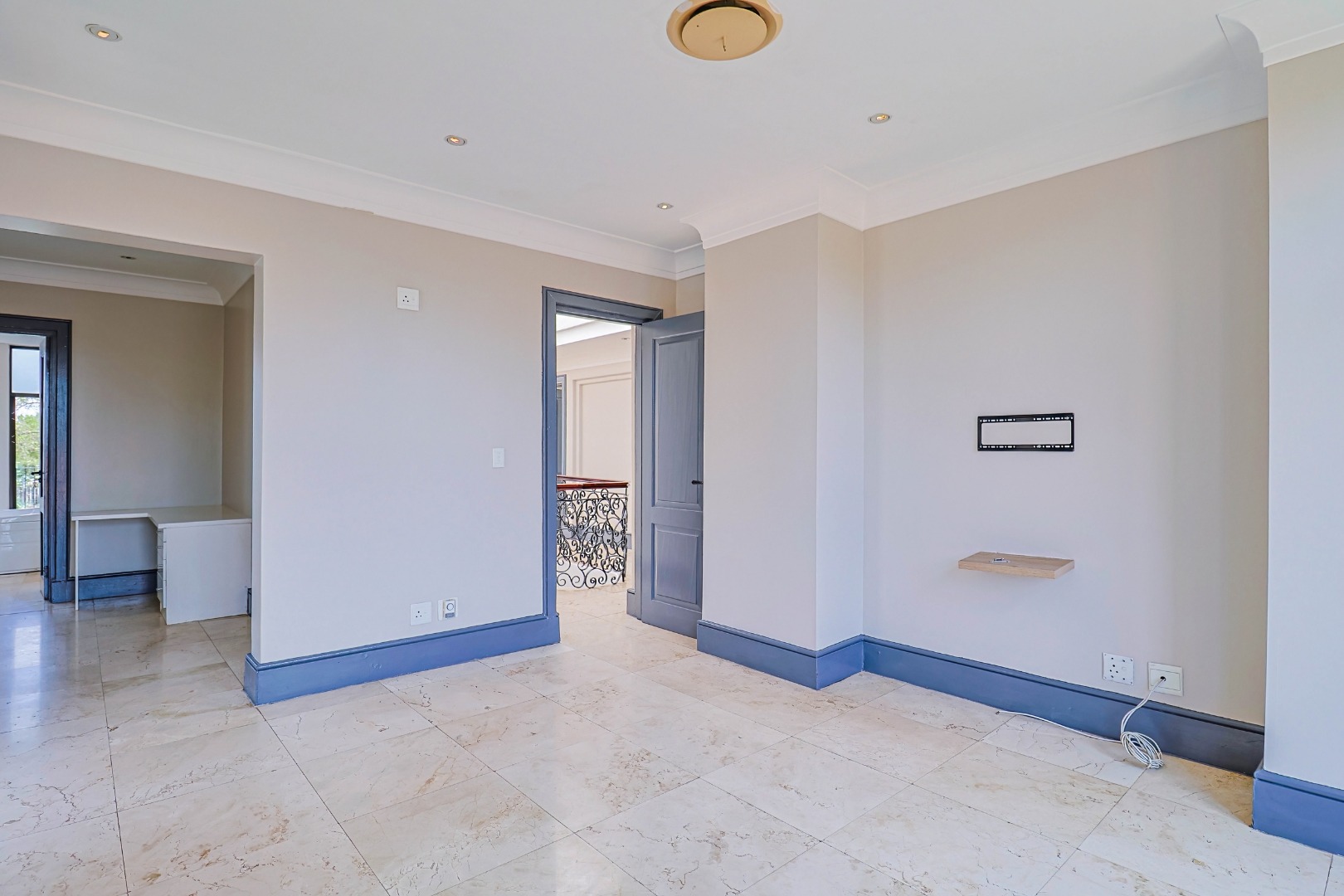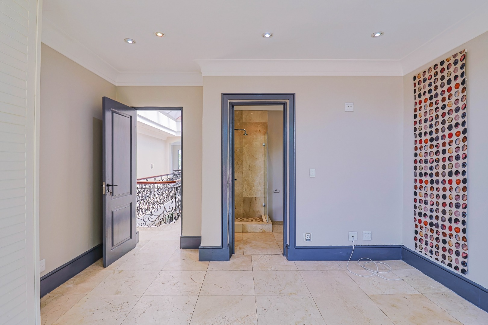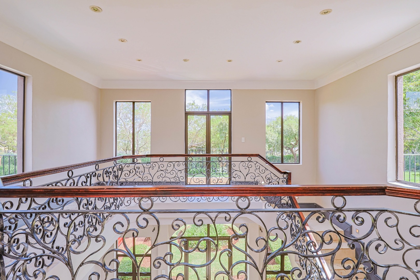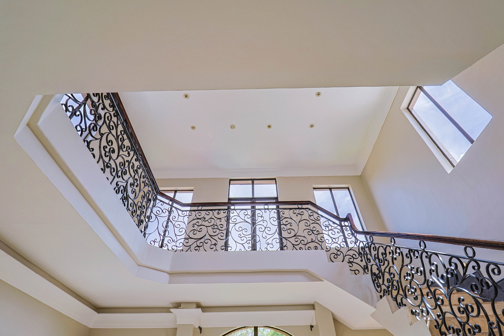 A welcoming entrance leads into the heart of the home, where a statement staircase with elegant wrought iron balustrades adds a touch of timeless sophistication and architectural charm.