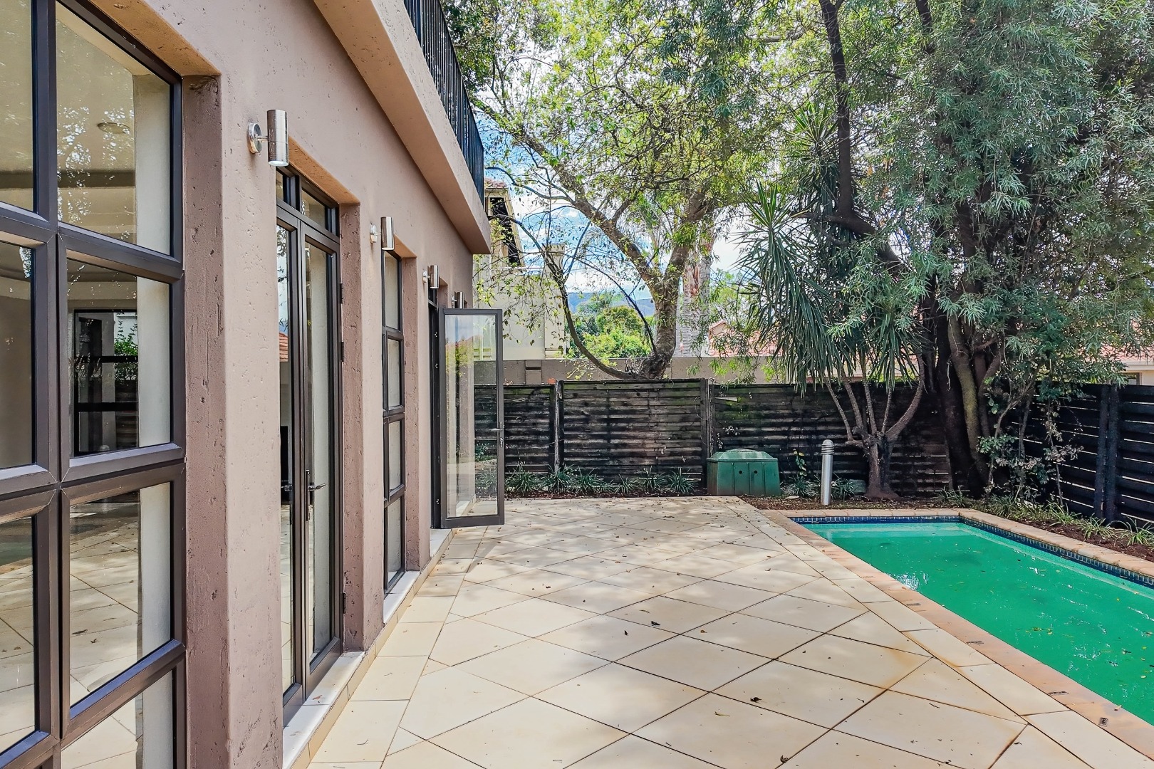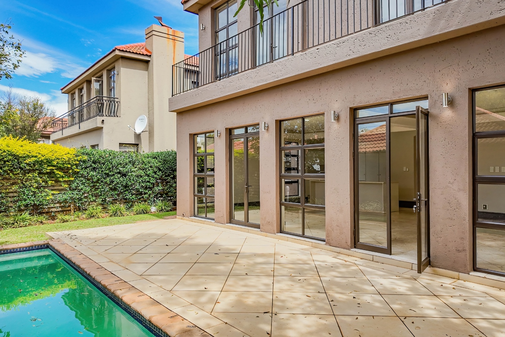The spacious open-plan layout features a lounge, dining area, and well-appointed kitchen, designed for both comfortable family living. A guest bedroom with en-suite bathroom is conveniently located on the lower level. Upstairs, three well-proportioned bedrooms offer comfortable accommodation, each enjoying its own en-suite bathroom. The luxurious main suite boasts a modern, open-plan en-suite bathroom and opens onto a private balcony, creating a serene and private retreat. Step outside to a refreshing swimming pool and private garden — perfect for relaxation and outdoor enjoyment. Parking is well catered for with two single garages on either side of the home, along with ample additional parking.