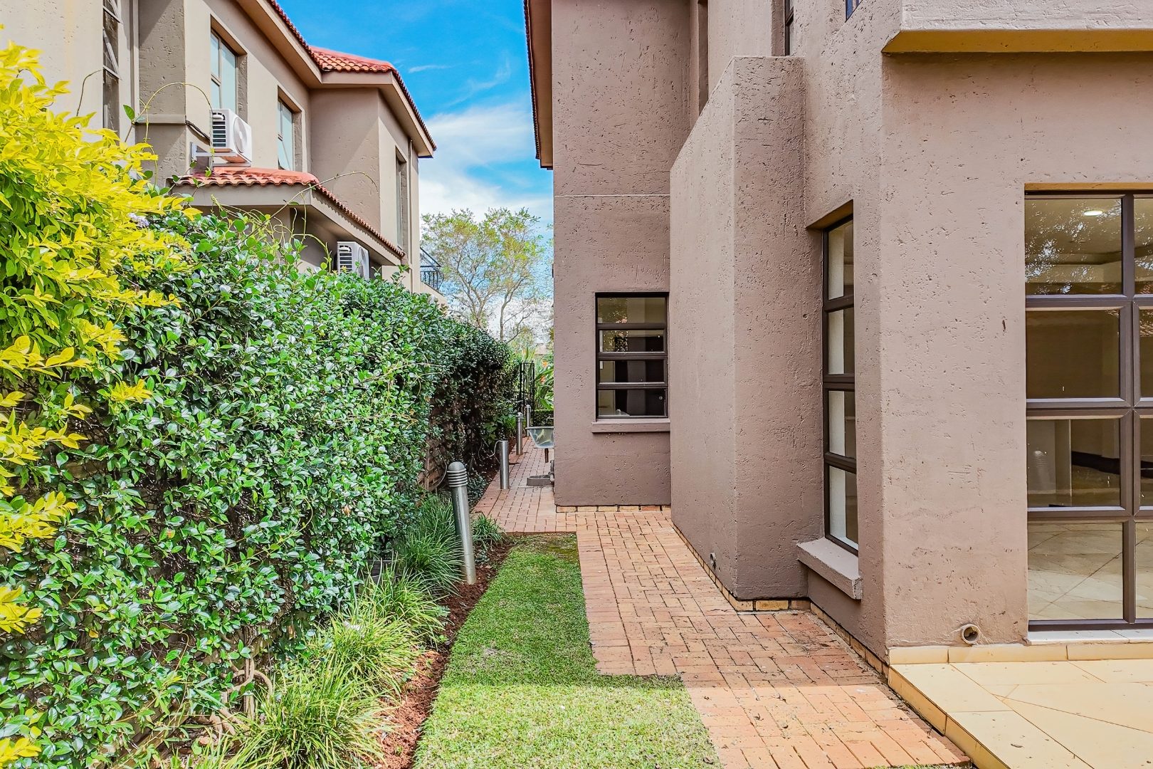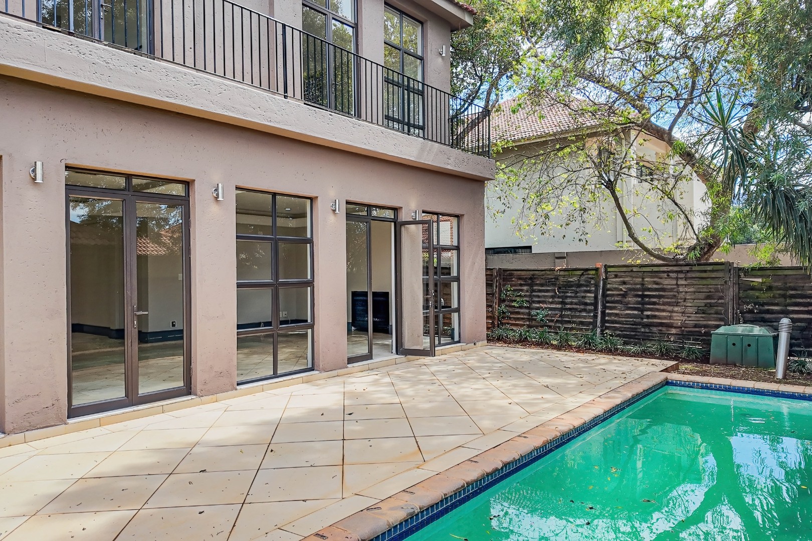 The spacious open-plan layout features a lounge, dining area, and well-appointed kitchen, designed for both comfortable family living. A guest bedroom with en-suite bathroom is conveniently located on the lower level. Upstairs, three well-proportioned bedrooms offer comfortable accommodation, each enjoying its own en-suite bathroom. The luxurious main suite boasts a modern, open-plan en-suite bathroom and opens onto a private balcony, creating a serene and private retreat. Step outside to a refreshing swimming pool and private garden — perfect for relaxation and outdoor enjoyment. Parking is well catered for with two single garages on either side of the home, along with ample additional parking.