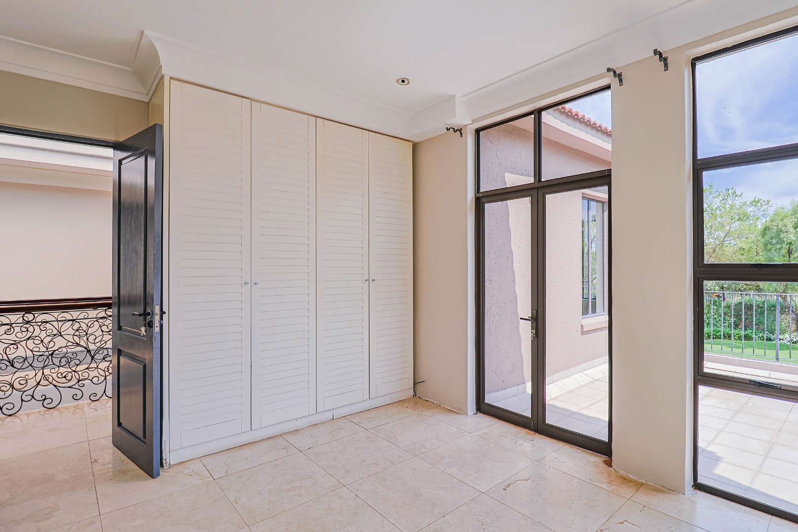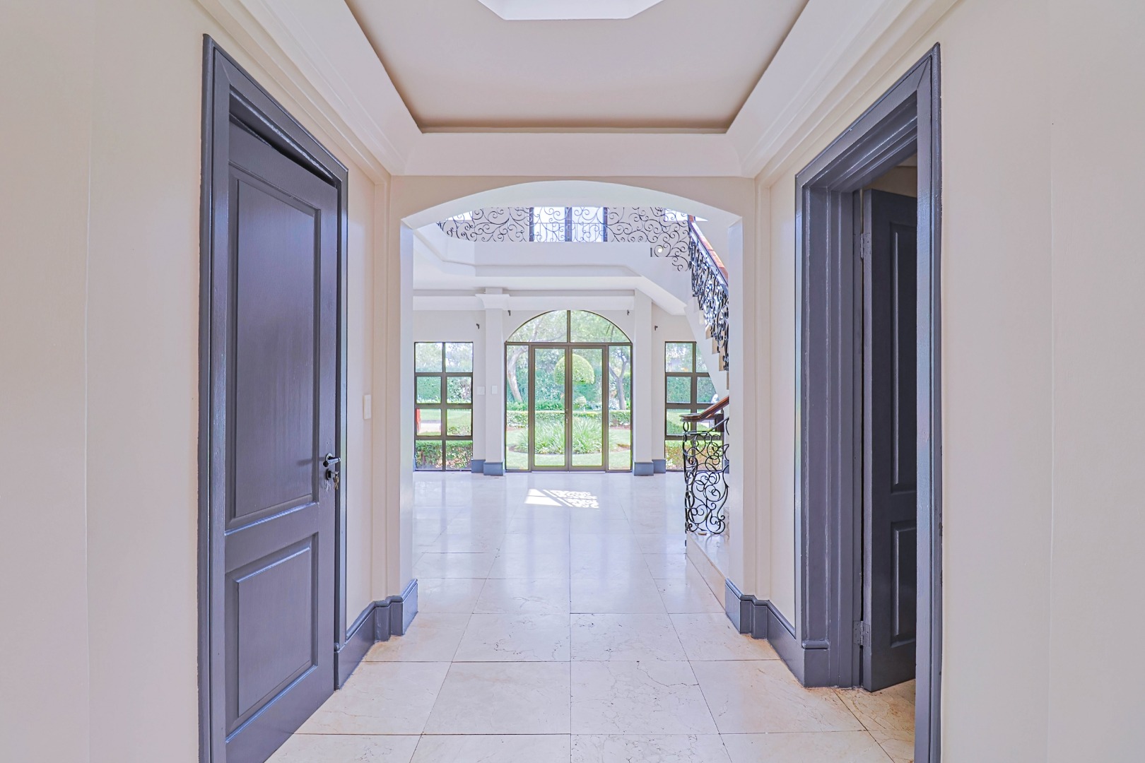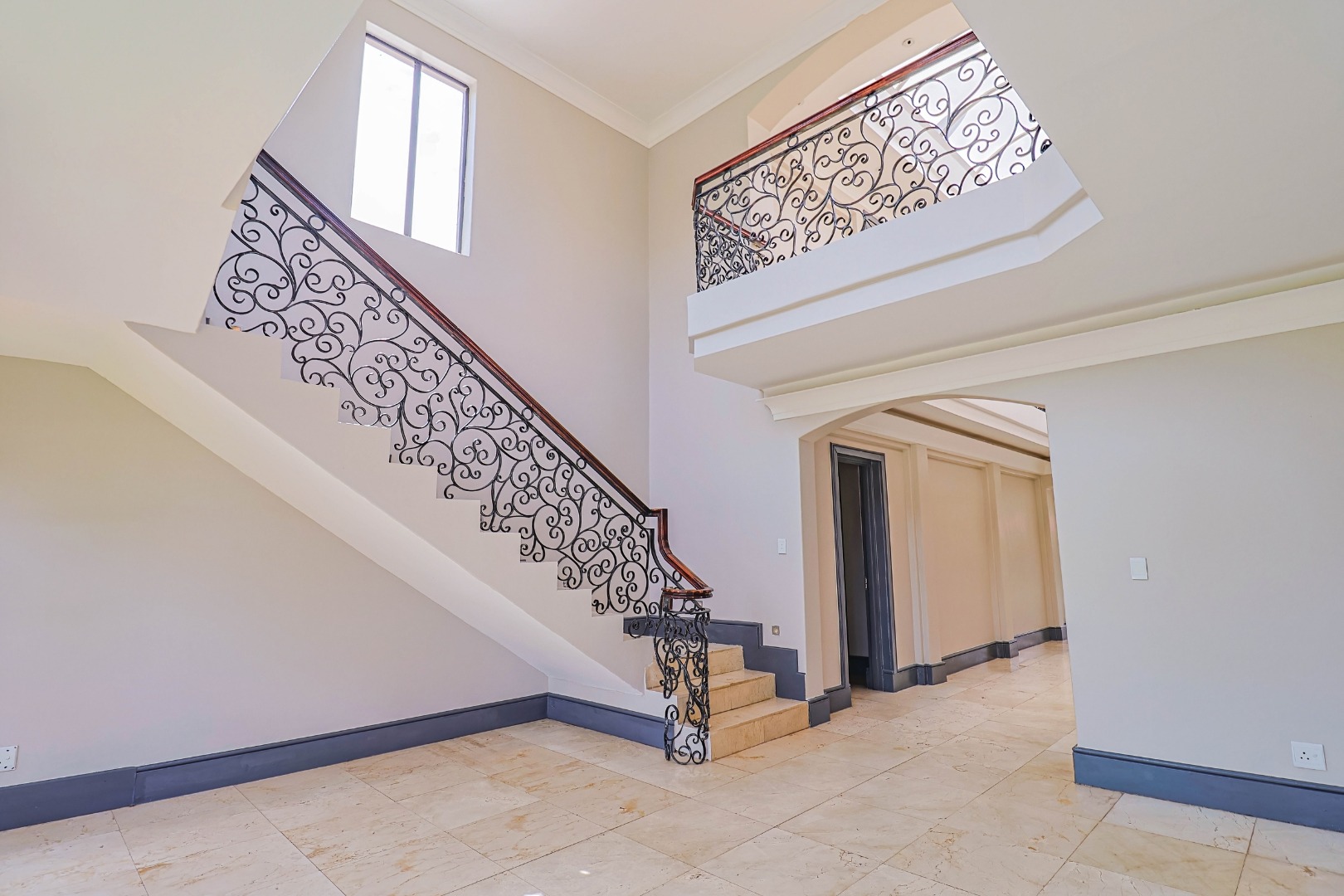 A welcoming entrance leads into the heart of the home, where a statement staircase with elegant wrought iron balustrades adds a touch of timeless sophistication and architectural charm.